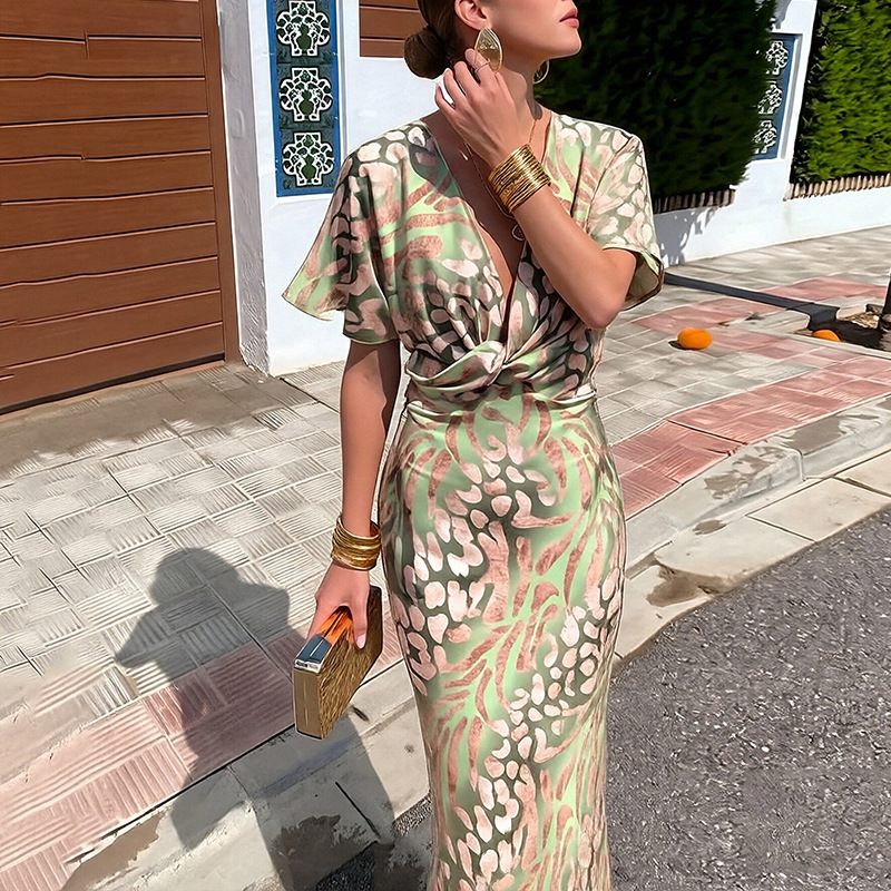 2024 여름 독립 역 여성 패션 타이트 프린트 트위스트 높은 허리 미니 원피스 섹시한 V-Neck 원피스