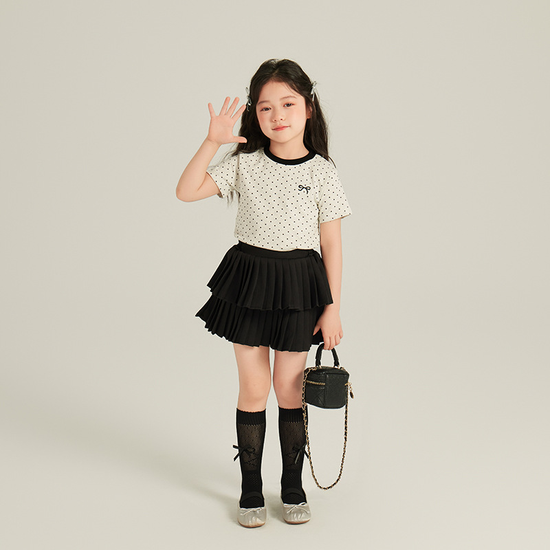 여자 스위트 뷰티 스타일 명암 컬러 웨이브 도트 반팔 티셔츠 2025 여름 어린이 조롱 나비 올매치 탑