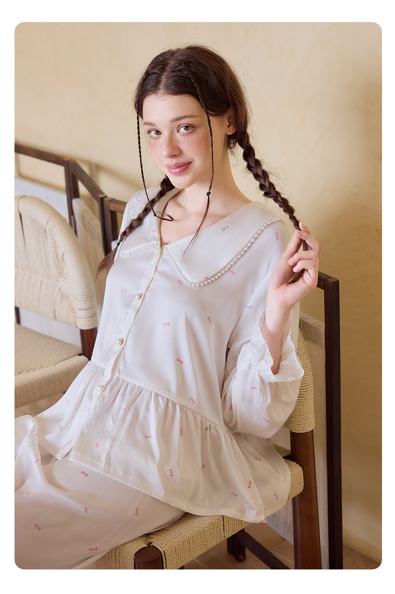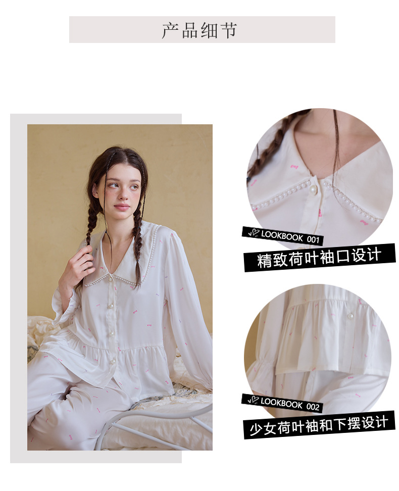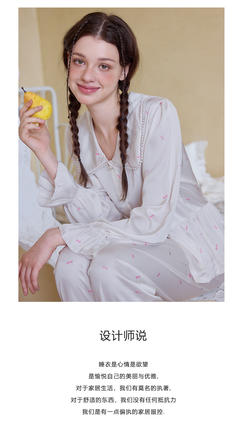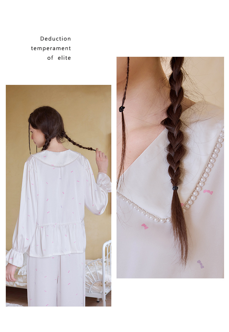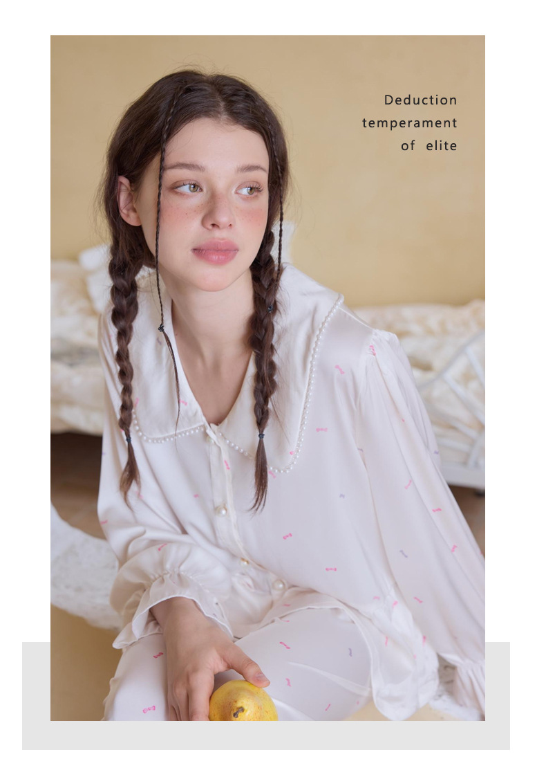 프렌치 스타일 진주 칼라 러플 아이스 실크 여성 홈웨어 고급 잠옷 세트 실크 느낌