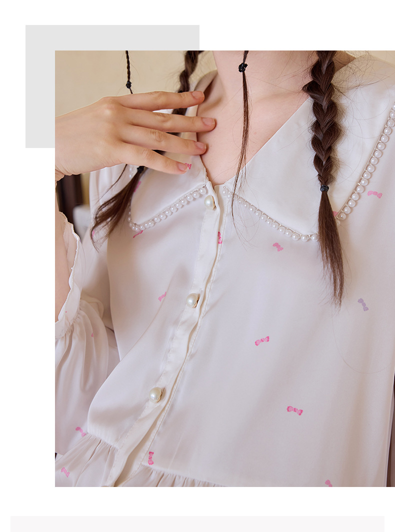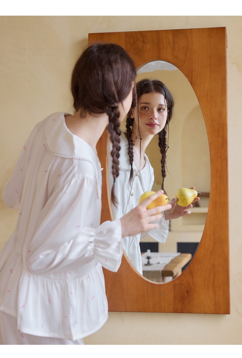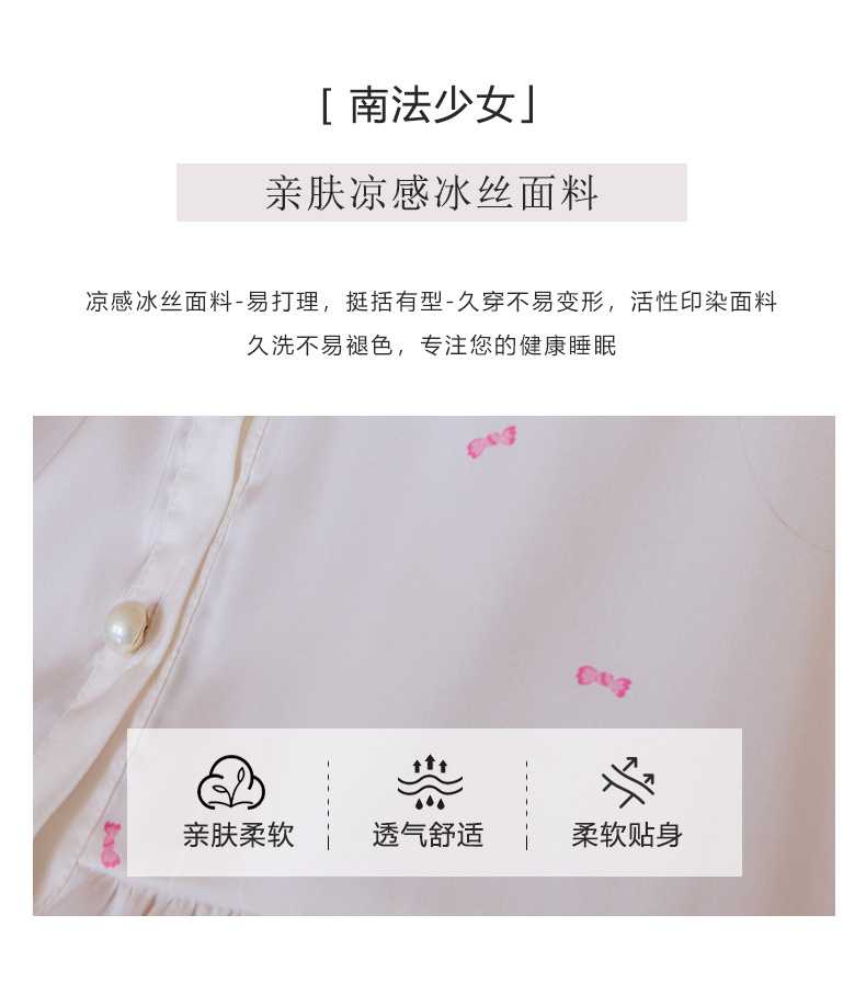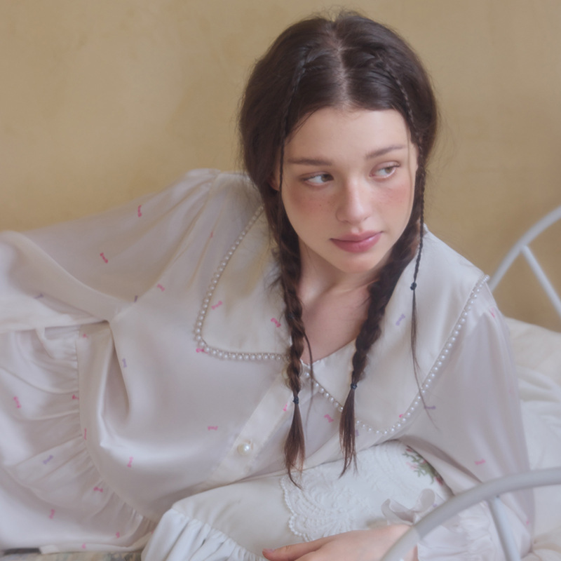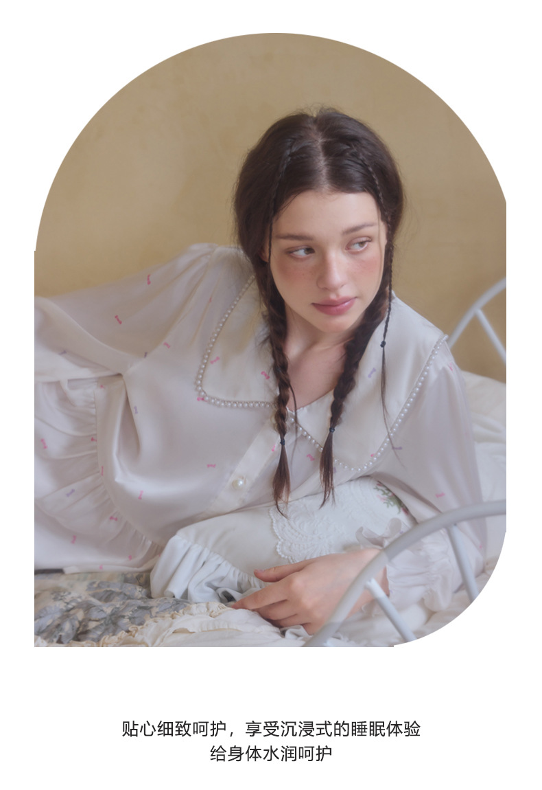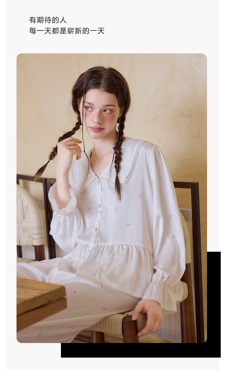 프렌치 스타일 진주 칼라 러플 아이스 실크 여성 홈웨어 고급 잠옷 세트 실크 느낌