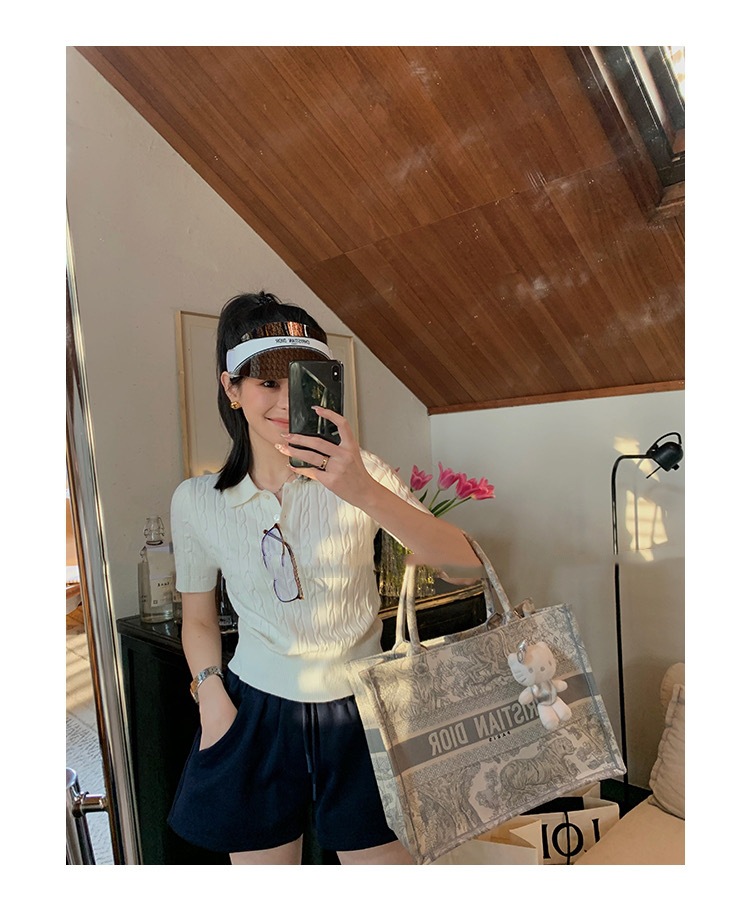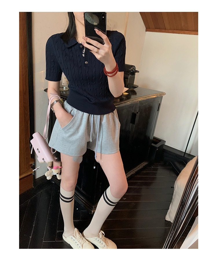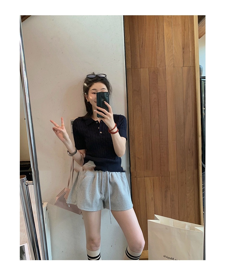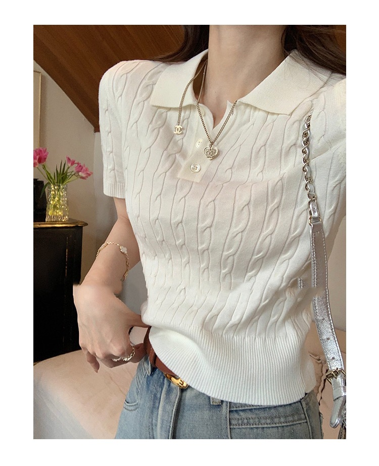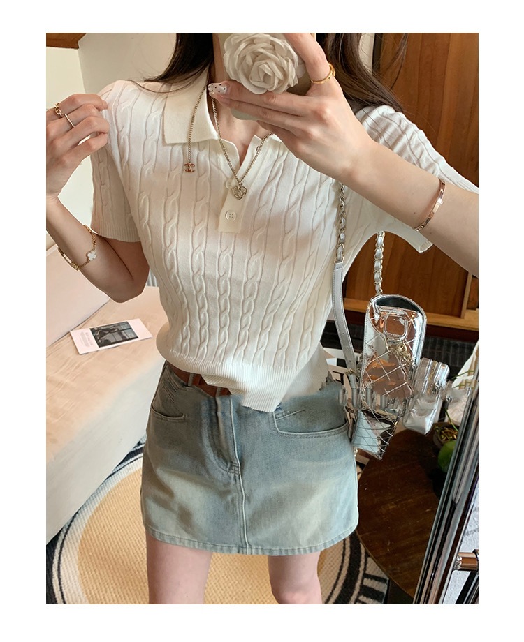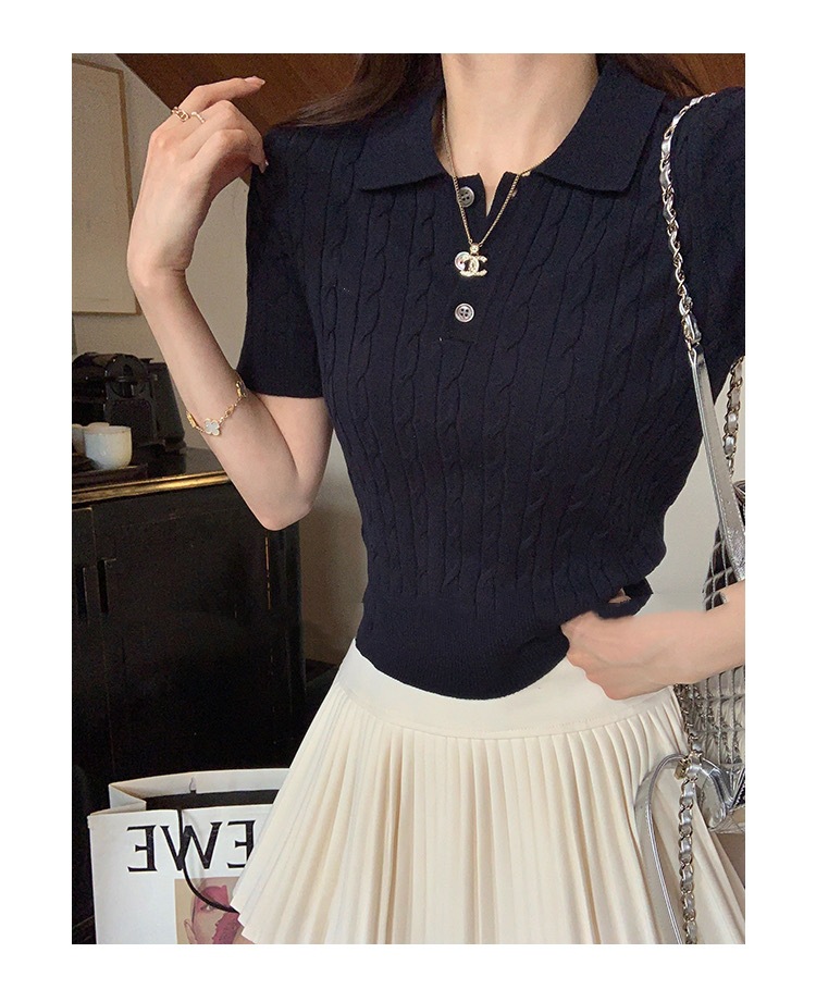 프랑스 레트로 트위스트 스웨터 반팔 최고 여성 여름 새로운 폴로 칼라 세련된 아름다운 작은 셔츠 티셔츠스토어 가기