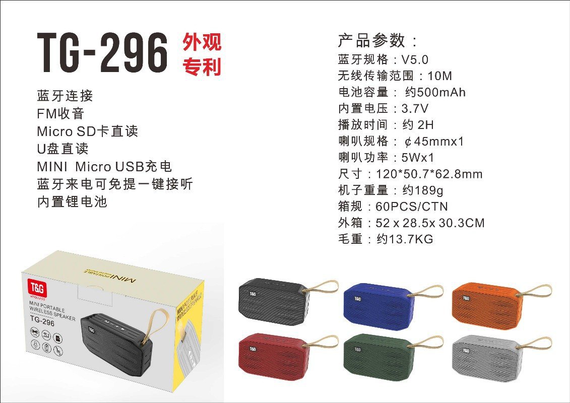 防水蓝牙音箱双振膜户外便携蓝牙插卡音响TG296迷你运动低音炮,澎湃双低音,采用45MM双外部无源辐射器展现出扬声器内在的澎湃动力,聆听,感受并见证低音,无惧雨水浸袭,音乐通话,一键切换。