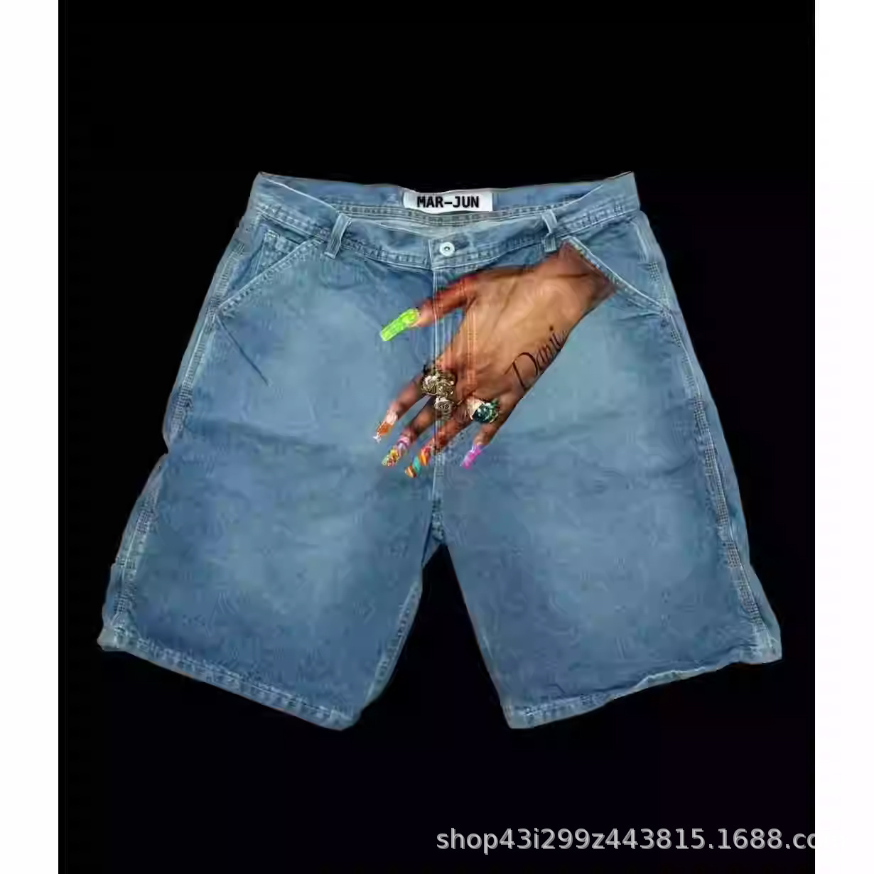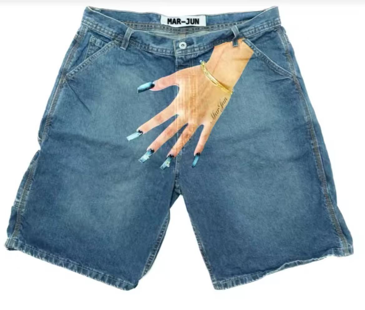 국경 간 유럽과 미국의 Y2K 힙합 유행 패턴 인쇄 데님 반바지 남성 하이 스트리트 트렌디 브랜드 커플의 캐주얼 바지스토어 가기
