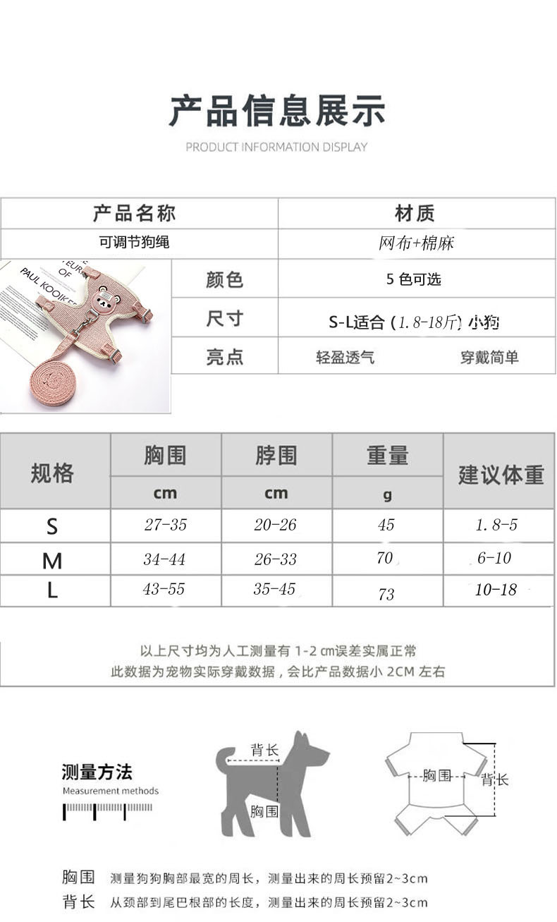 조끼 개 Leash Puppy Teddy Chest 스트랩 고양이 끈을 끊는 것을 방지하기 위해 나가는 고양이 Leash 고양이 체인 개 체인스토어 가기