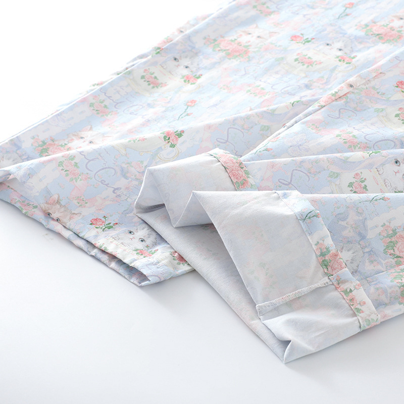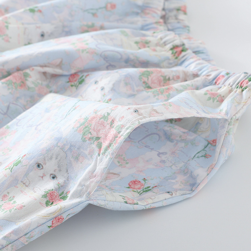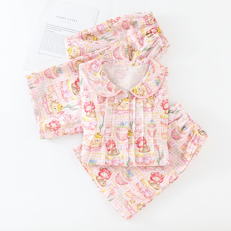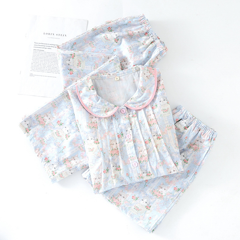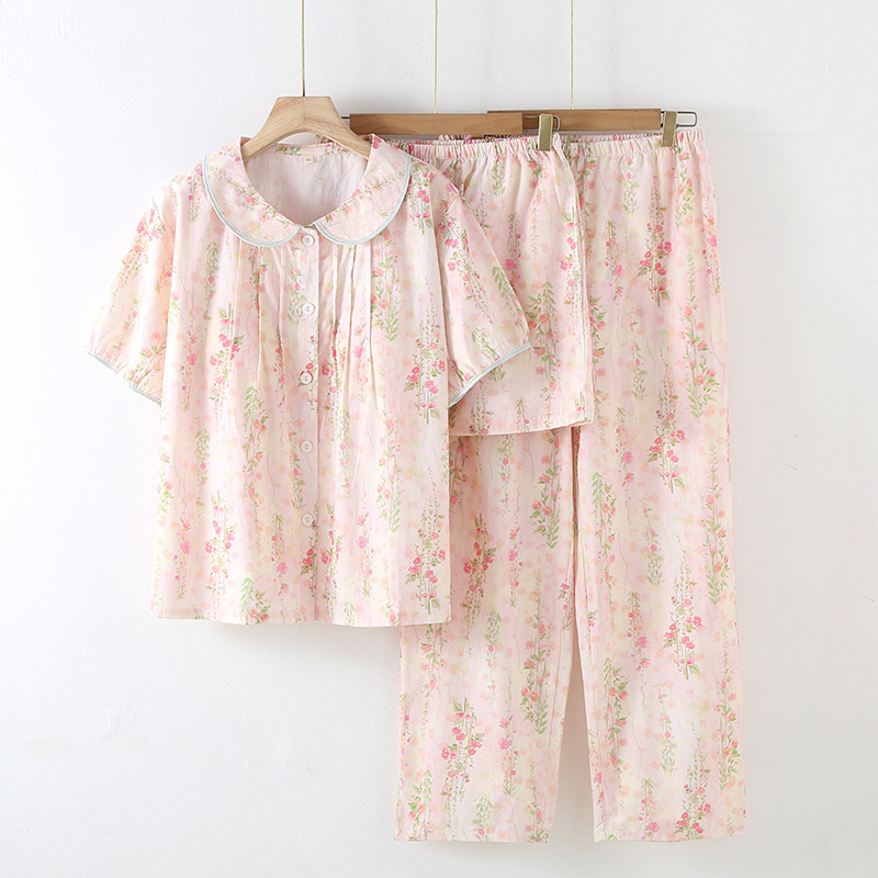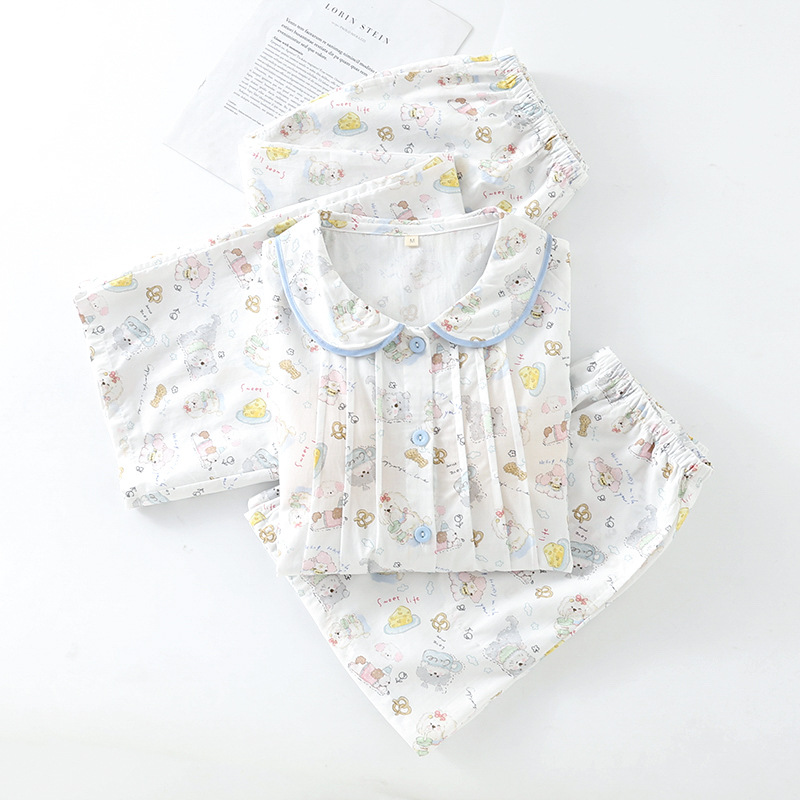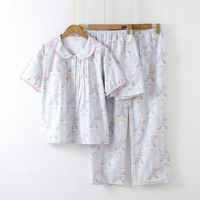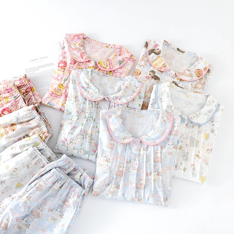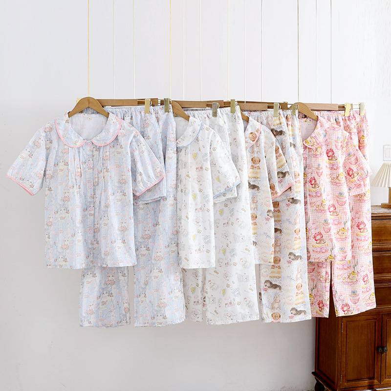 봄과 가을 면화 여성용 잠옷 여름 얇은 신선한 달콤한 소녀 옆집 세트 반팔 바지 3 종 세트스토어 가기