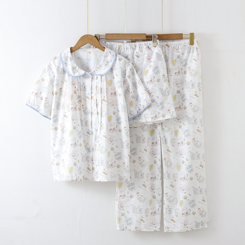 봄과 가을 면화 여성용 잠옷 여름 얇은 신선한 달콤한 소녀 옆집 세트 반팔 바지 3 종 세트