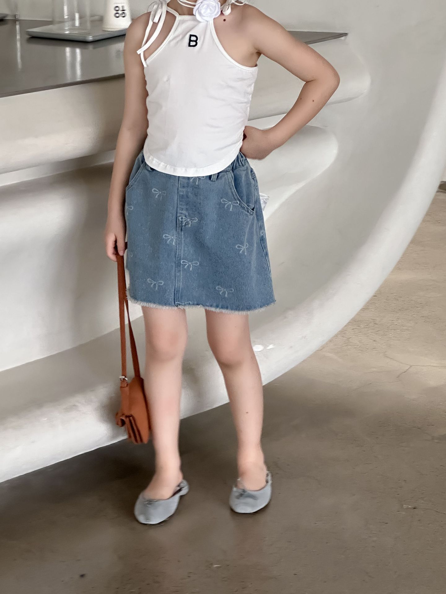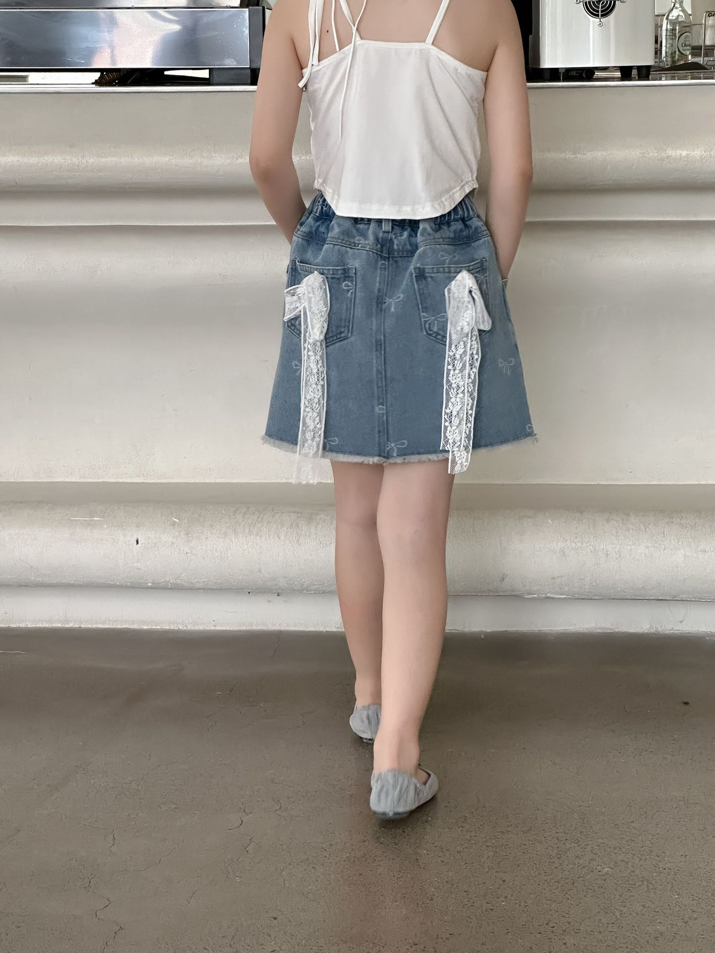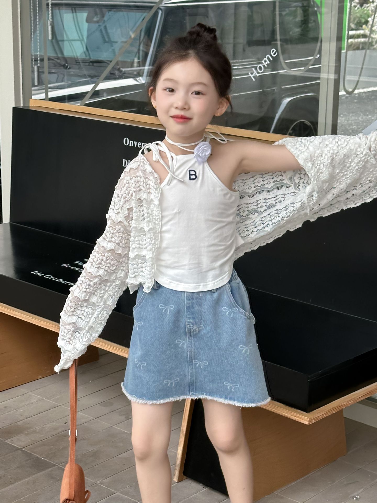 한국 스타일 아동복 2024 여름 소녀 활 짧은 치마 큰 소녀의 레이스 데님 스커트 달콤한 치마스토어 가기