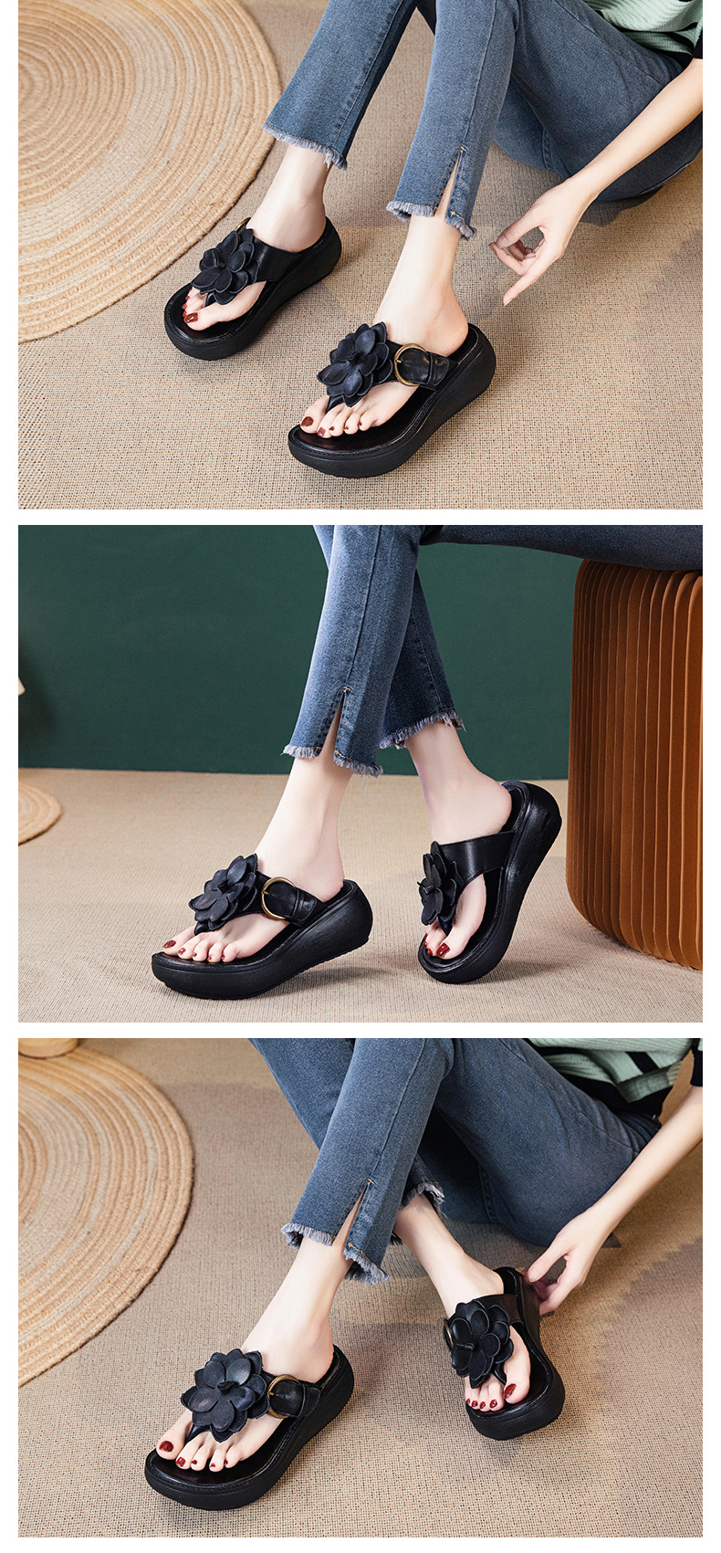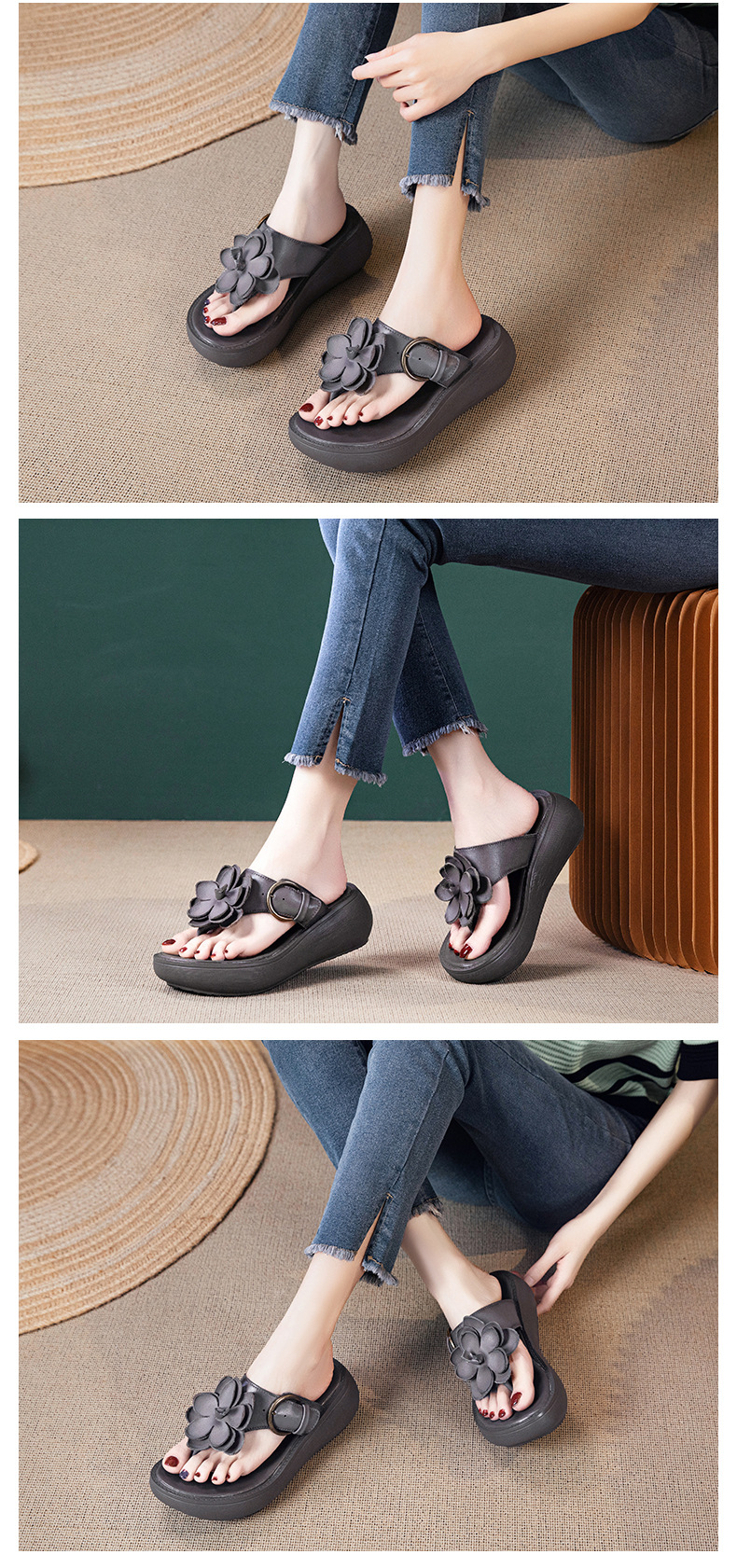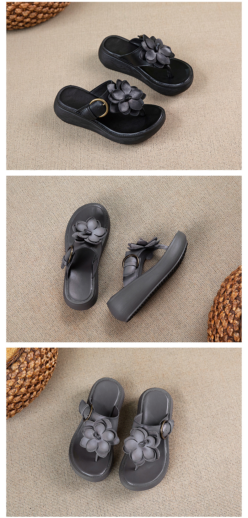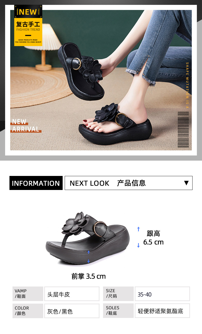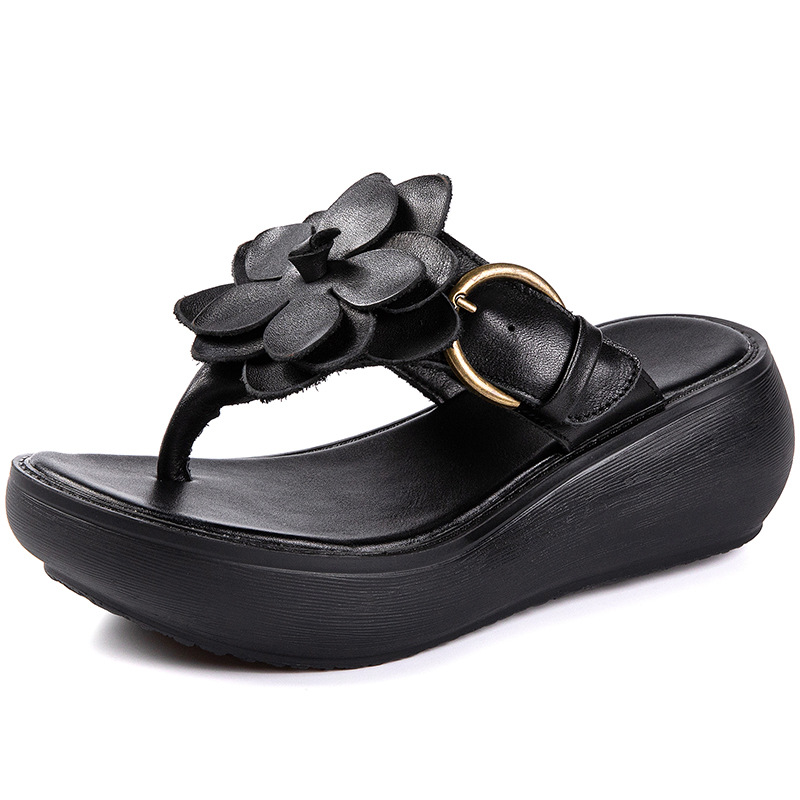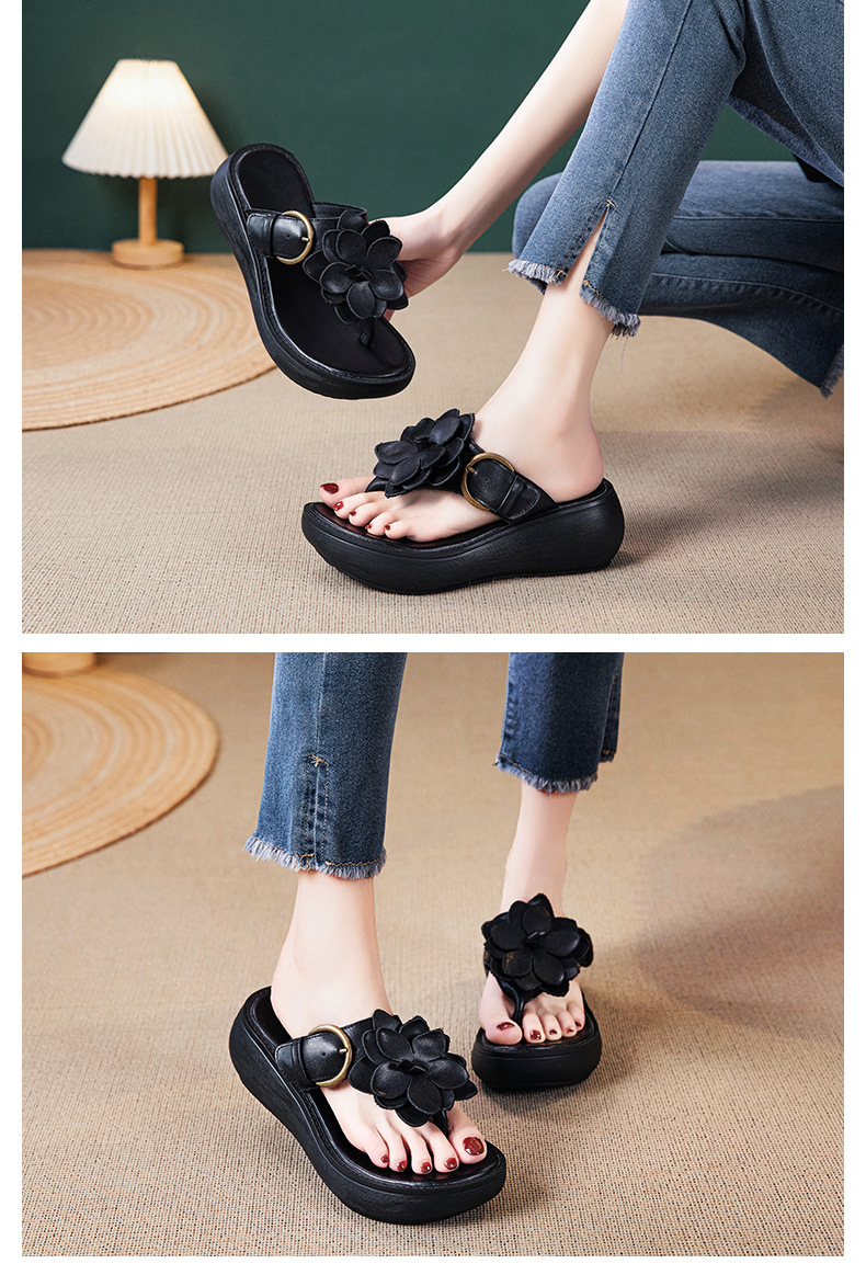 꽃 플립 플롭 여성 패션 여름 새로운 의상 캐주얼 웨지 샌들 가죽 두꺼운 바닥 플립 플롭 증가스토어 가기