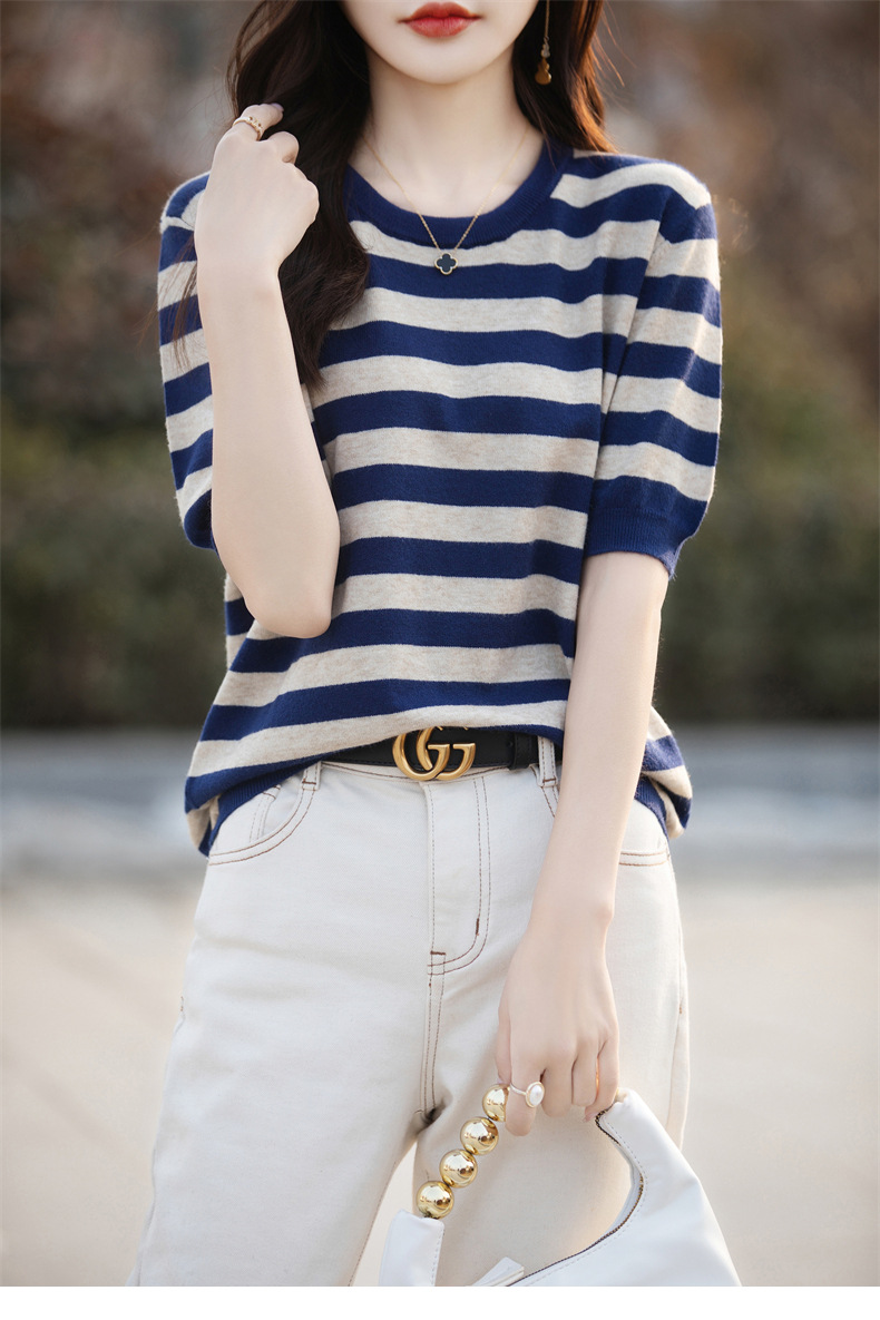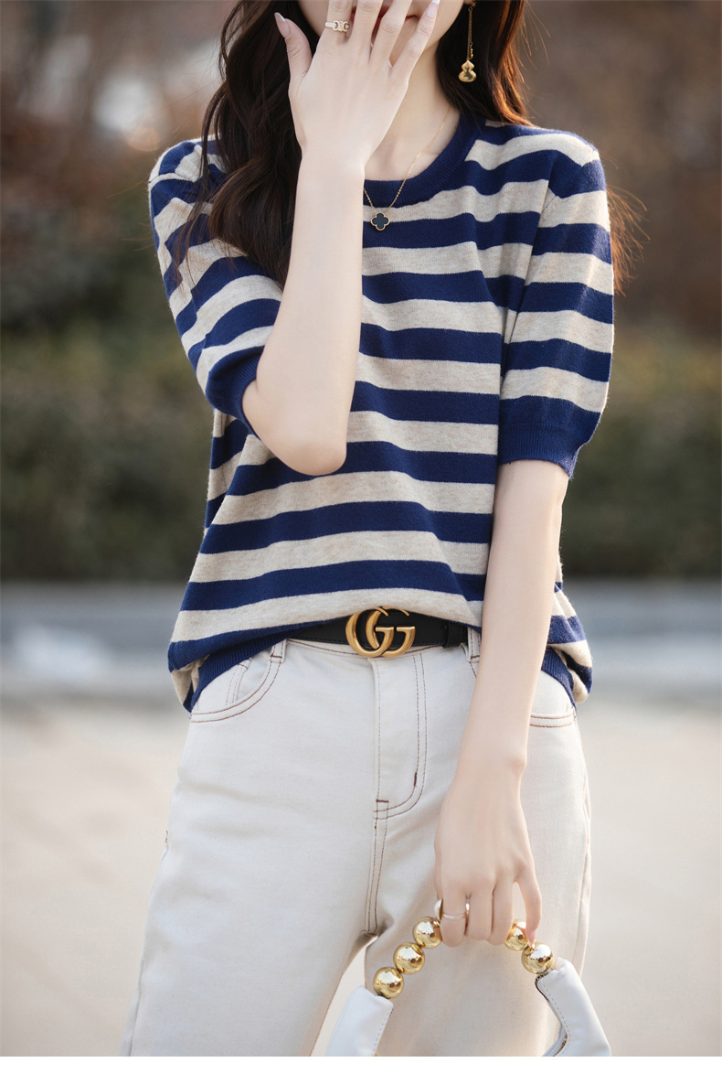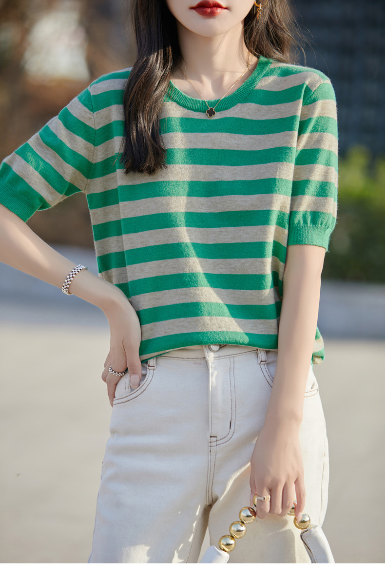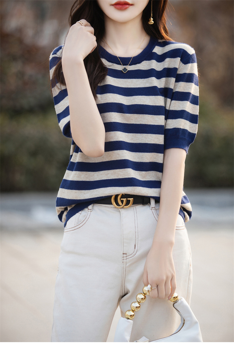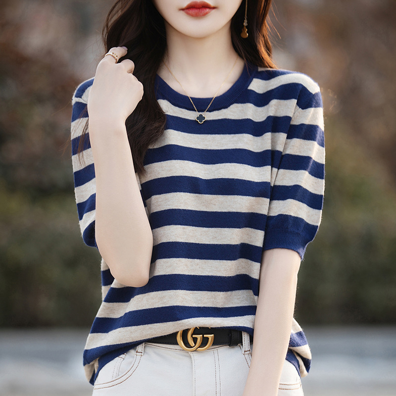 도매 2024 여름 새로운 여성 스웨터 앤디 벨벳 짧은 소매 여성용 스웨터 여성용 둥근 목 줄무늬 바닥 스웨터스토어 가기