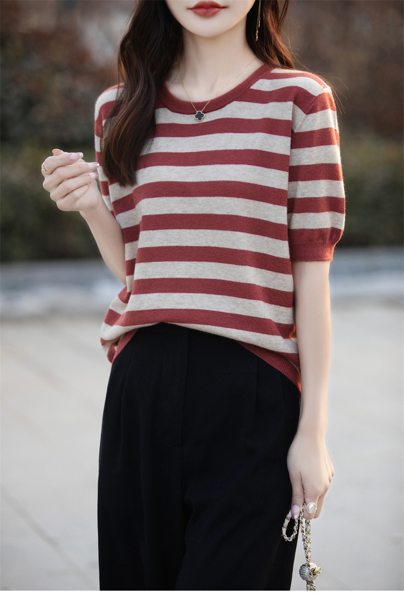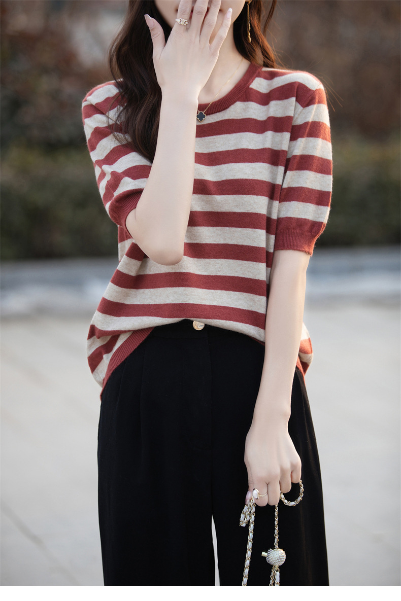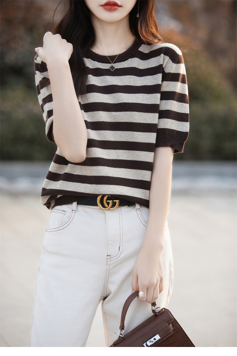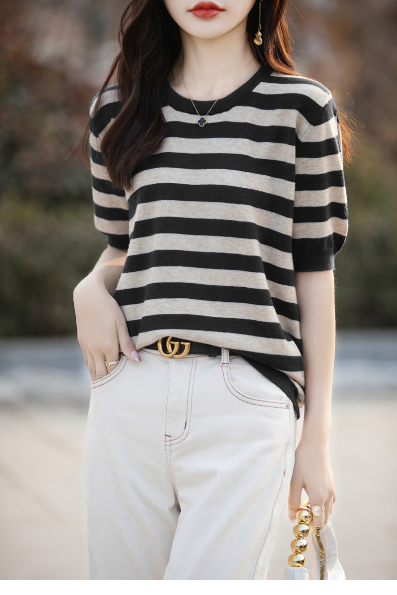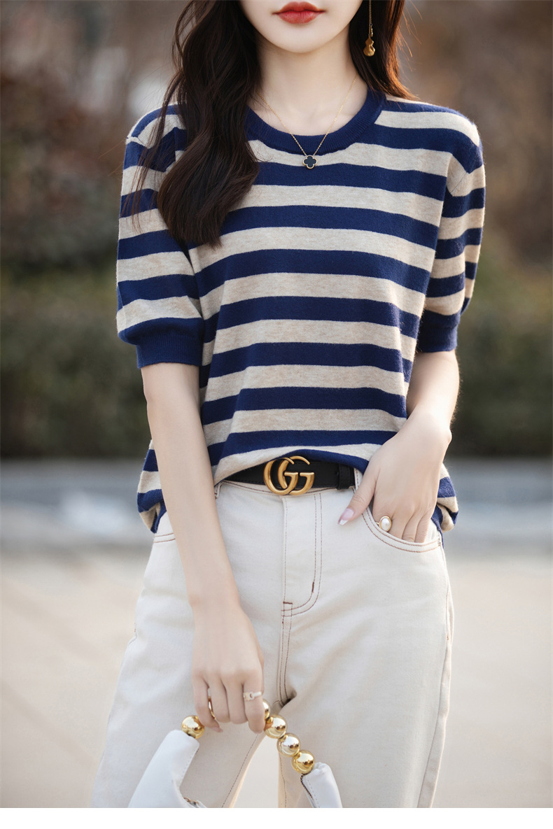 도매 2024 여름 새로운 여성 스웨터 앤디 벨벳 짧은 소매 여성용 스웨터 여성용 둥근 목 줄무늬 바닥 스웨터스토어 가기