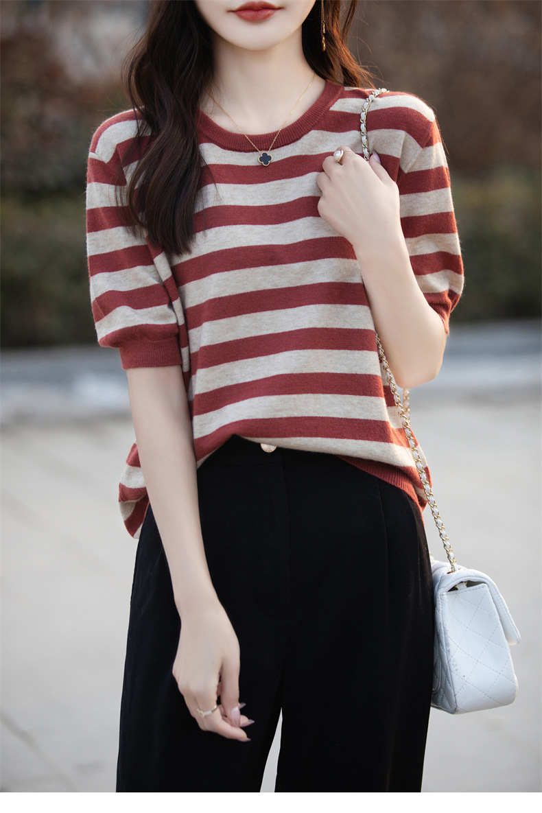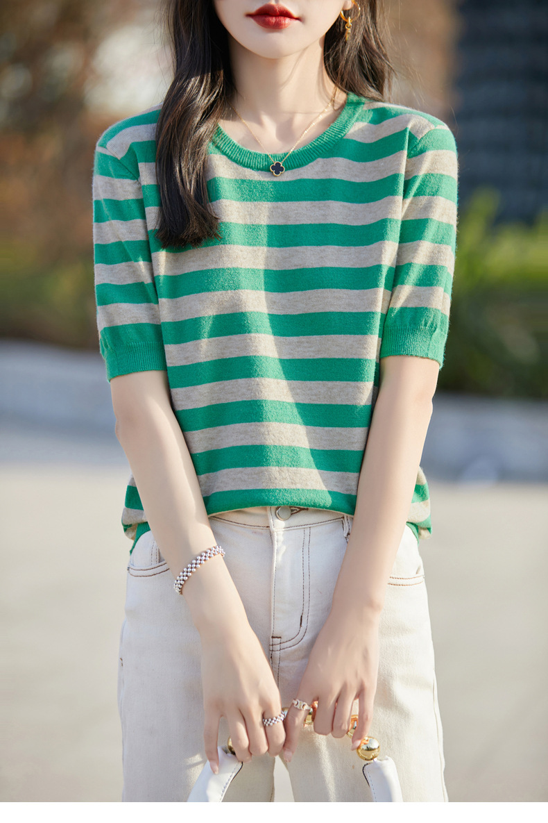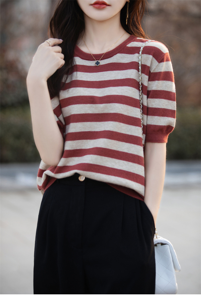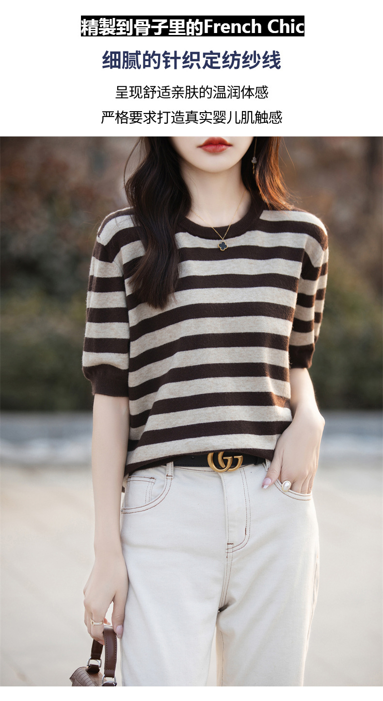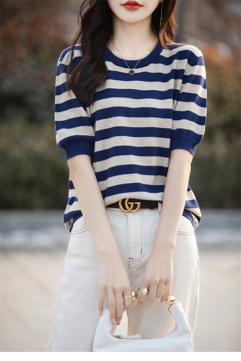 도매 2024 여름 새로운 여성 스웨터 앤디 벨벳 짧은 소매 여성용 스웨터 여성용 둥근 목 줄무늬 바닥 스웨터스토어 가기
