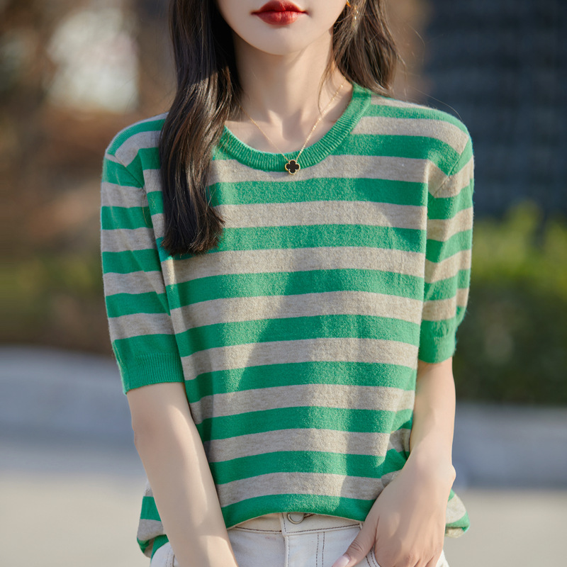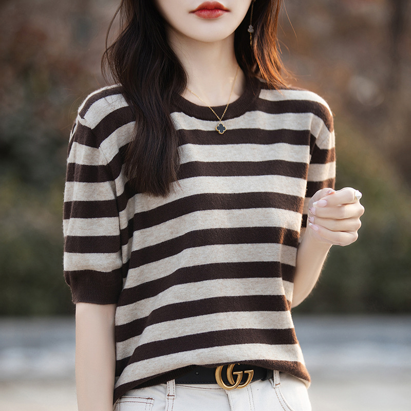 도매 2024 여름 새로운 여성 스웨터 앤디 벨벳 짧은 소매 여성용 스웨터 여성용 둥근 목 줄무늬 바닥 스웨터