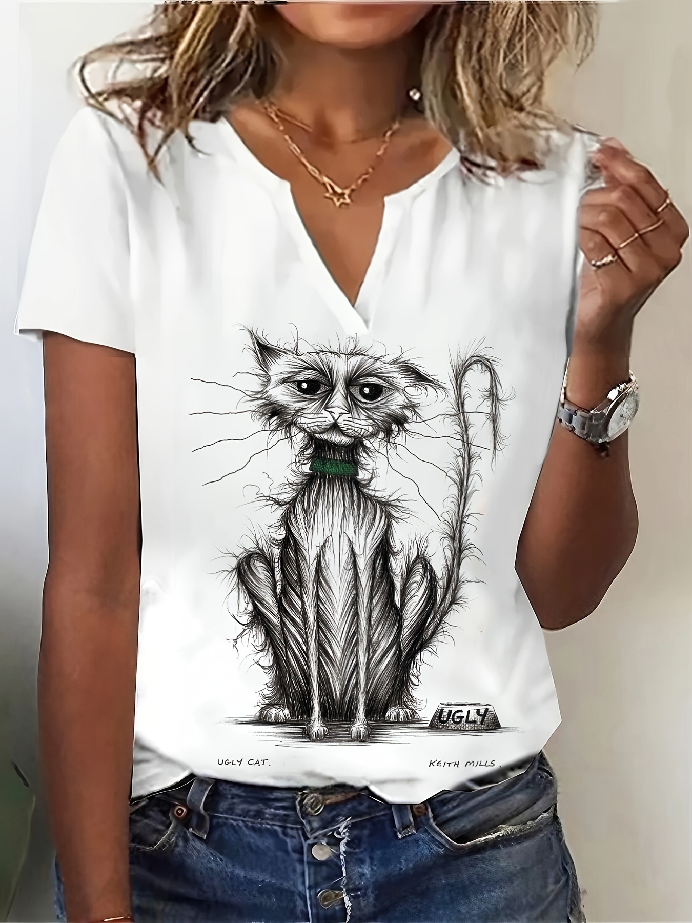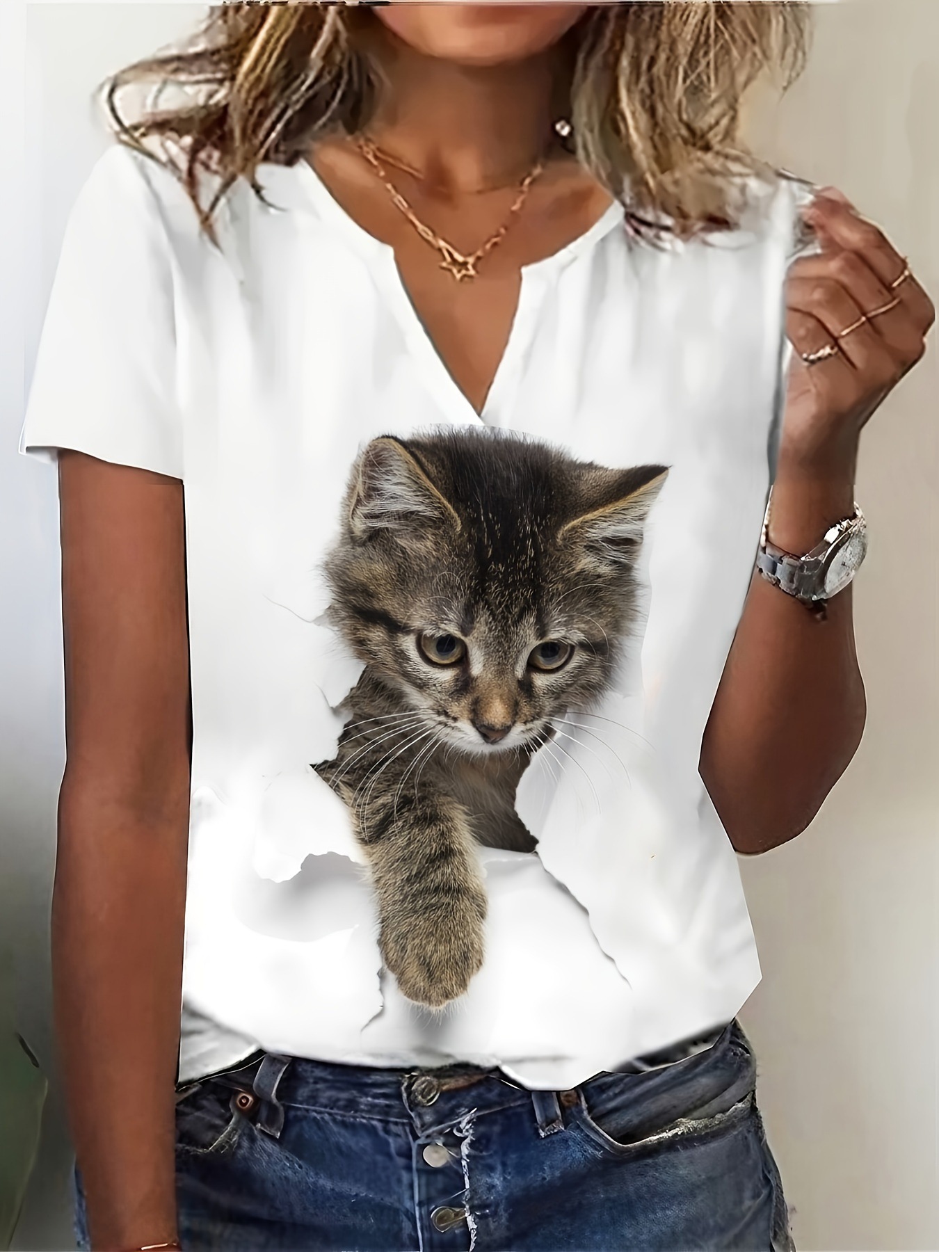 2024 여름 여성의 짧은 소매 티셔츠 패션 독립 기념일 국기 고양이 인쇄 짧은 소매 최고 캐주얼 여성 의류