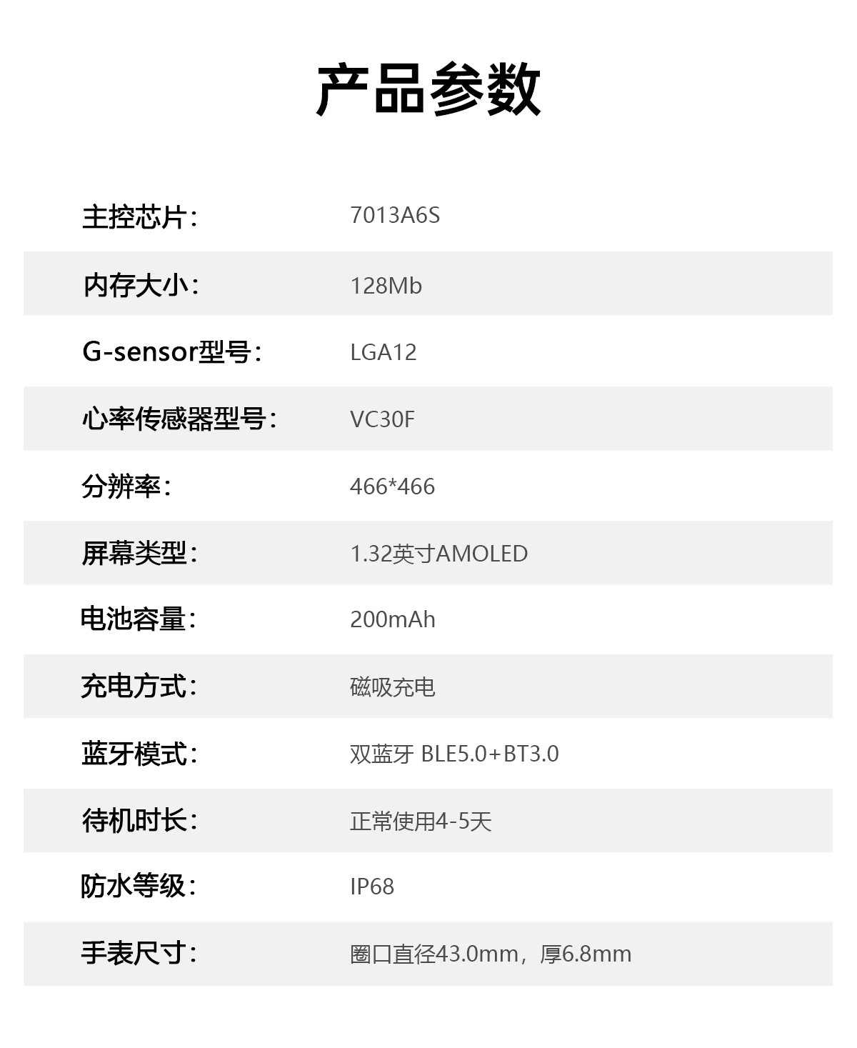 | 显示屏规格: | AMOLED 1.32英寸屏 , 分辨率466*466 |