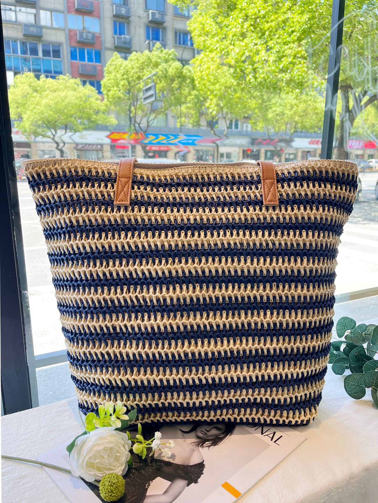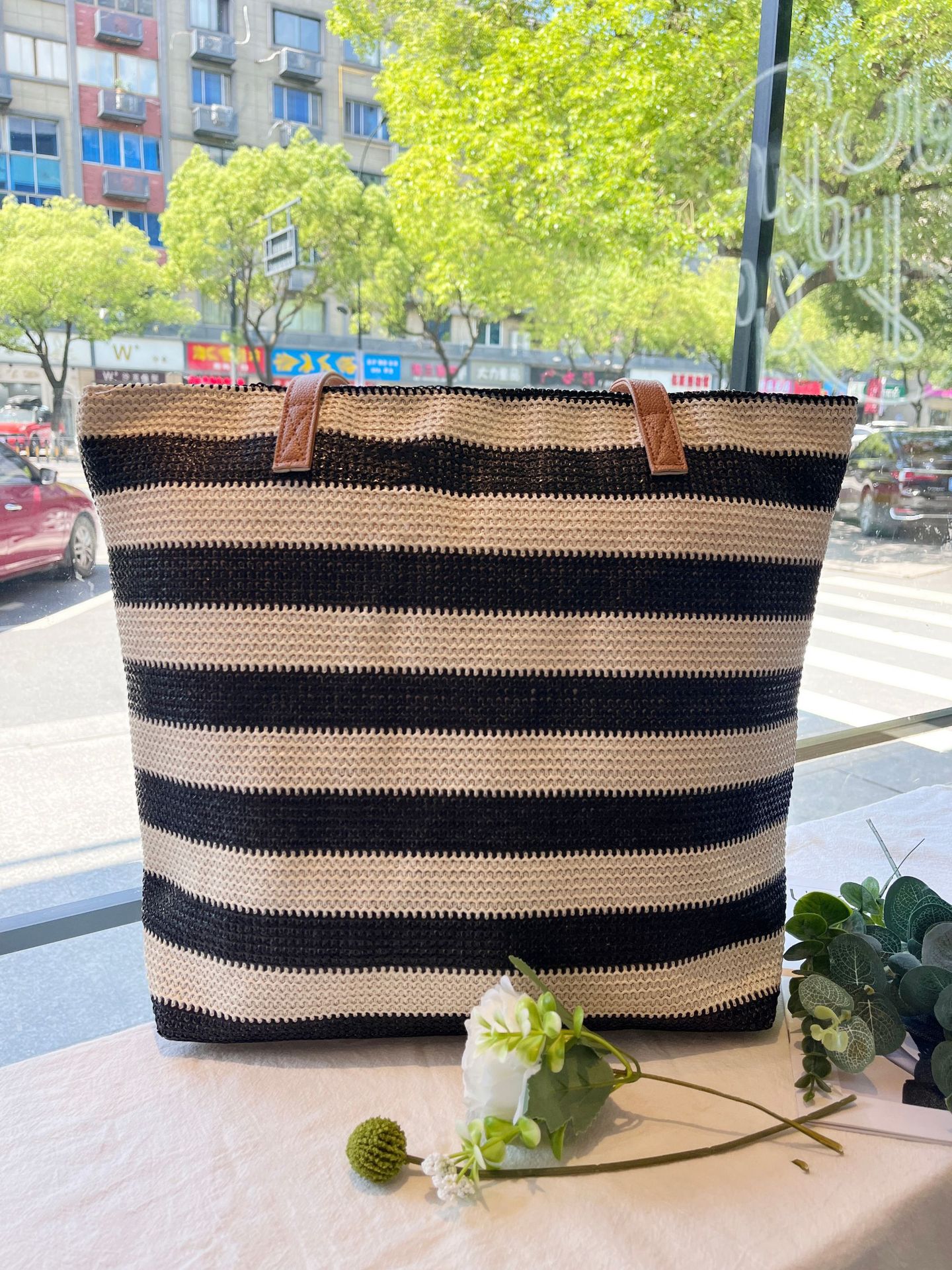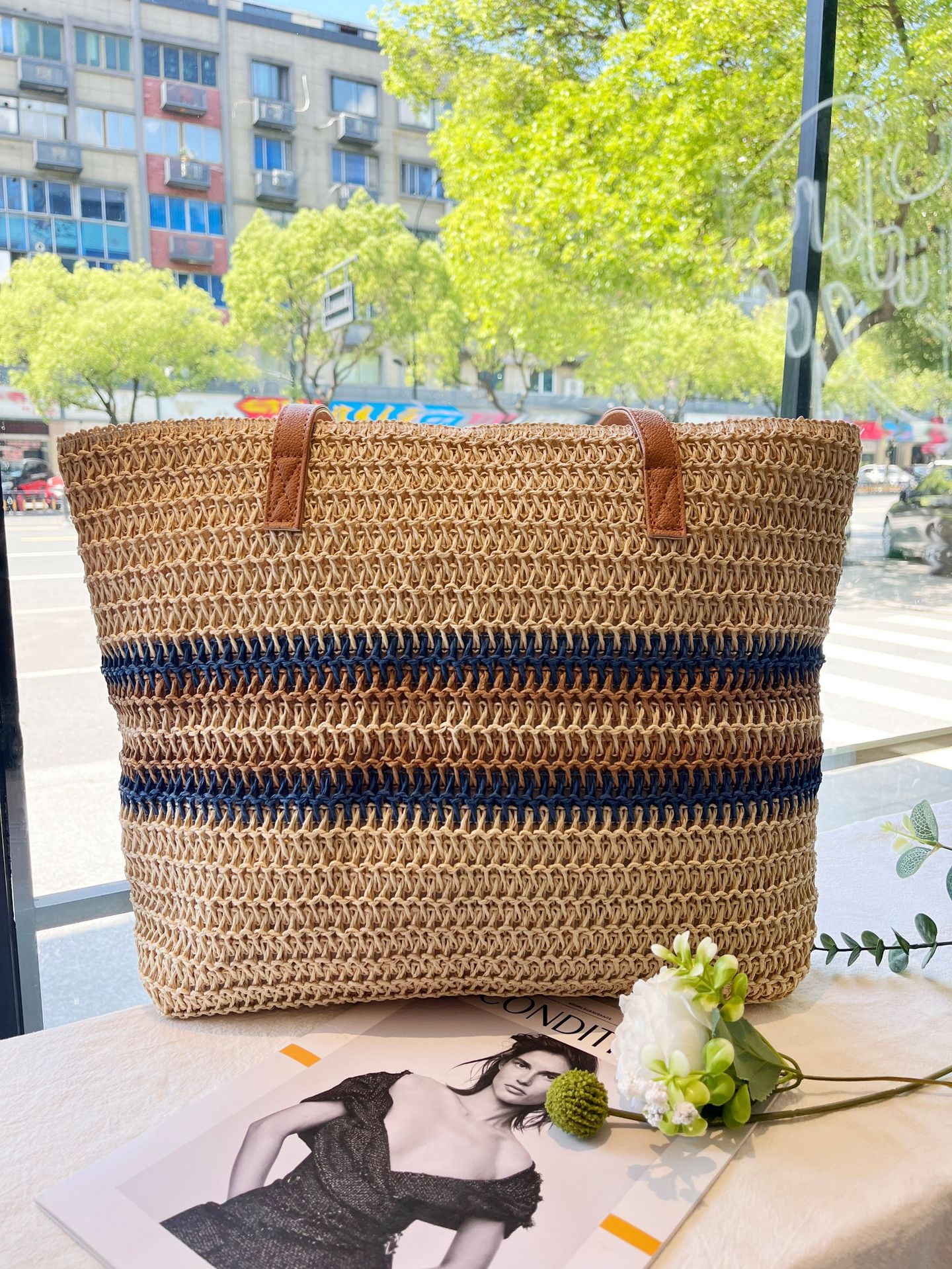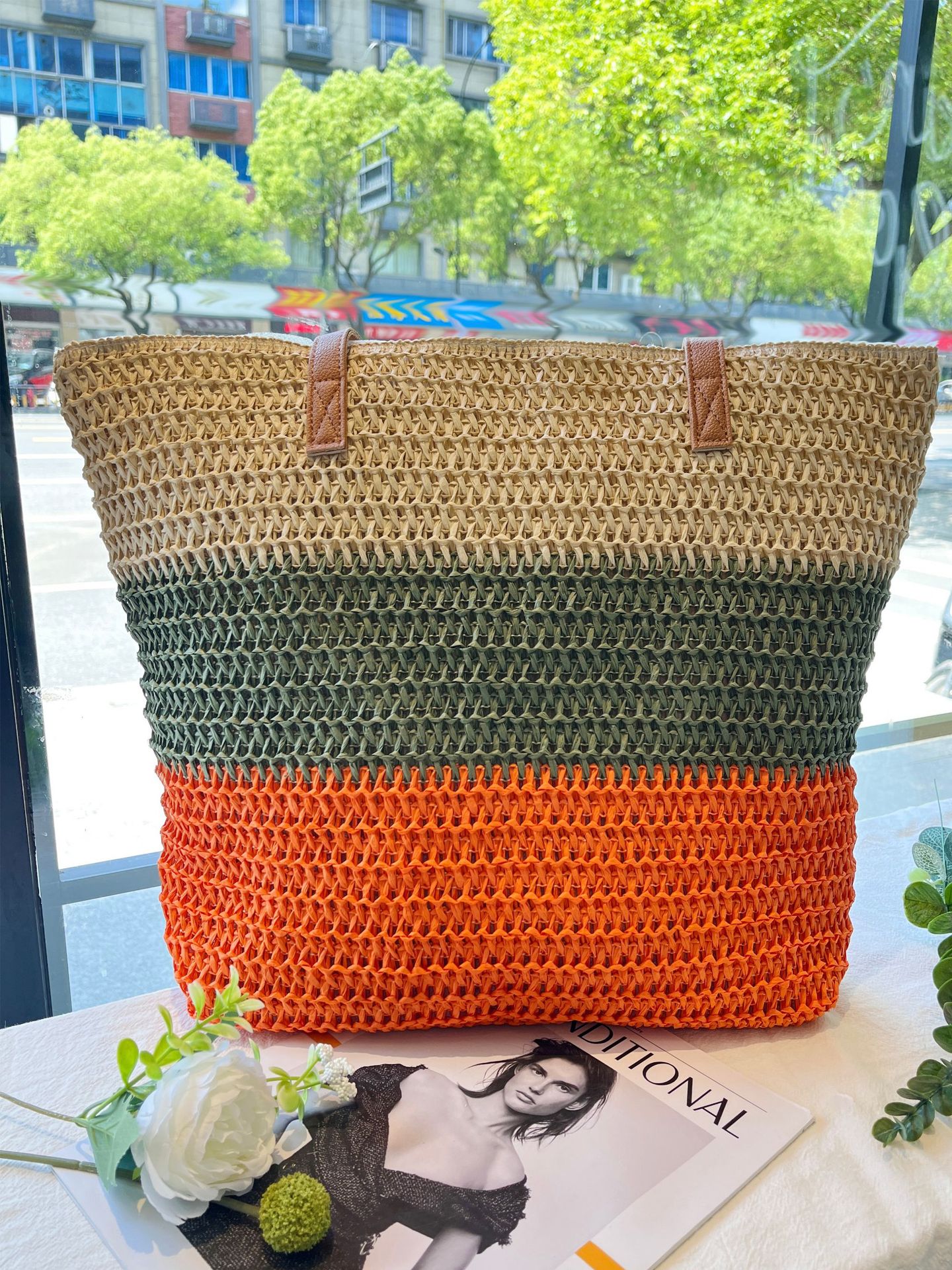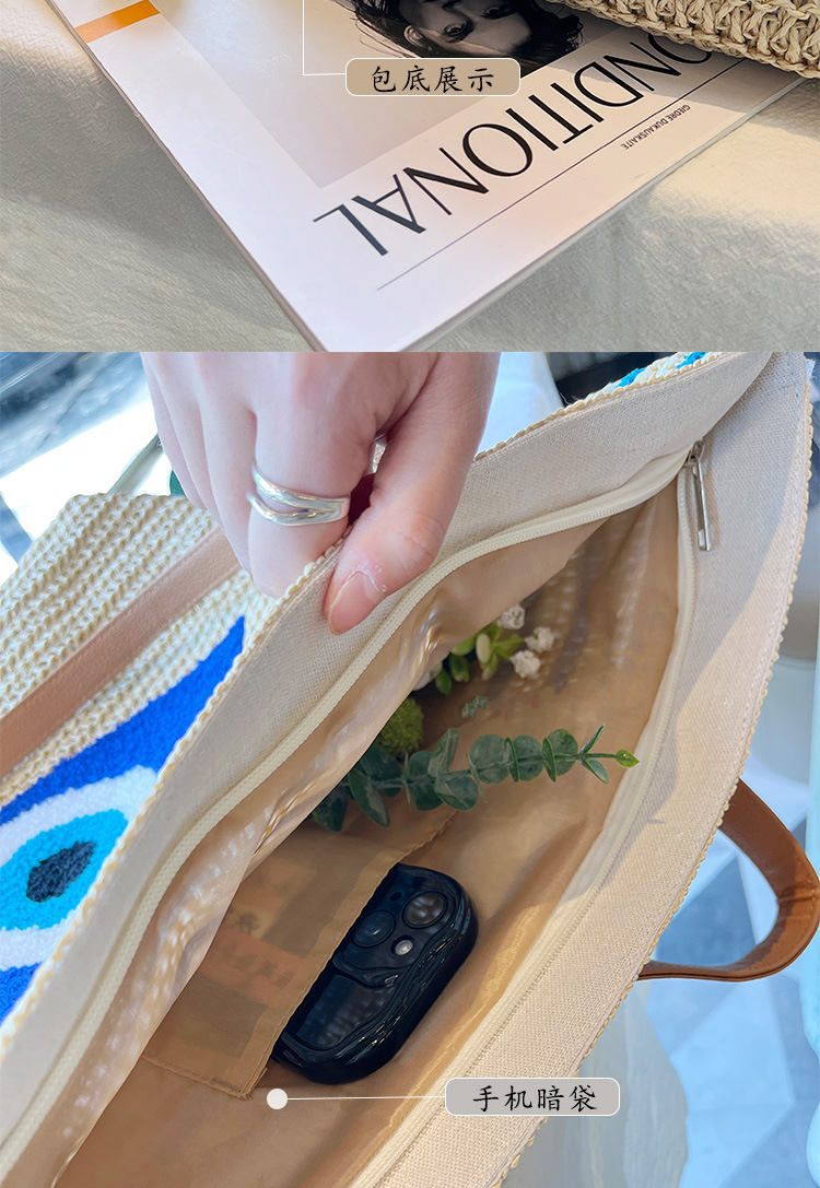 새로운 무지개 줄무늬 배색 수제 친환경 PP 종이 밀짚 가방 다용도 해변 휴가 비치백스토어 가기