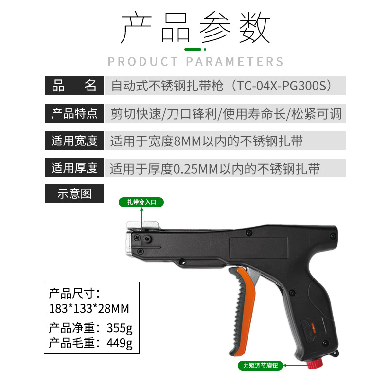 • 자체 개발 스테인리스 스틸 자동 케이블 타이 건 TC-04X-PG300S