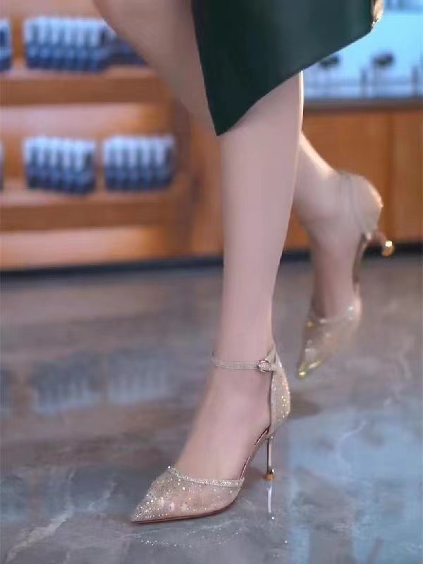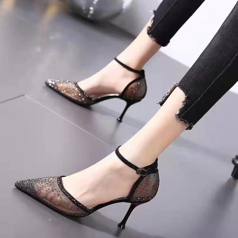 메쉬 포인팅 라인스톤 얇은 힐 할로우 싱글 레이어 신발 여성의 2024 여름 새로운 우아한 하이힐 바오 터우 샌들