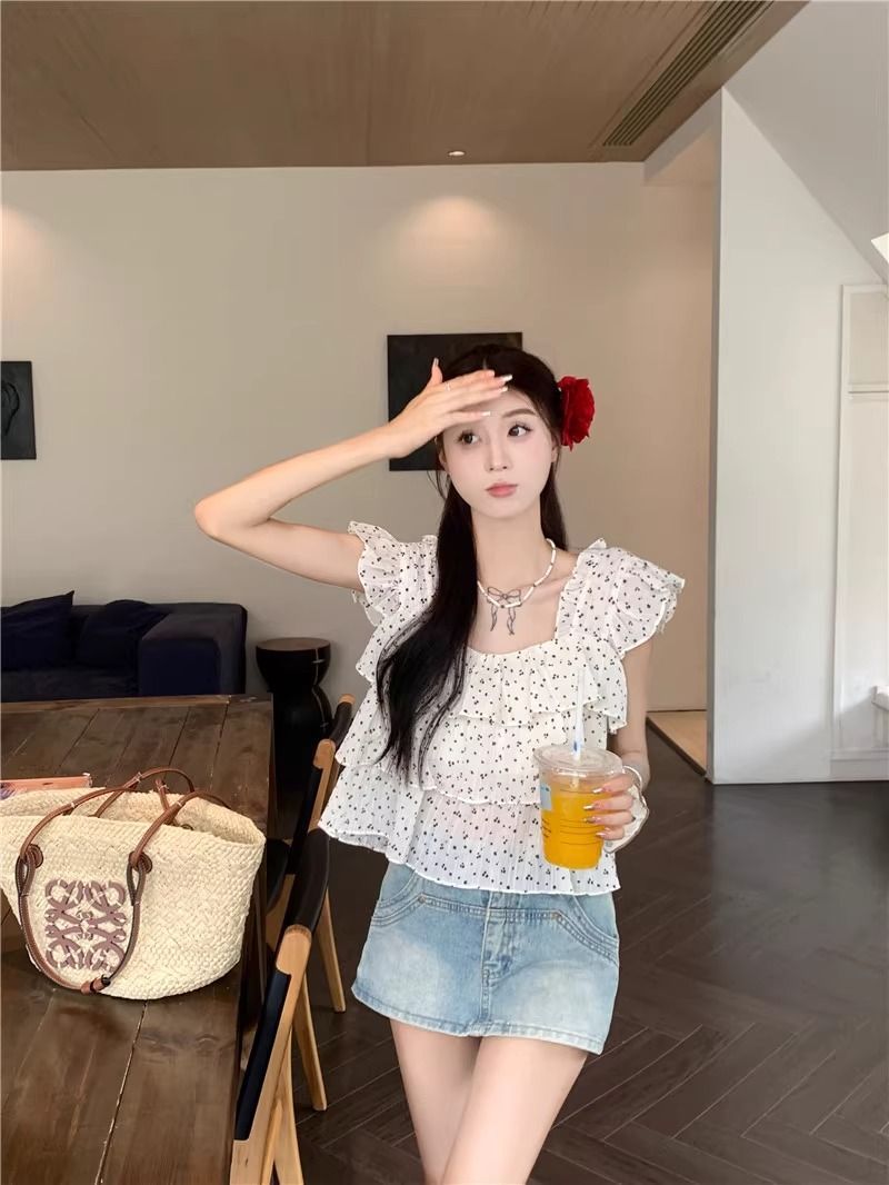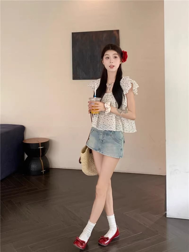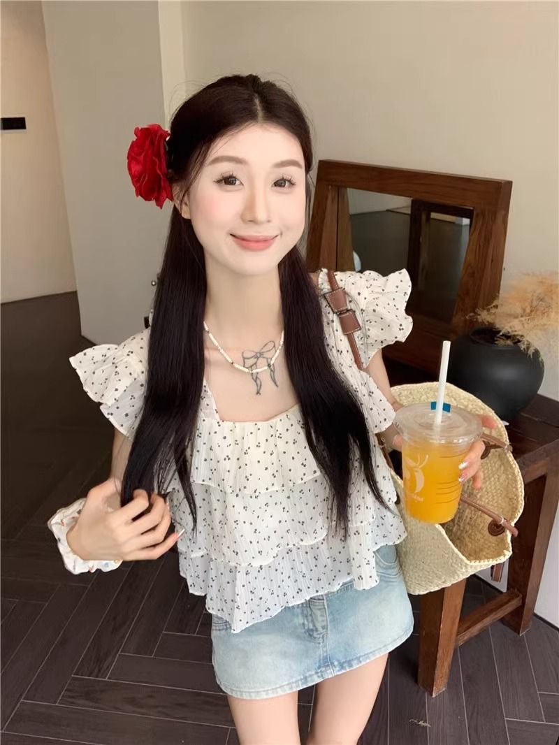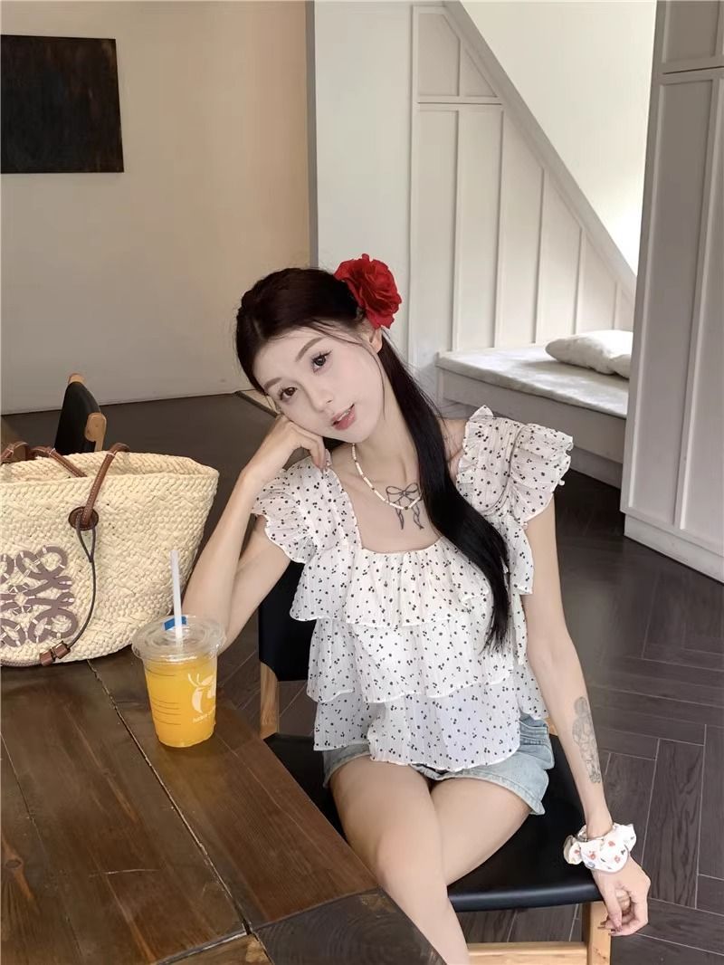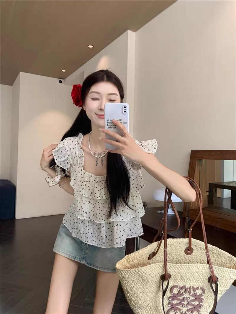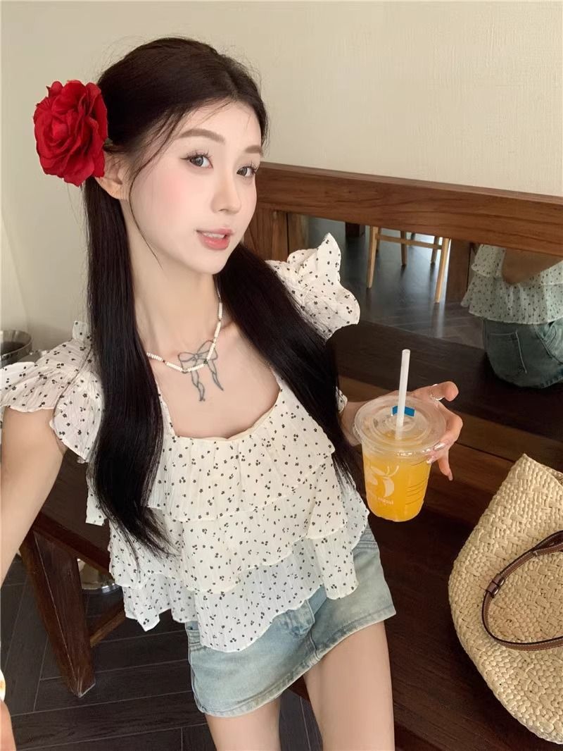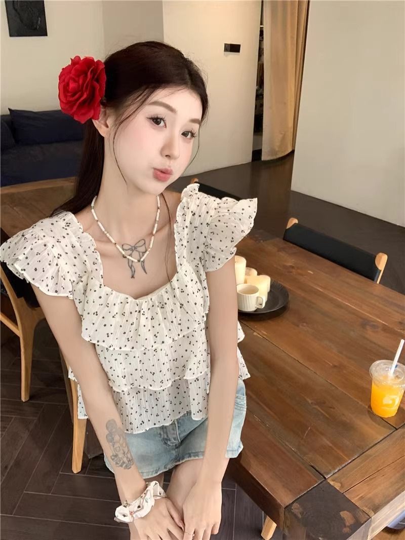 달콤한 웨이브 도트 작은 플라잉 슬리브 셔츠 여성의 여름 디자인 나이를 줄이는 스퀘어 넥 쉬폰 인형 셔츠 스타일리시하게 짧은 탑스토어 가기