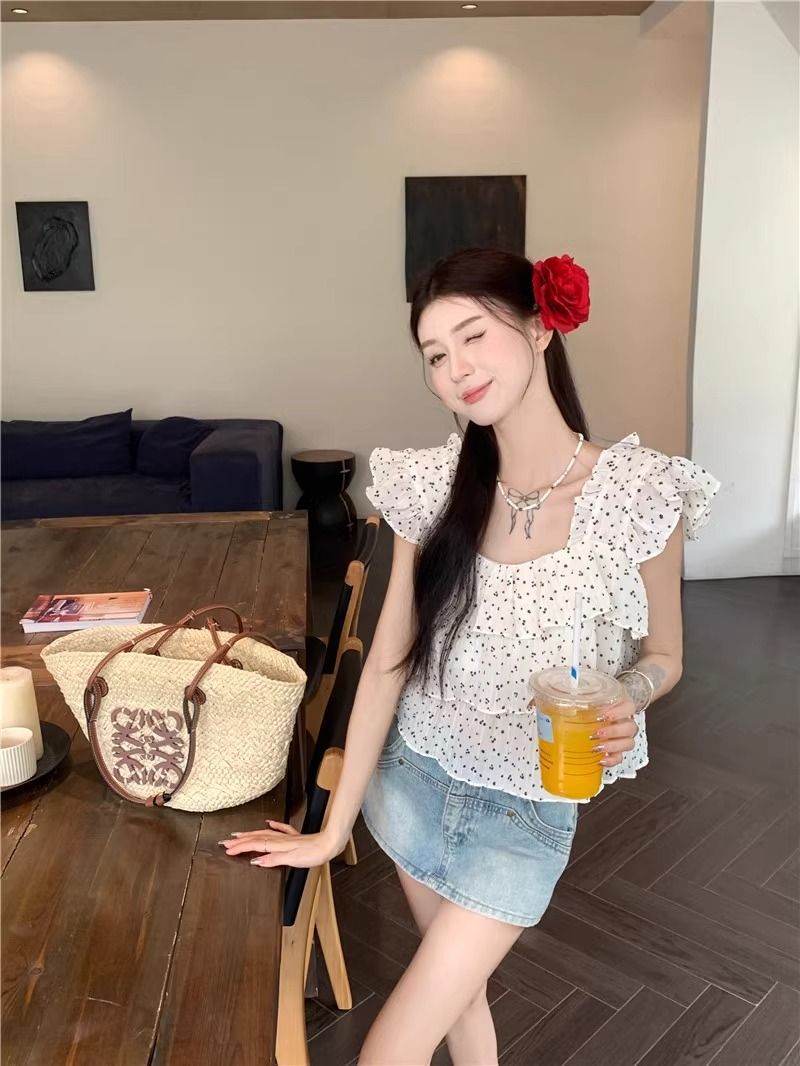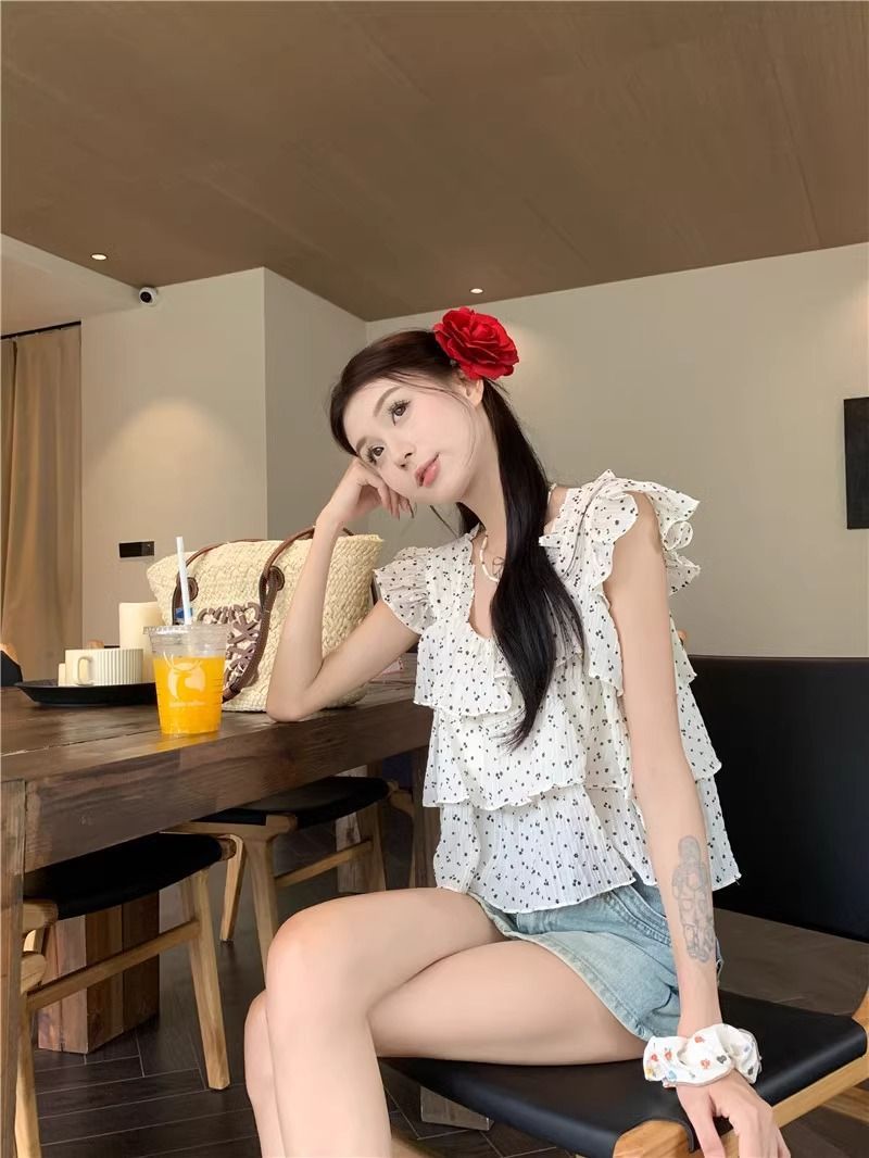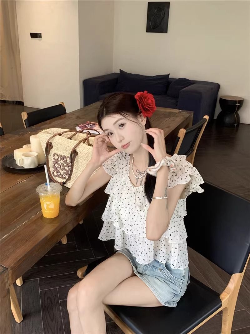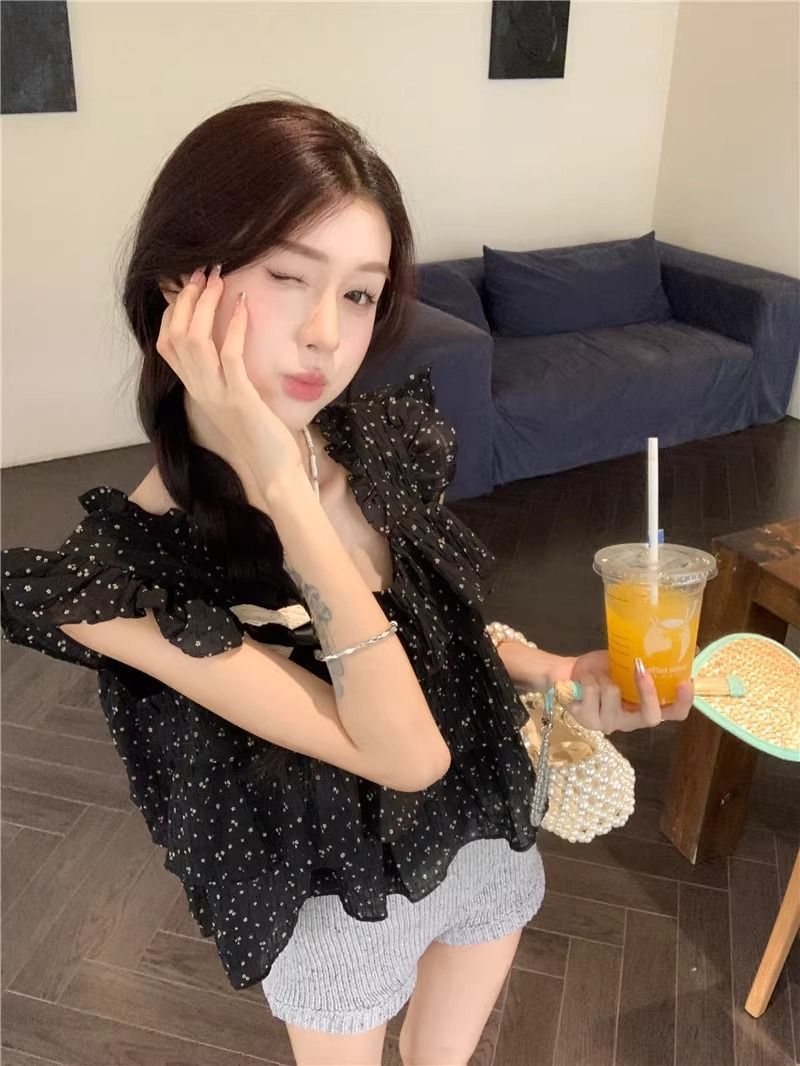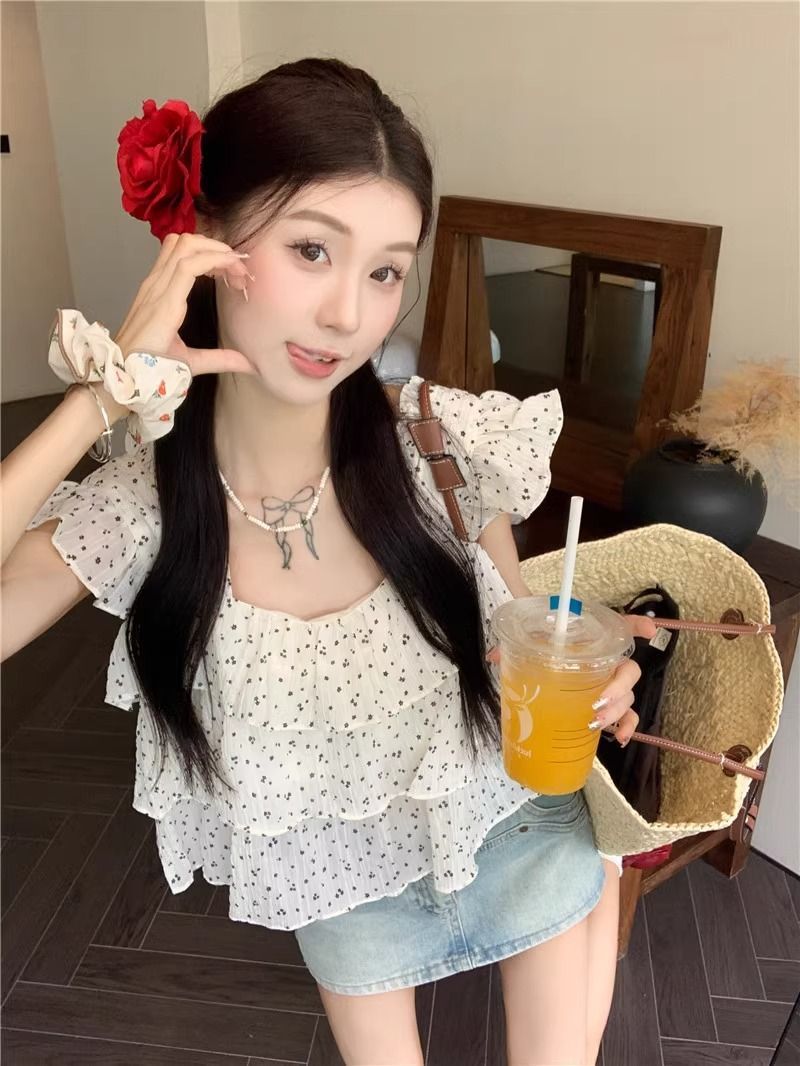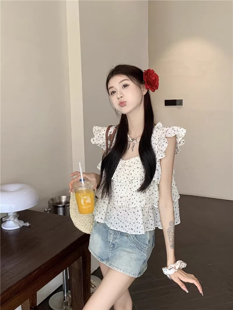달콤한 웨이브 도트 작은 플라잉 슬리브 셔츠 여성의 여름 디자인 나이를 줄이는 스퀘어 넥 쉬폰 인형 셔츠 스타일리시하게 짧은 탑스토어 가기