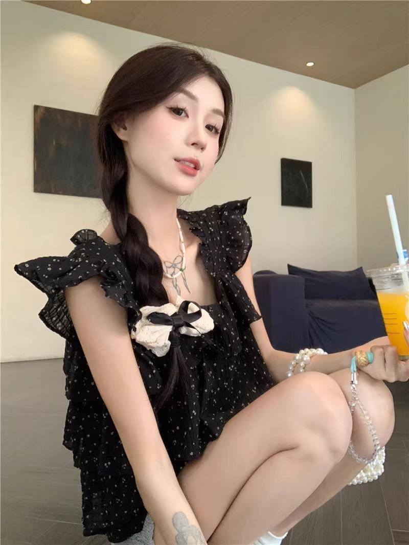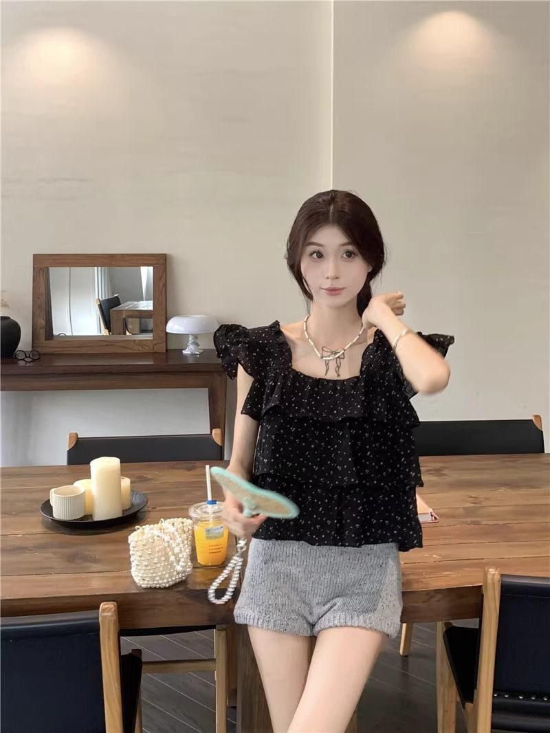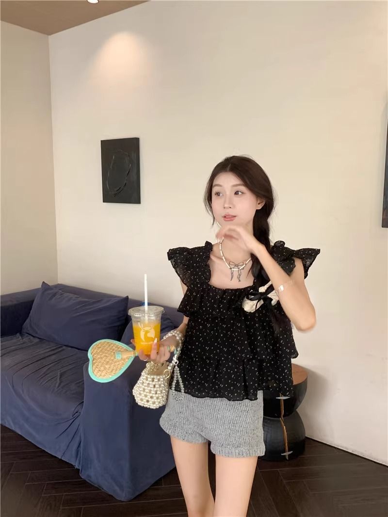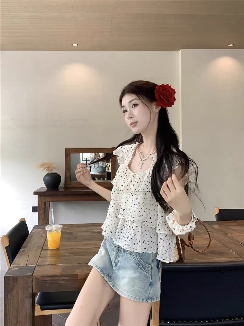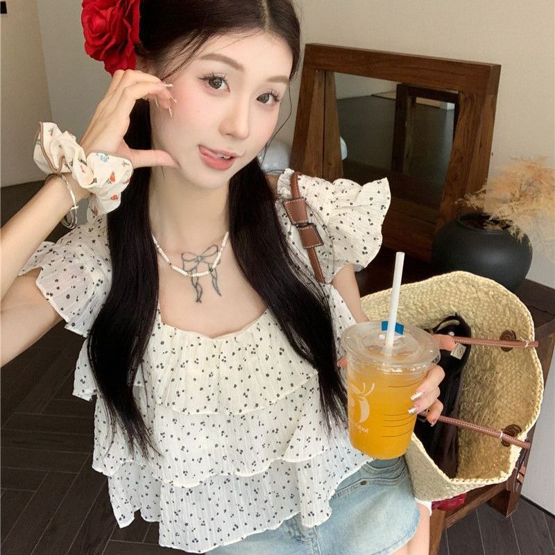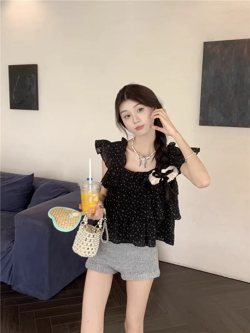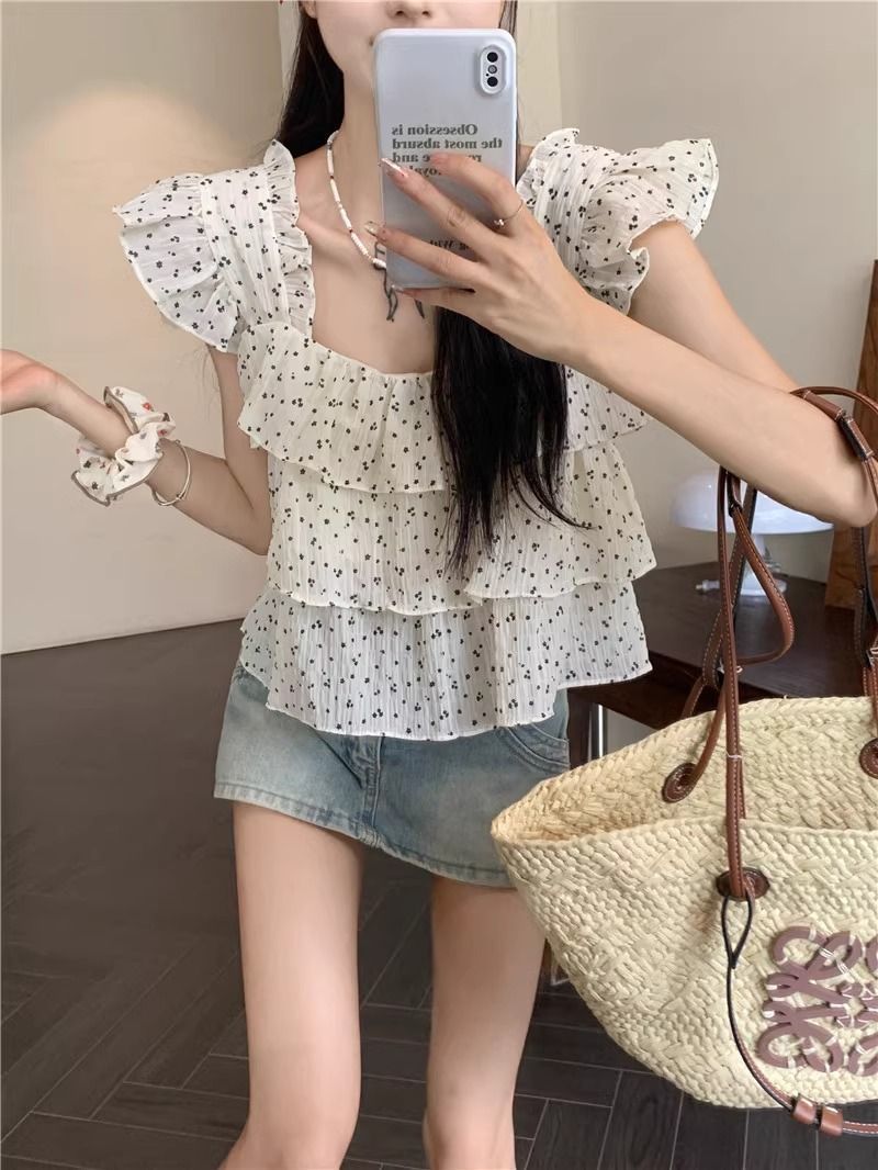 달콤한 웨이브 도트 작은 플라잉 슬리브 셔츠 여성의 여름 디자인 나이를 줄이는 스퀘어 넥 쉬폰 인형 셔츠 스타일리시하게 짧은 탑스토어 가기