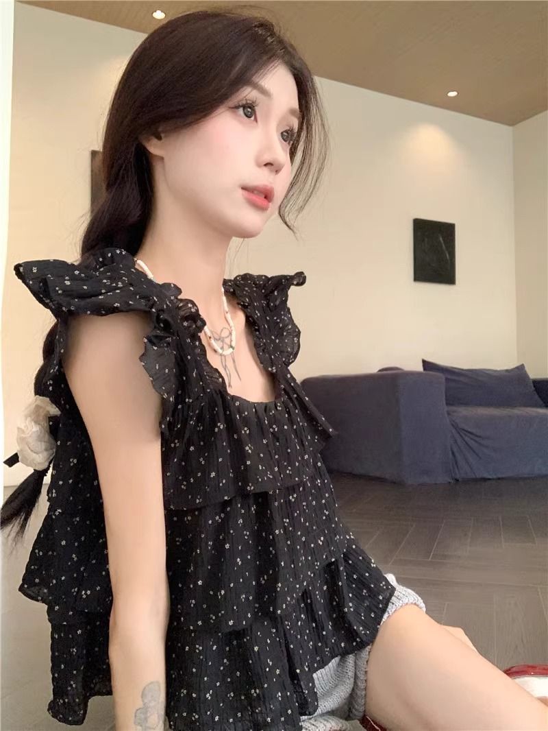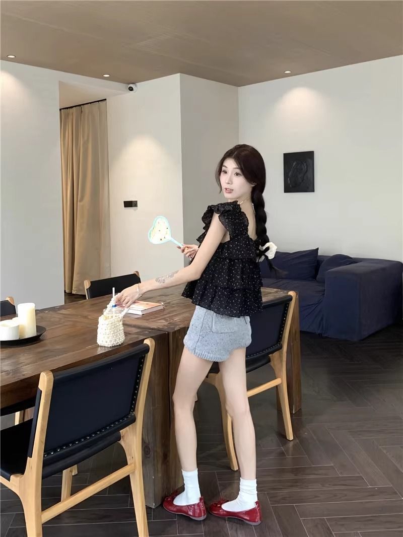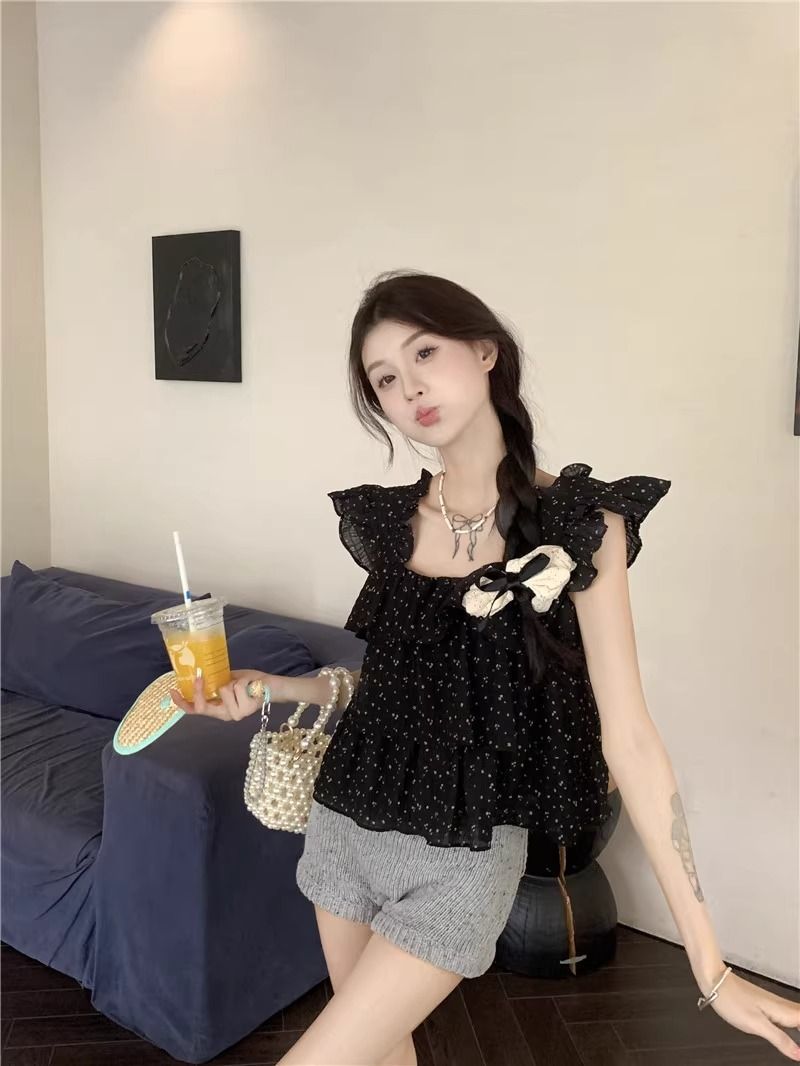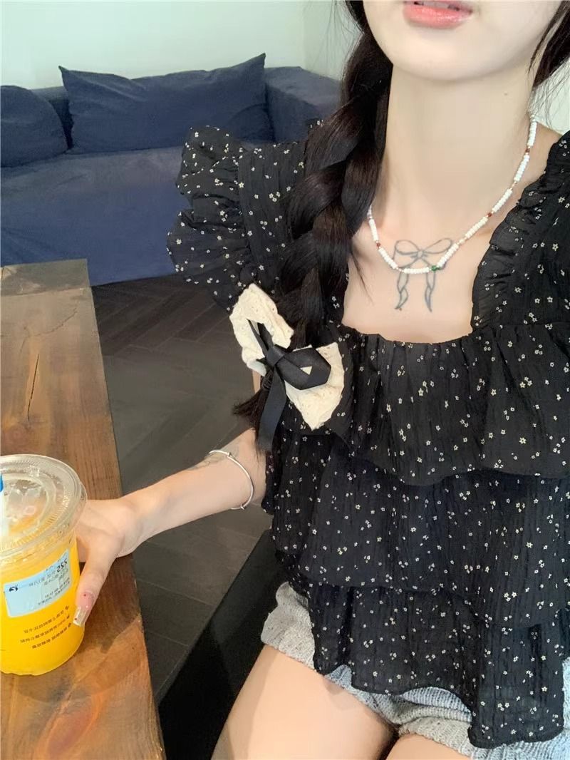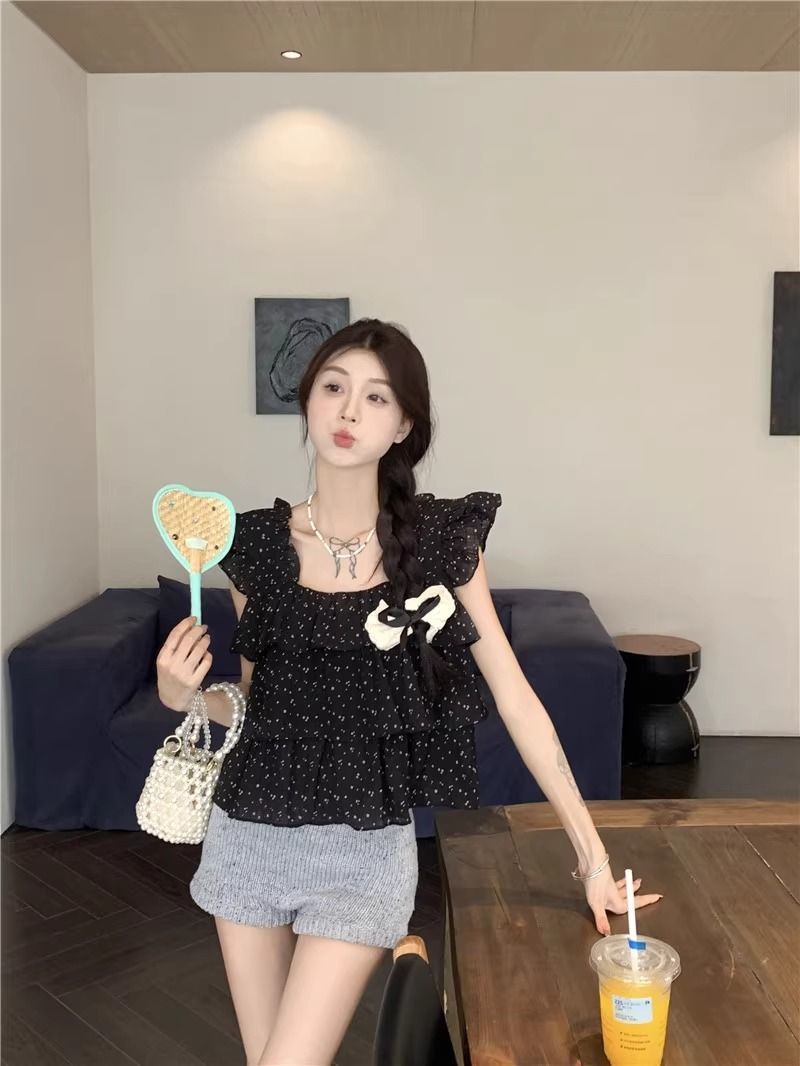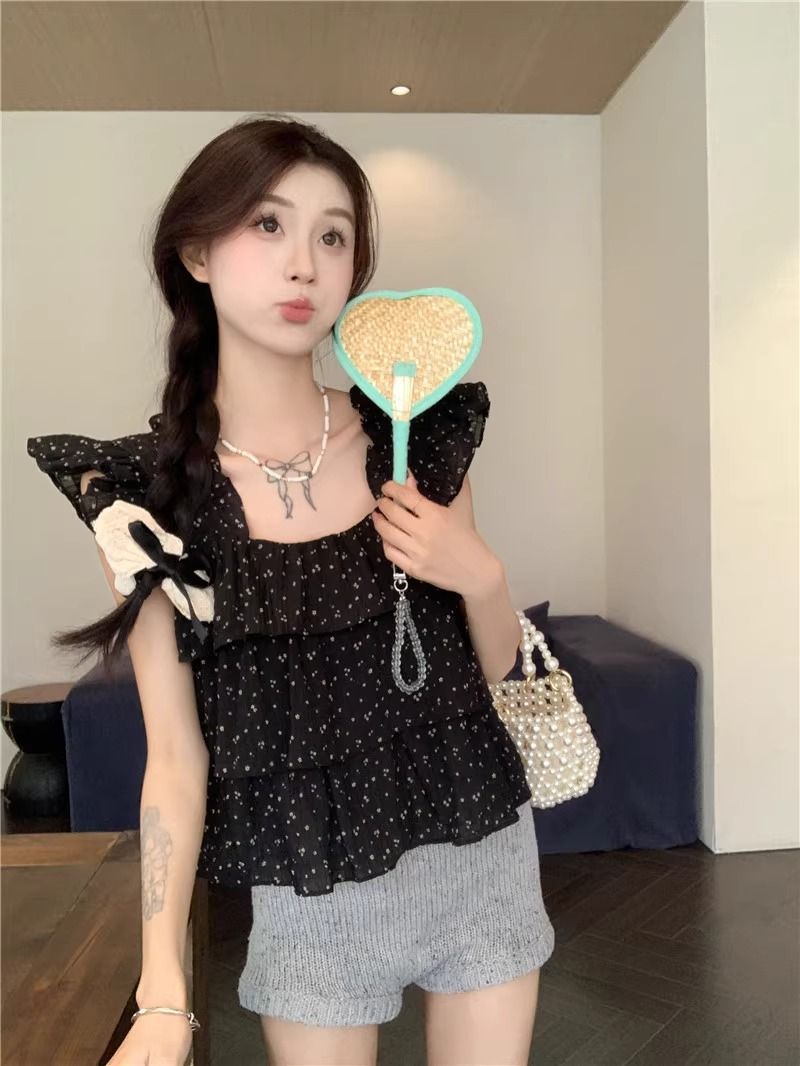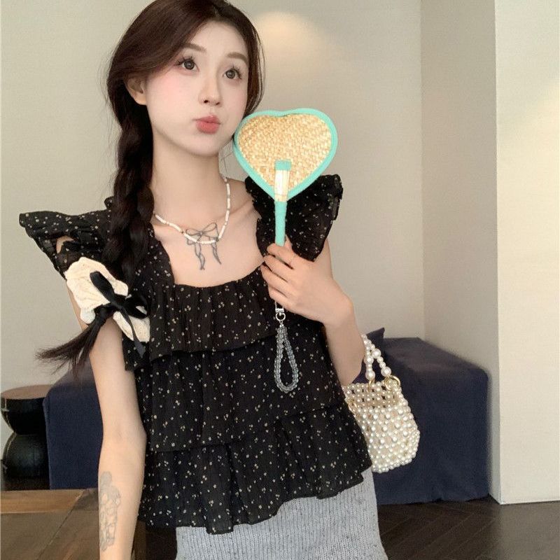 달콤한 웨이브 도트 작은 플라잉 슬리브 셔츠 여성의 여름 디자인 나이를 줄이는 스퀘어 넥 쉬폰 인형 셔츠 스타일리시하게 짧은 탑스토어 가기