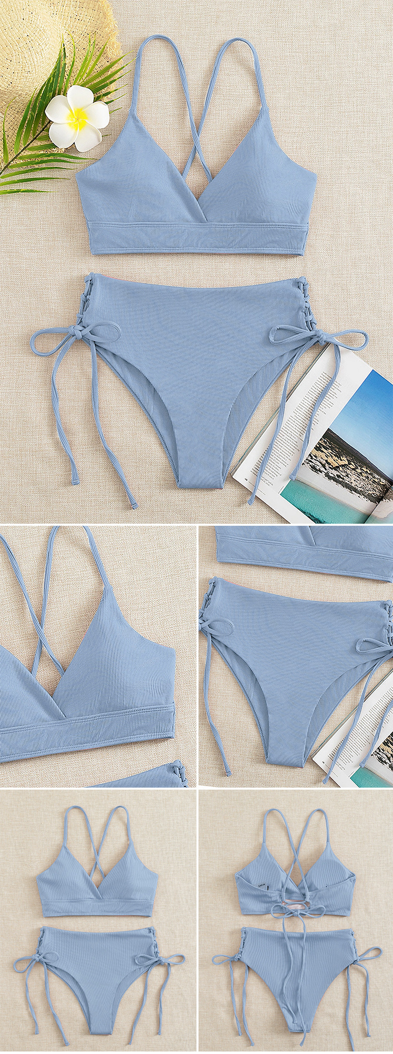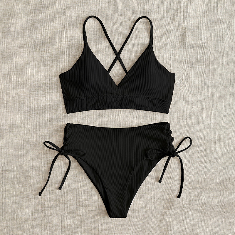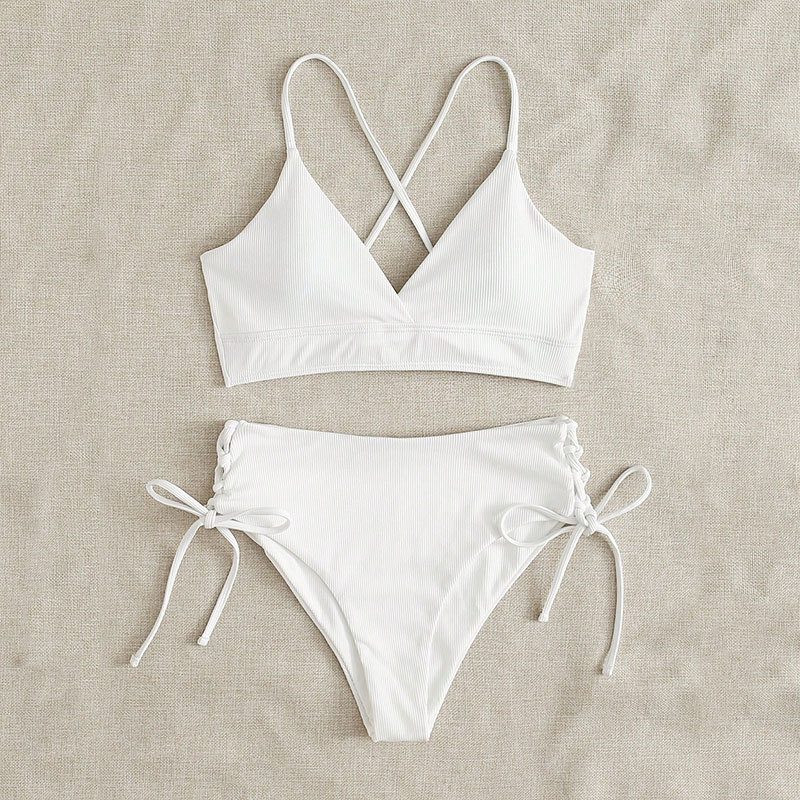 새로운 유럽과 미국의 수영복 여성 크로스 바디 솔리드 컬러 v 넥 섹시한 비키니 세트 하이 웨이스트 드로스트링 스플릿 수영복