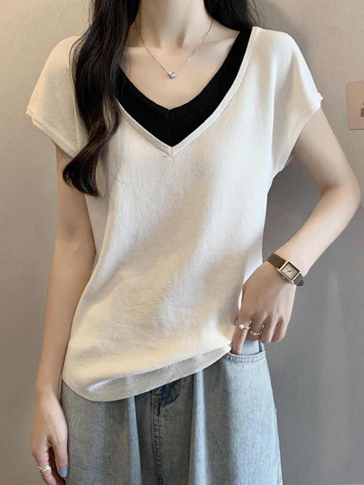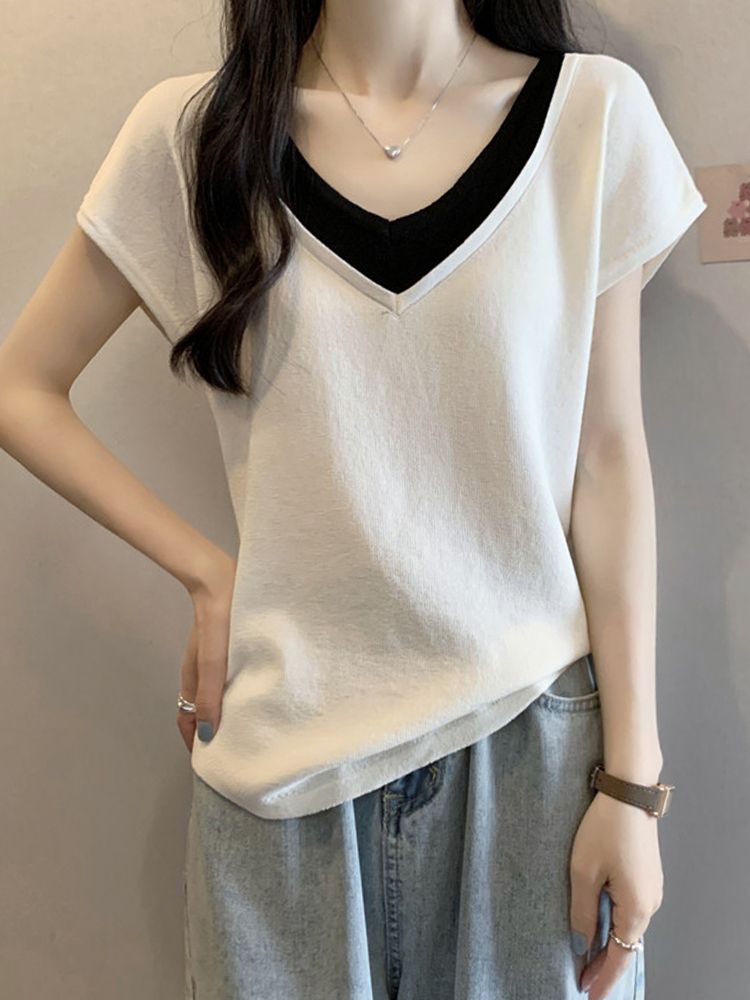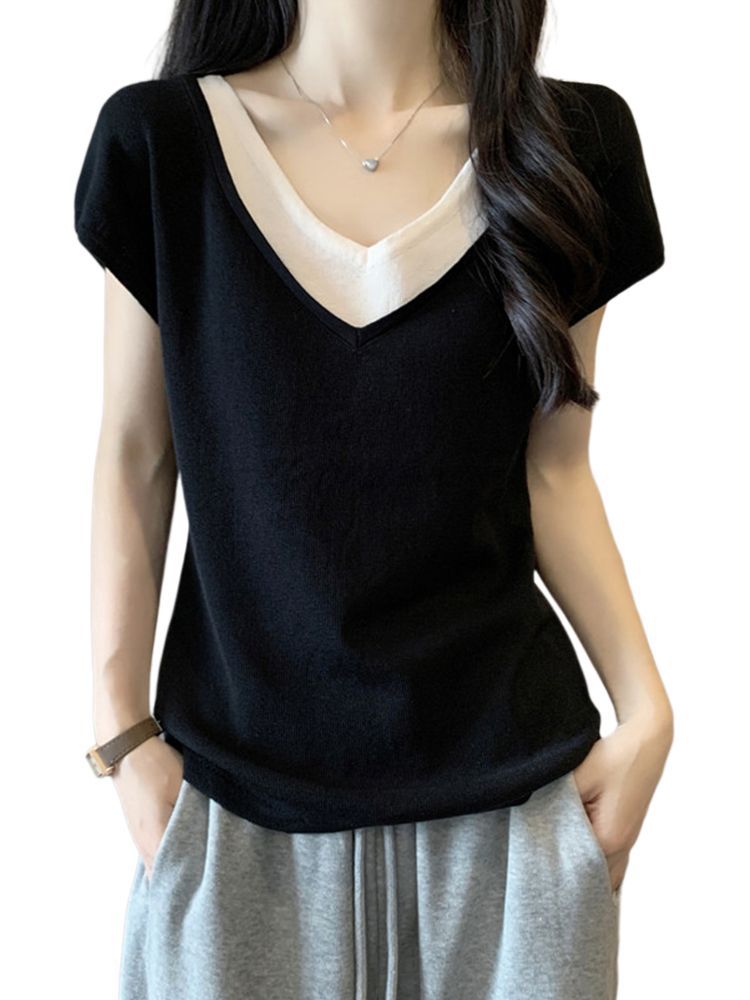 플러스 사이즈 여성용 배꼽 피복 가짜 투피스 어깨 티셔츠베이스 셔츠 여성용 여름 통통녀 슬리밍 반팔 탑스토어 가기