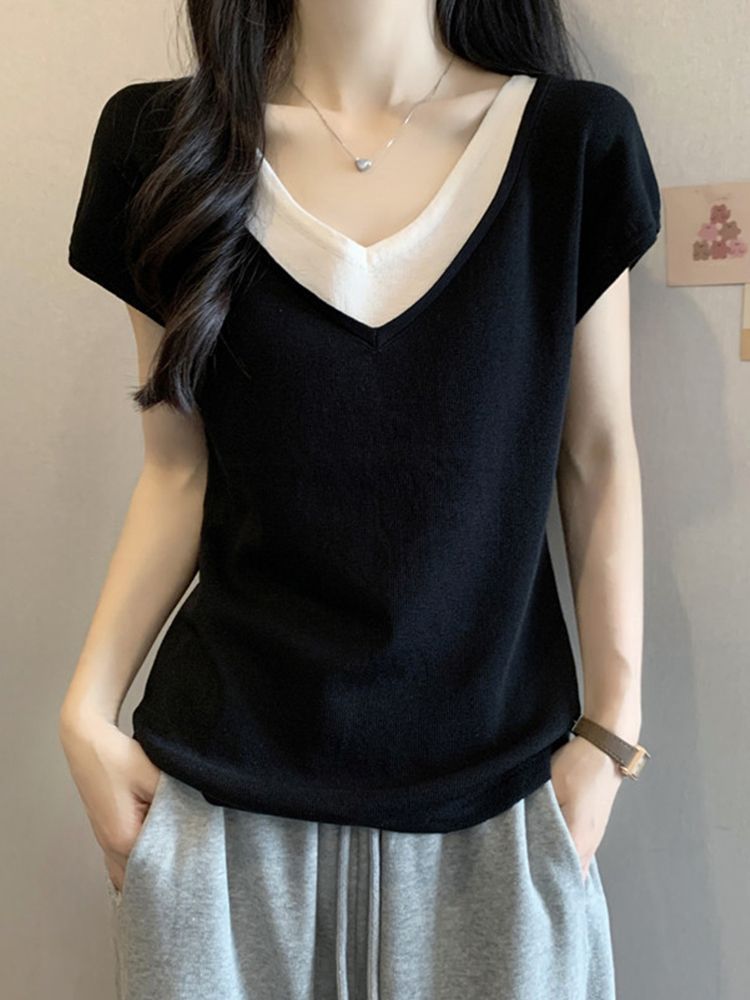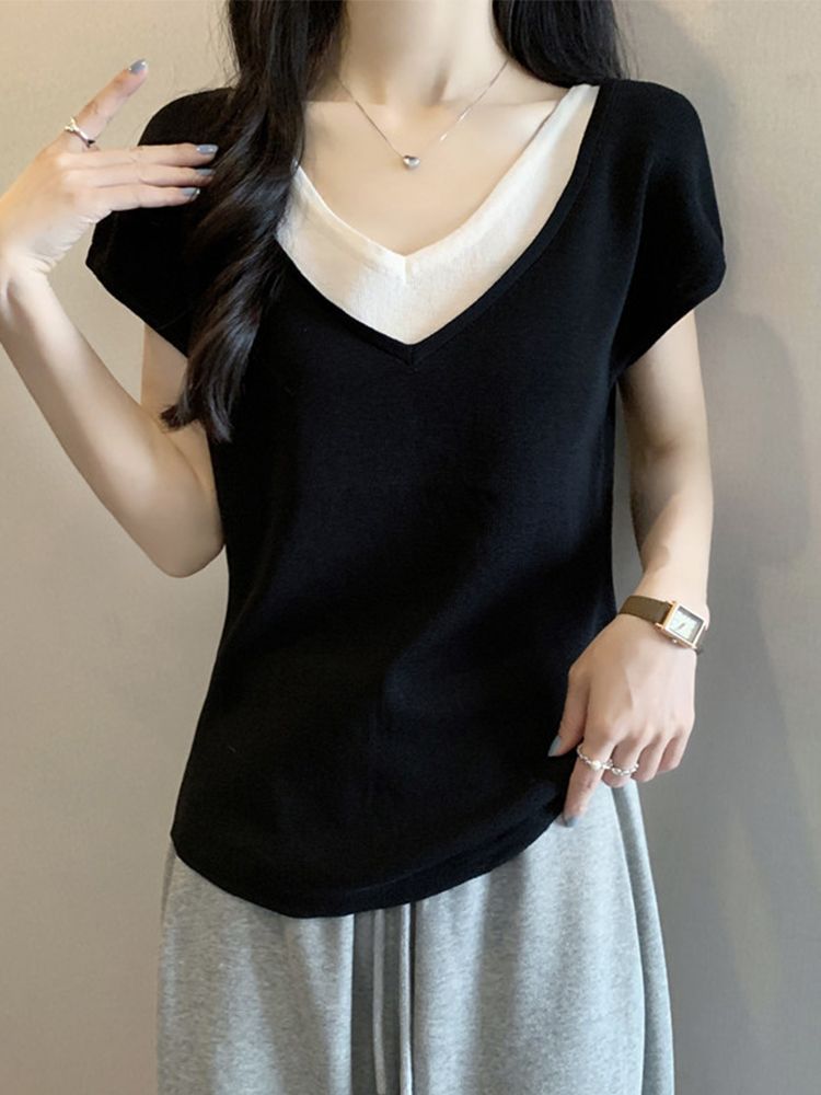 플러스 사이즈 여성용 배꼽 피복 가짜 투피스 어깨 티셔츠베이스 셔츠 여성용 여름 통통녀 슬리밍 반팔 탑
