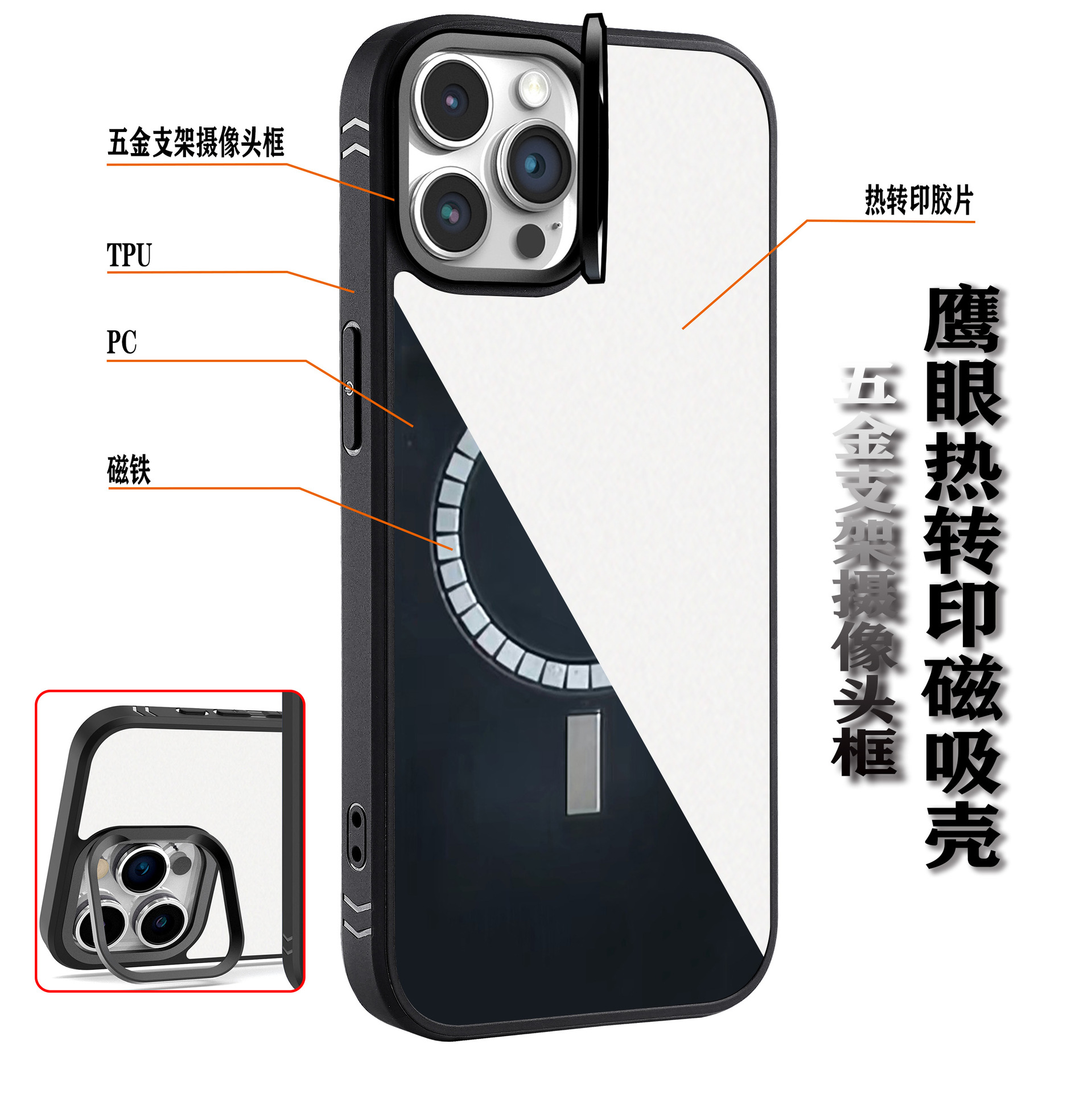 材质:TPU(软)+PC(硬)二合一 ,配热转印铝片或者胶片