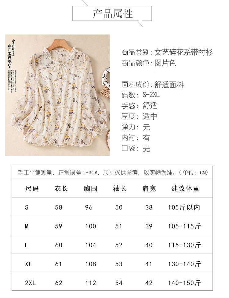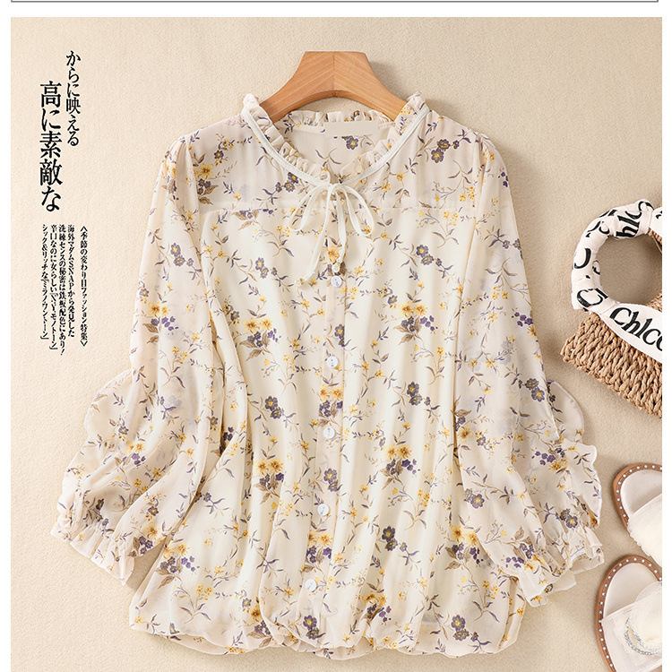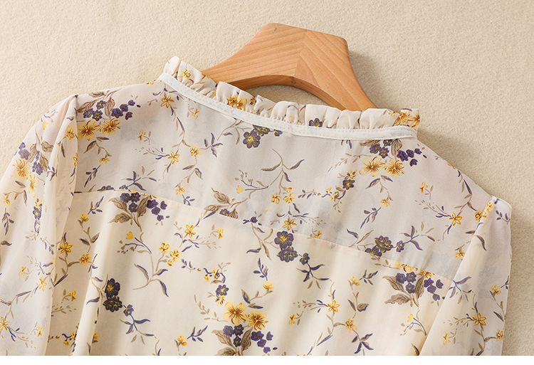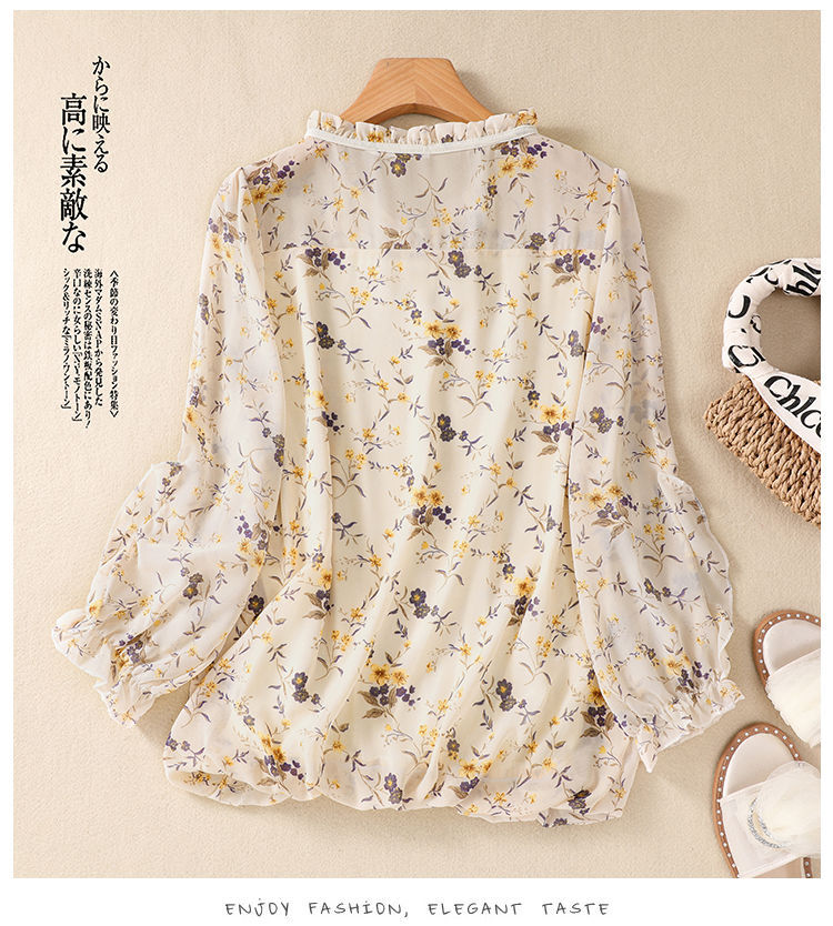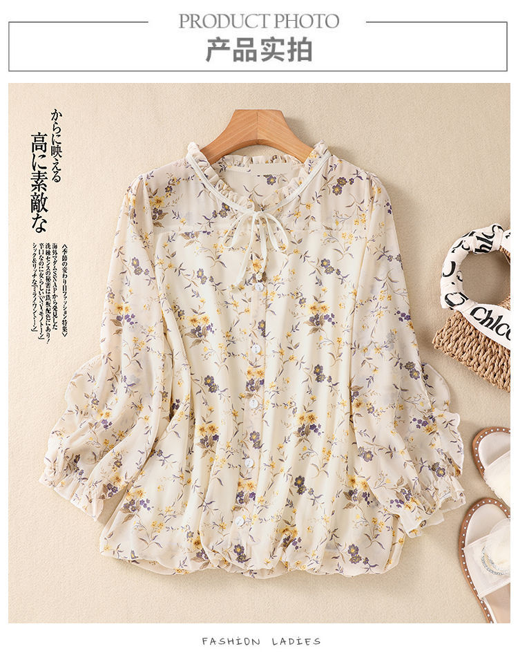 러플 장식의 배를 가려주는 쉬폰 셔츠 2024 신상 여성 고급스러운 플로럴 탑 산뜻한 스타일 다용도 슬림핏