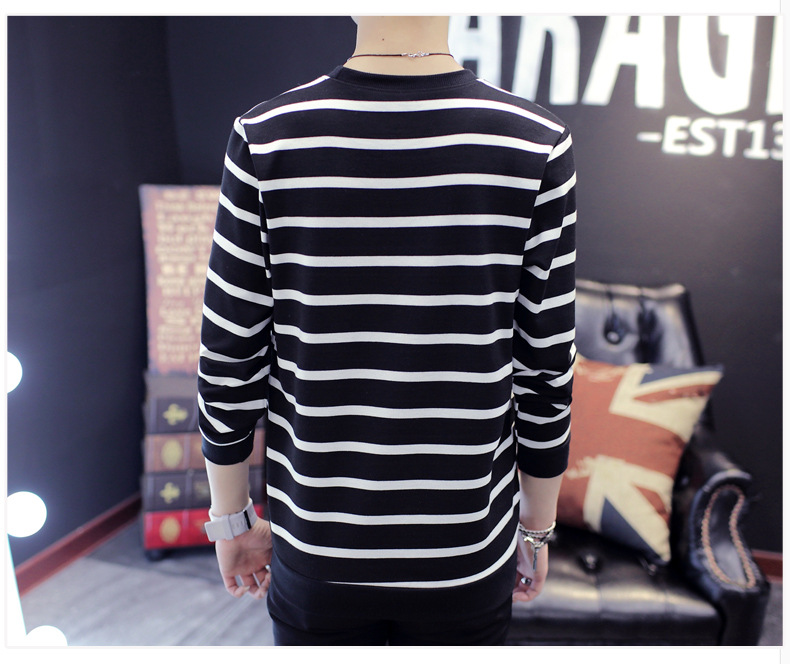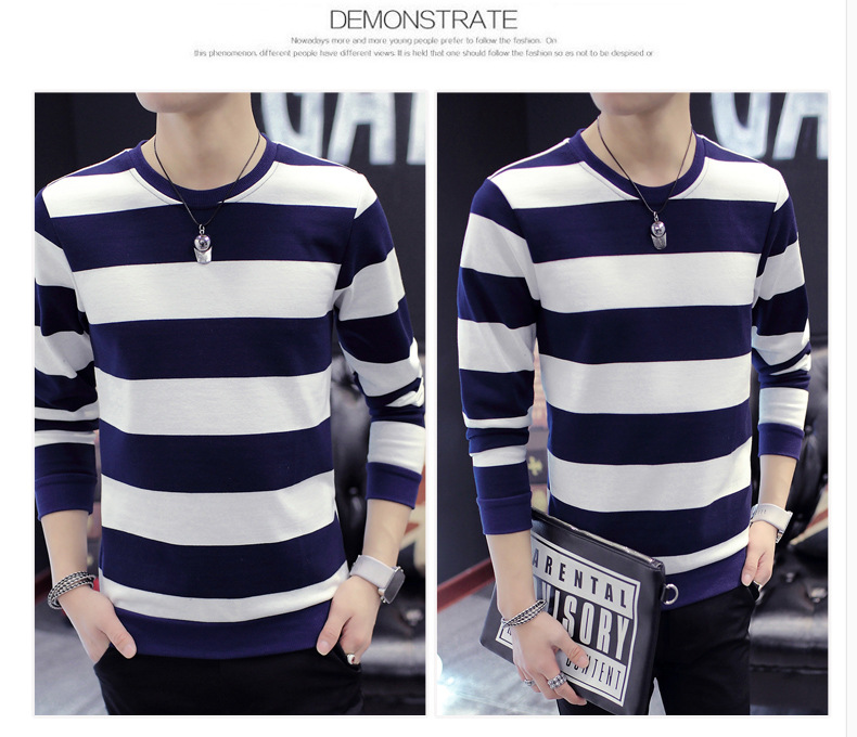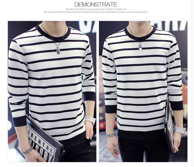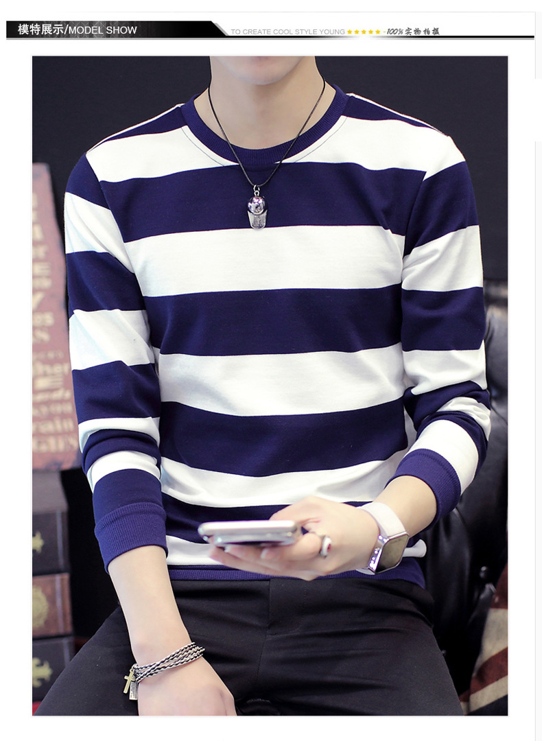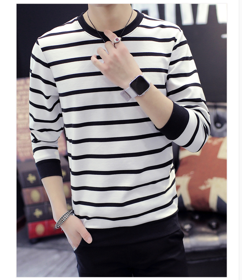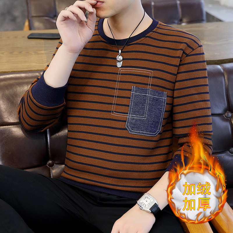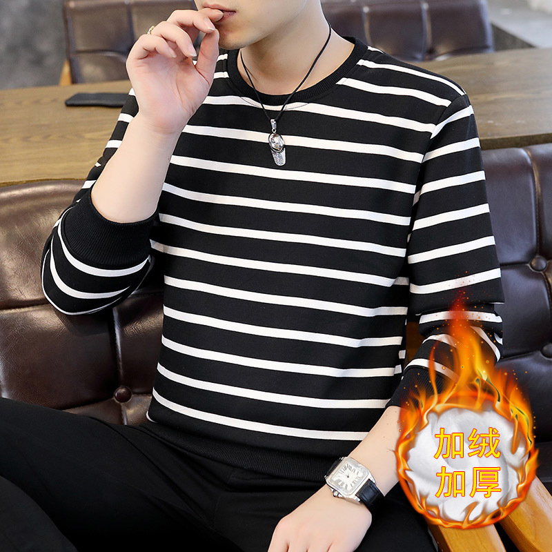 젊은 트렌디 긴팔 티셔츠 봄 스트라이프 멋진 옷 남성 가을 겨울 기모 스웨트셔츠 두꺼운 이너웨어