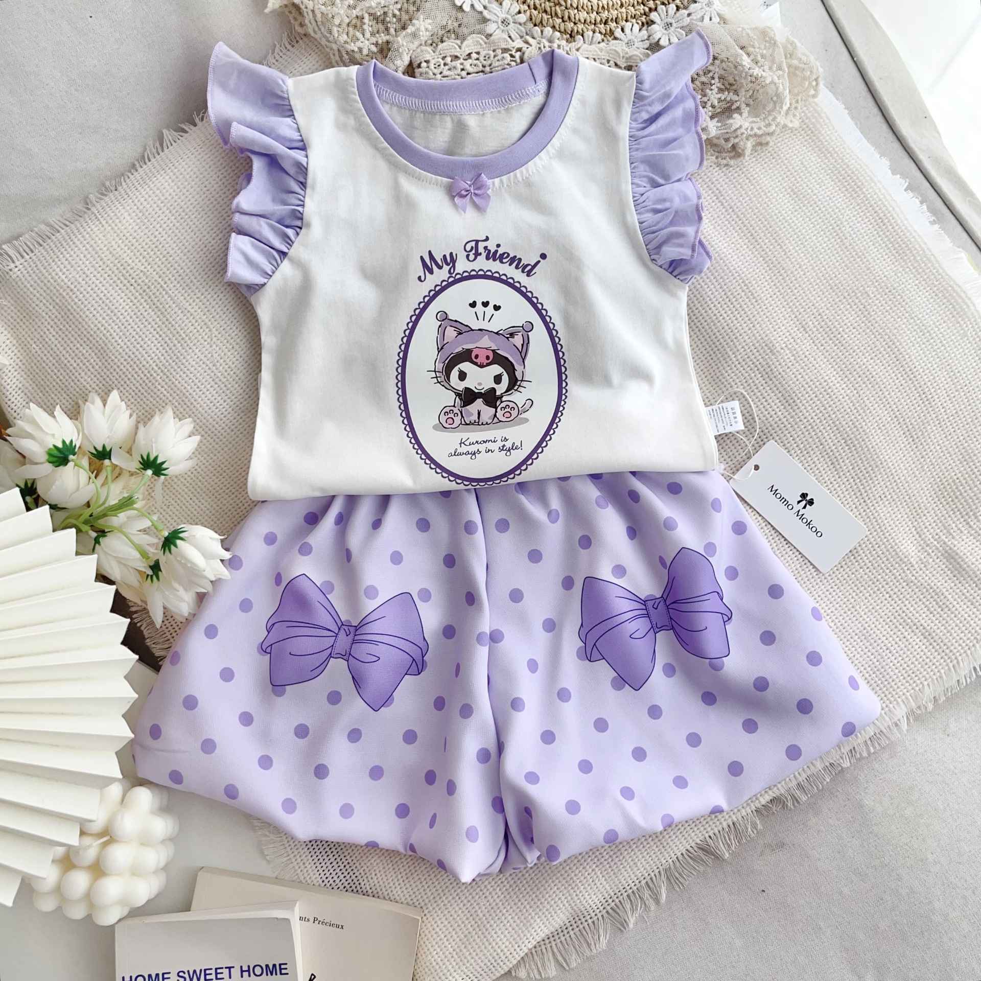 2024 여름 어린이 의류 새로운 소녀 귀여운 세트 폴카 도트 블루머 만화 호박 바지 면화 조끼 세트스토어 가기
