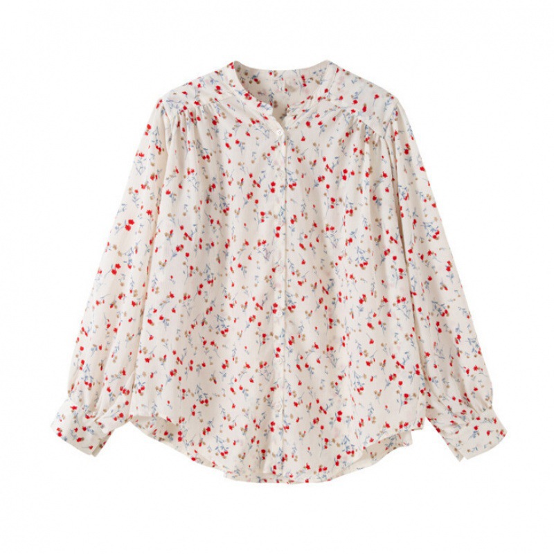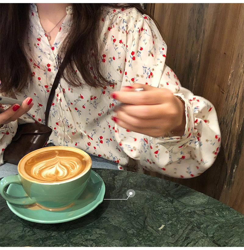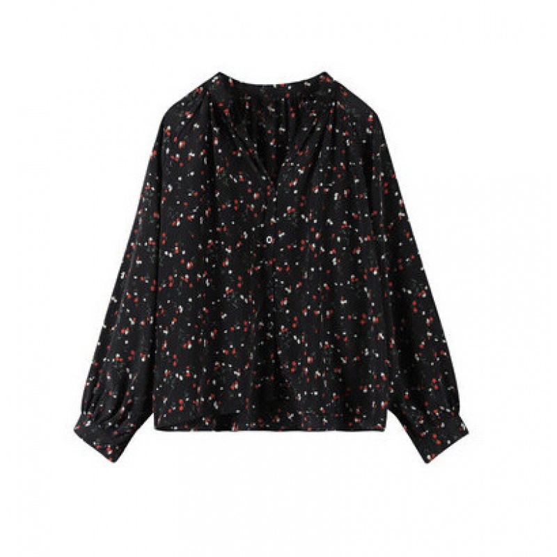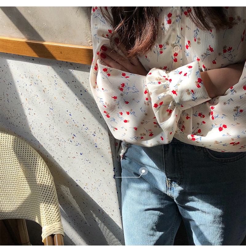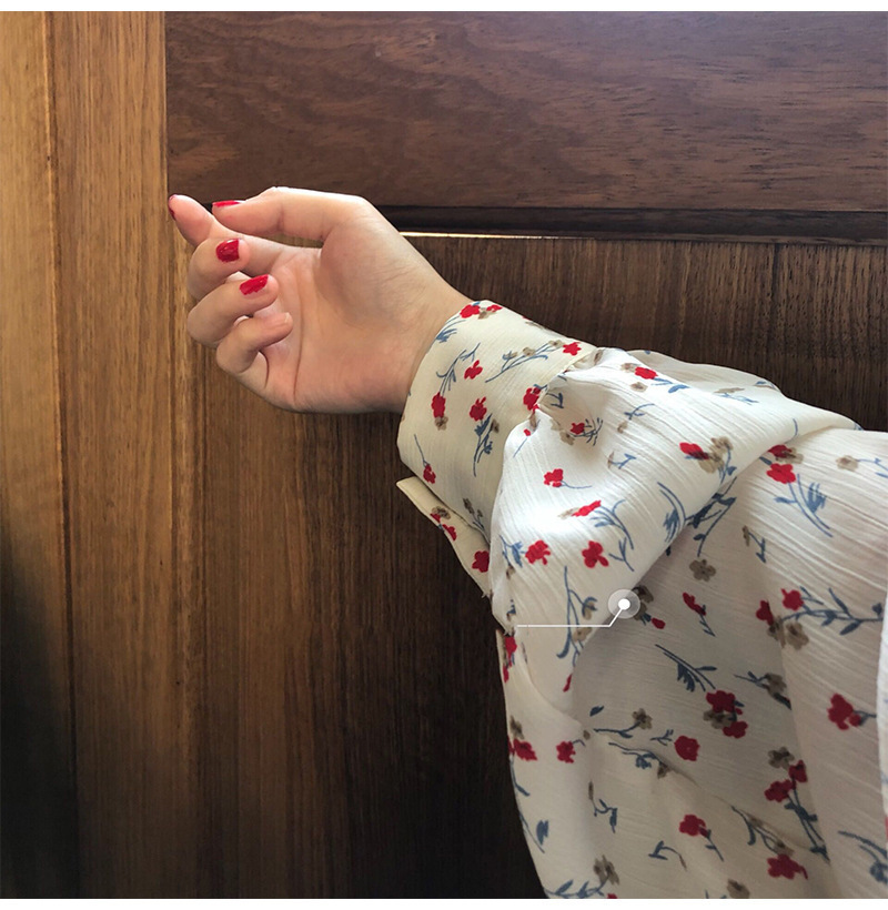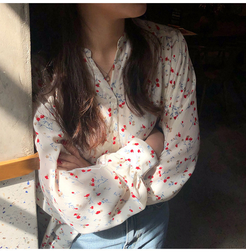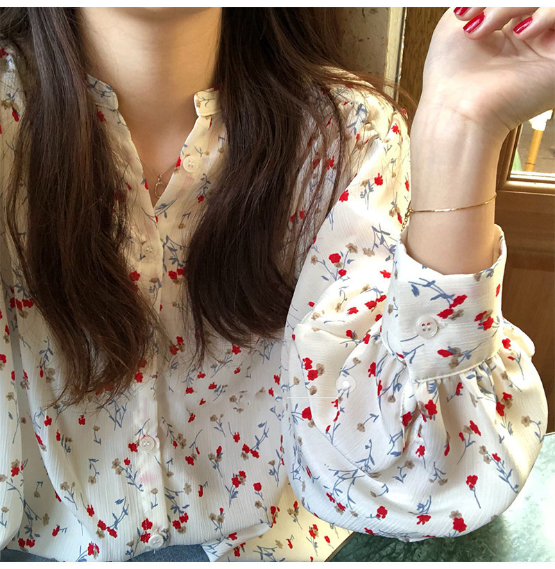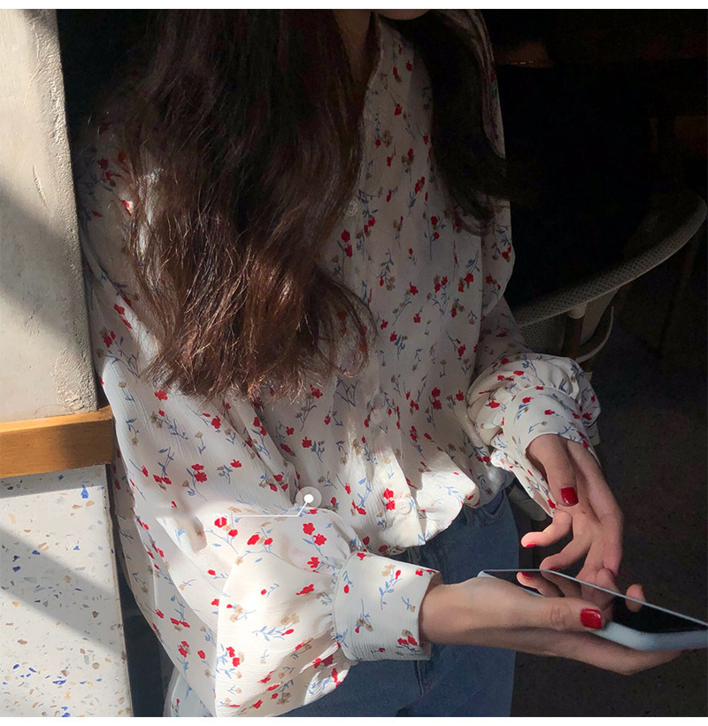 가을 2023 꽃 탑 느슨한 한국 스타일 드러프 쉬폰 V 넥 캐주얼 긴 소매 셔츠 여성 학생 디자인 감각스토어 가기