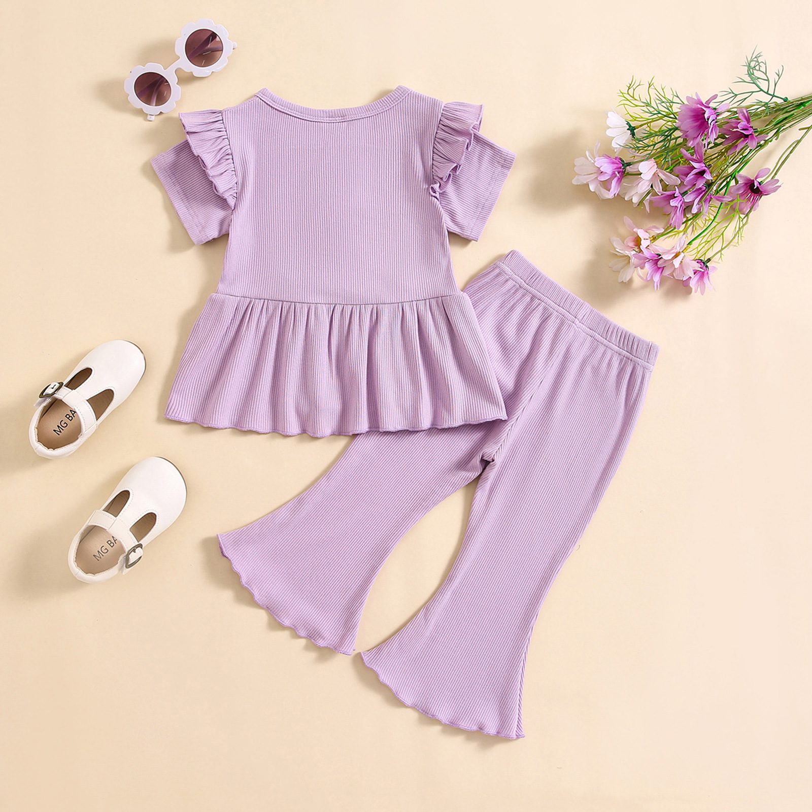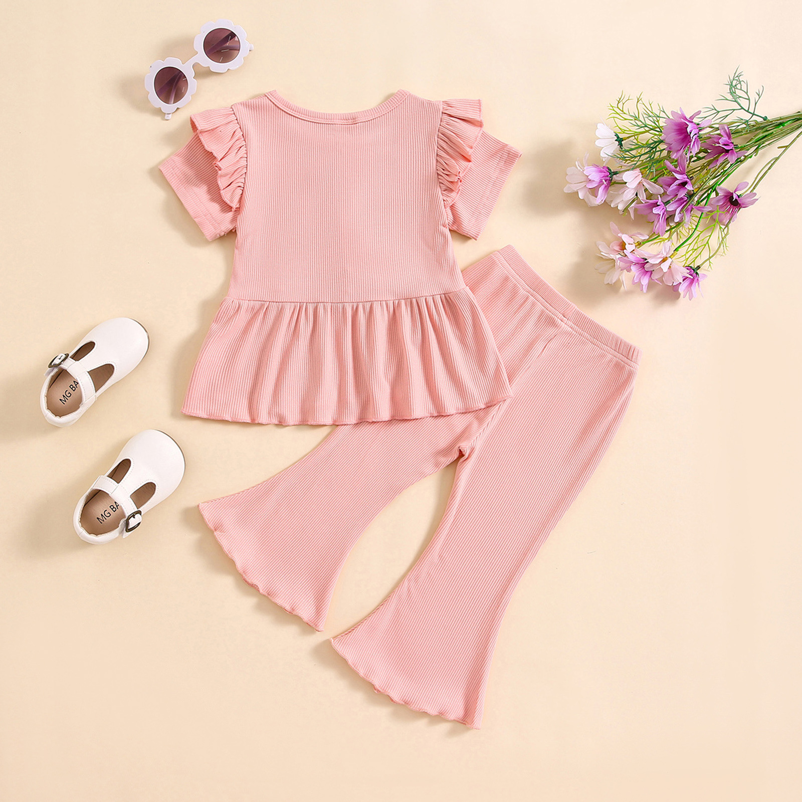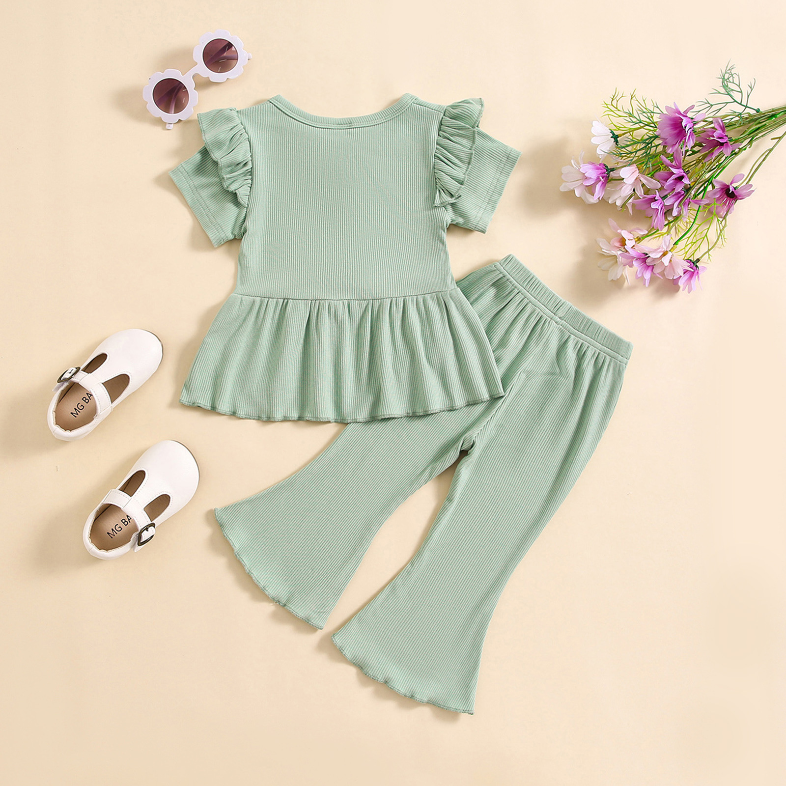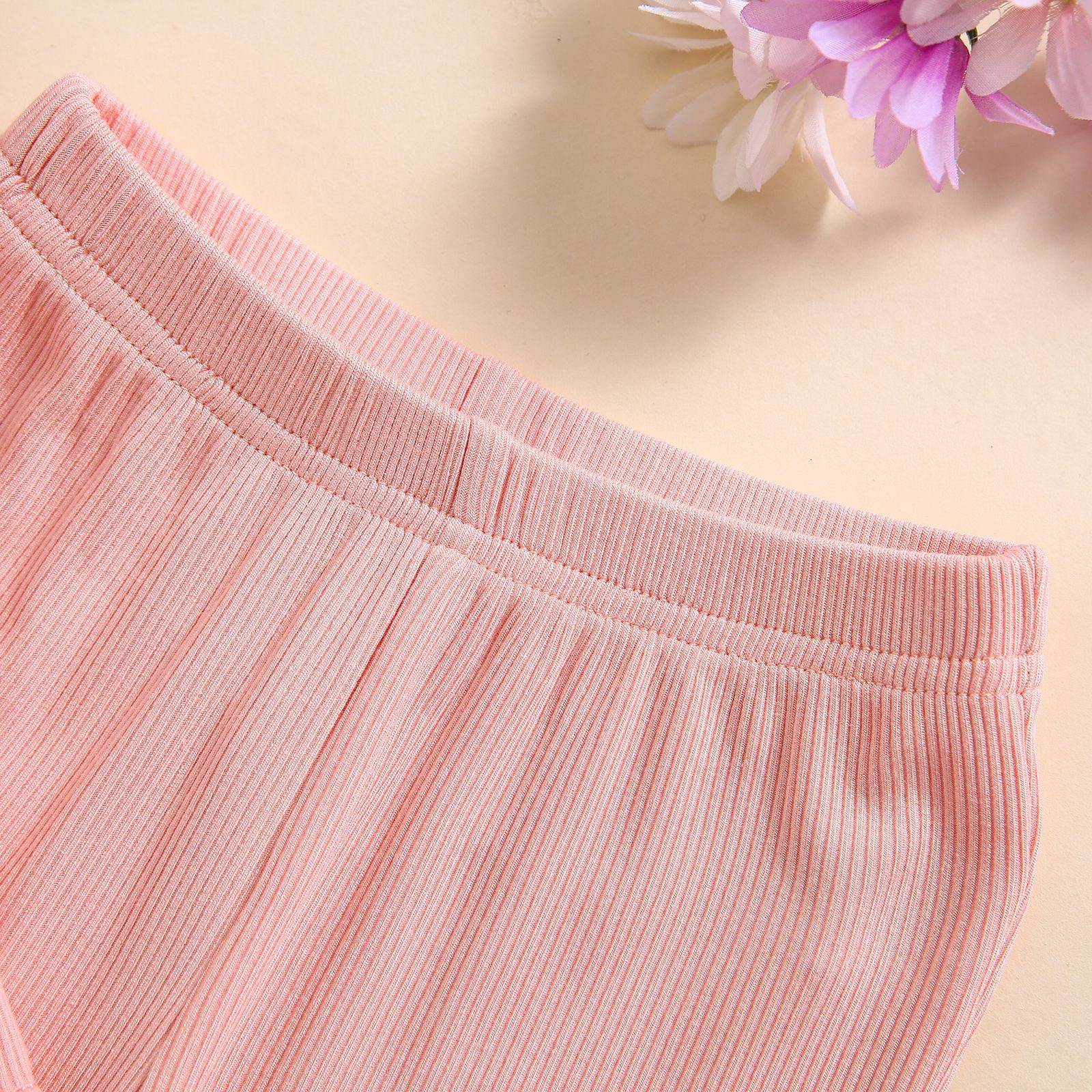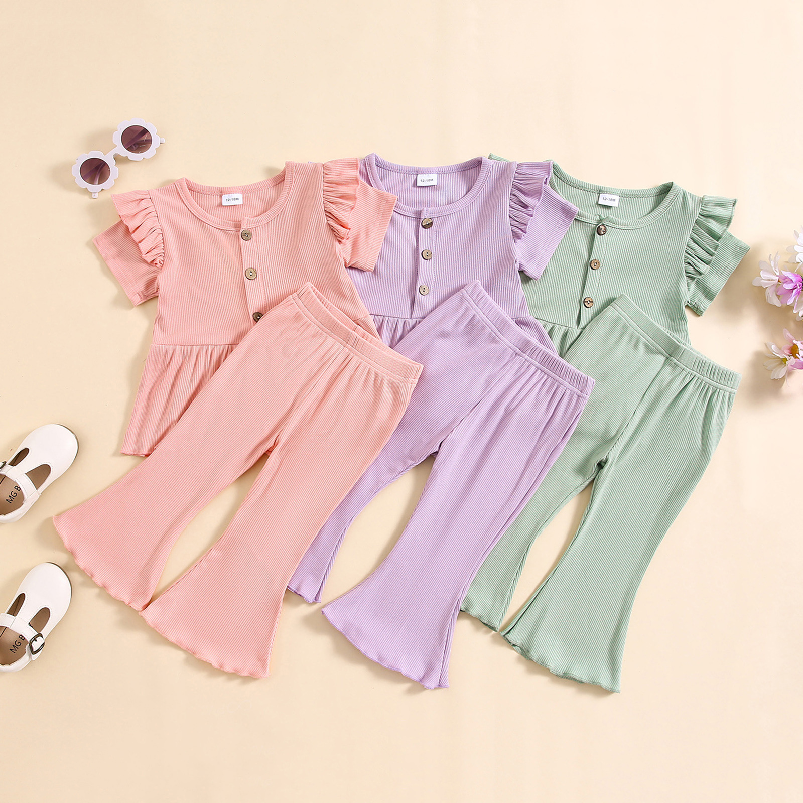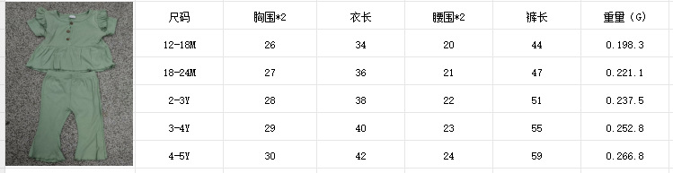 소녀 대외 무역 국경 새 피트 스트립 컬 버블 소매 단색 반팔 스커트 긴 플레어 바지 세트스토어 가기