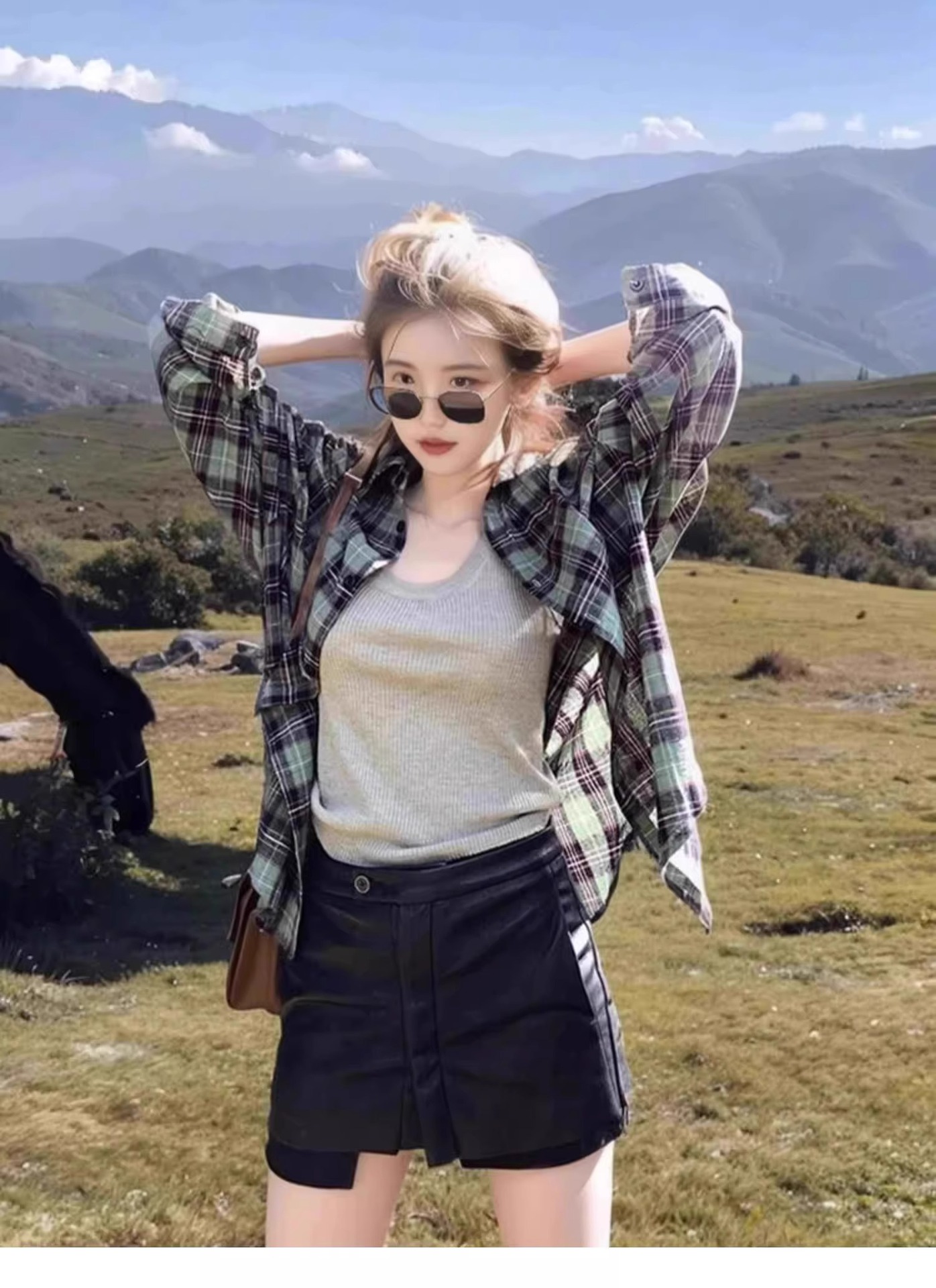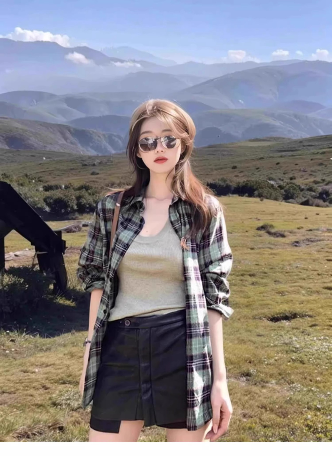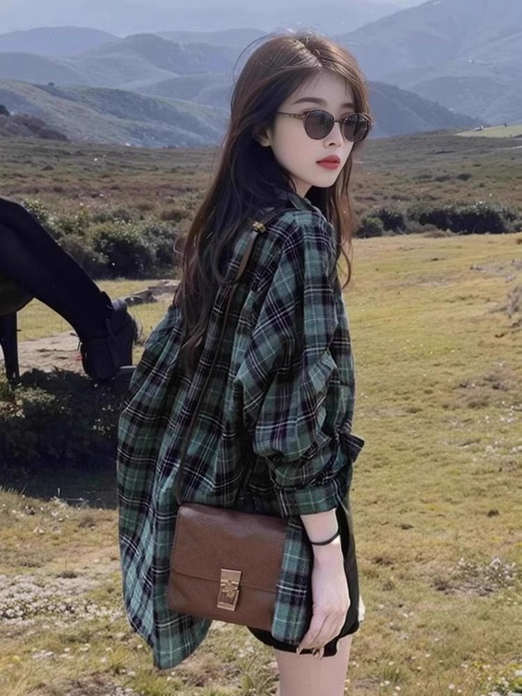 여성을위한 녹색 태양 보호 격자 무늬 셔츠 재킷 봄, 가을 새로운 캐주얼 루즈 여름 중간 길이 셔츠 탑 유행