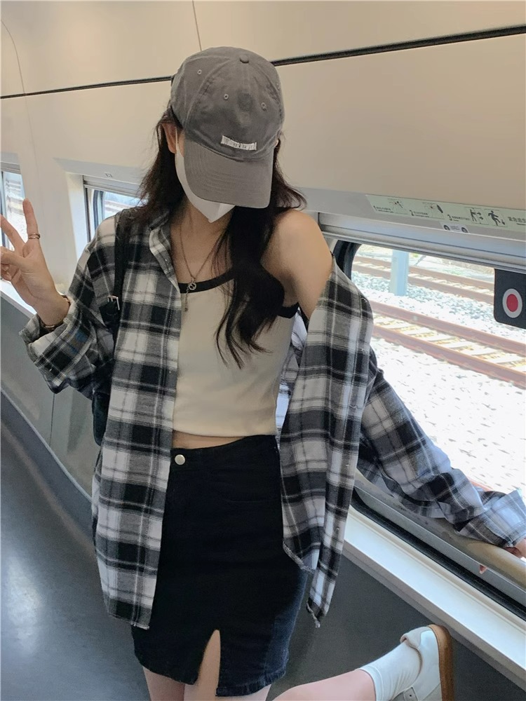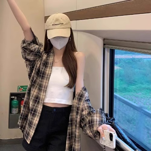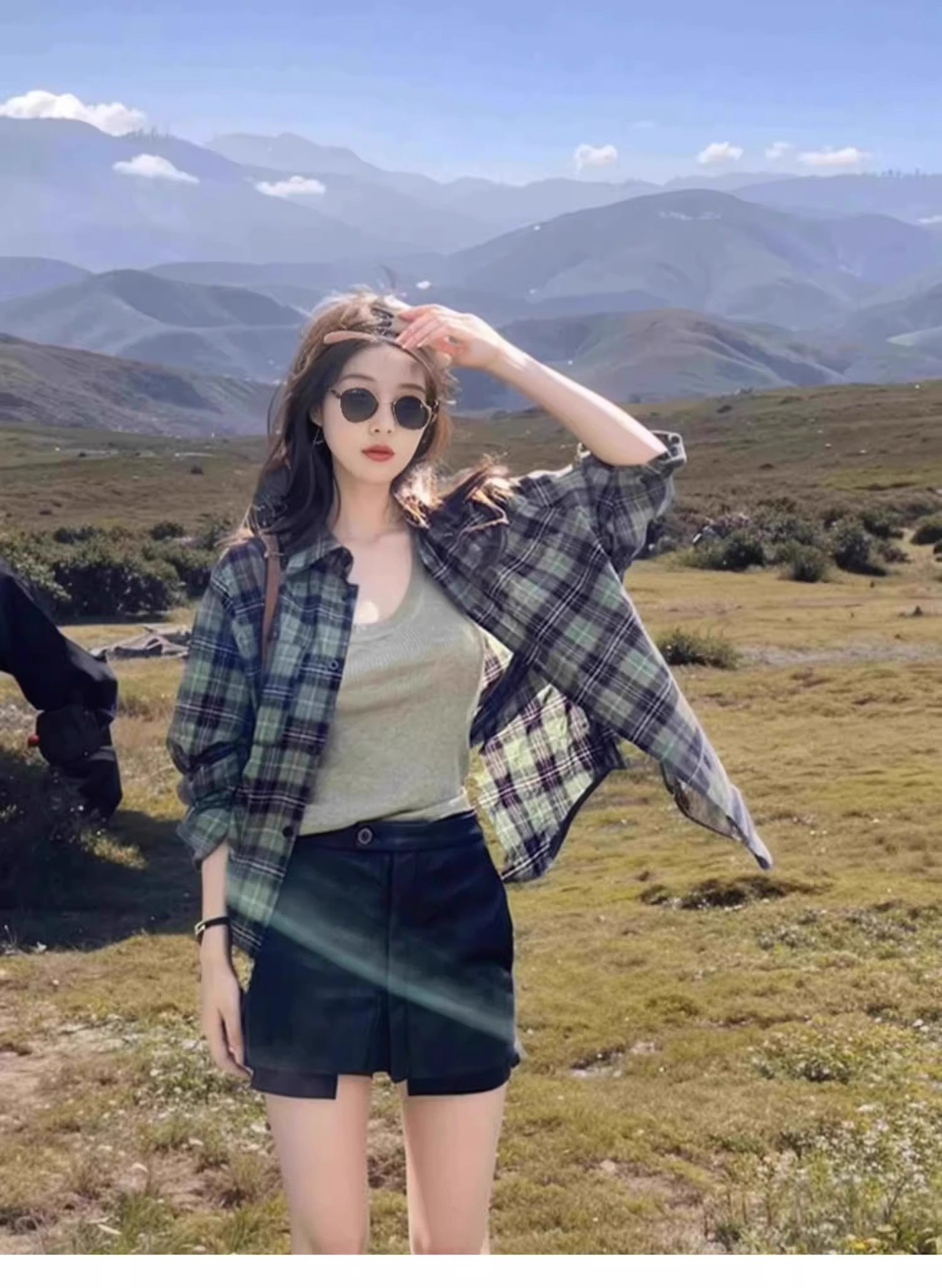 여성을위한 녹색 태양 보호 격자 무늬 셔츠 재킷 봄, 가을 새로운 캐주얼 루즈 여름 중간 길이 셔츠 탑 유행스토어 가기