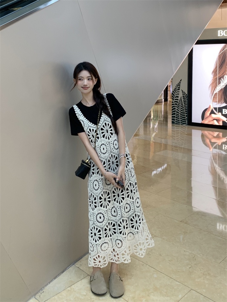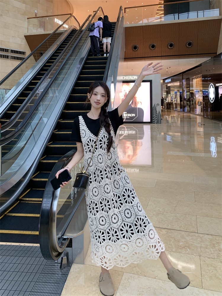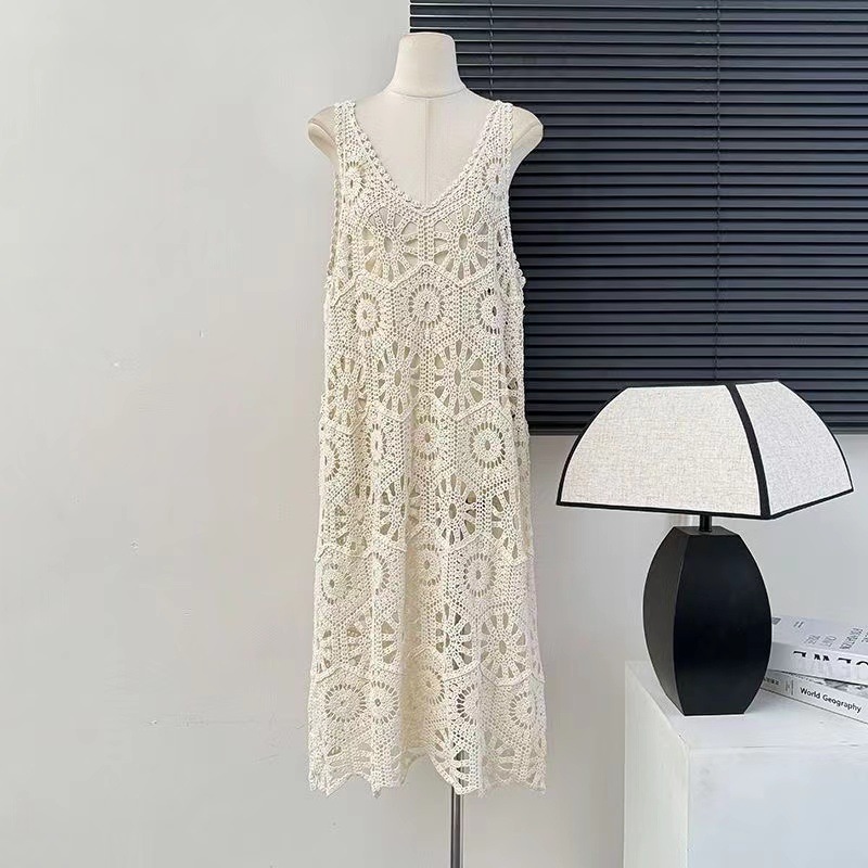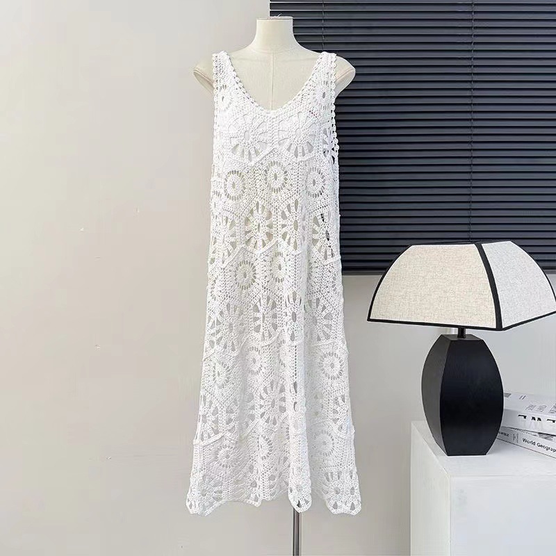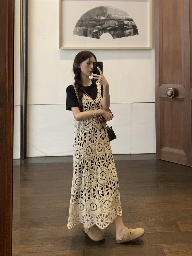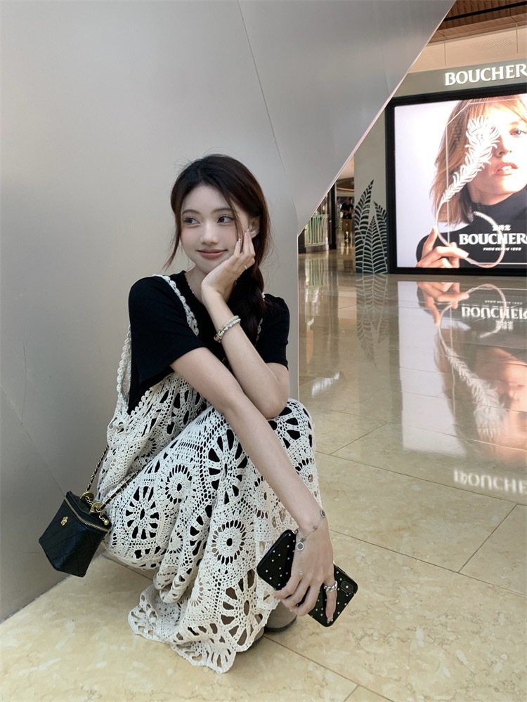 보헤미안 에스닉 스타일 중간 길이 드레스 중공 라운드 넥 중공 자수 작은 서스펜더 스커트 여성용 서스펜더 스커트스토어 가기