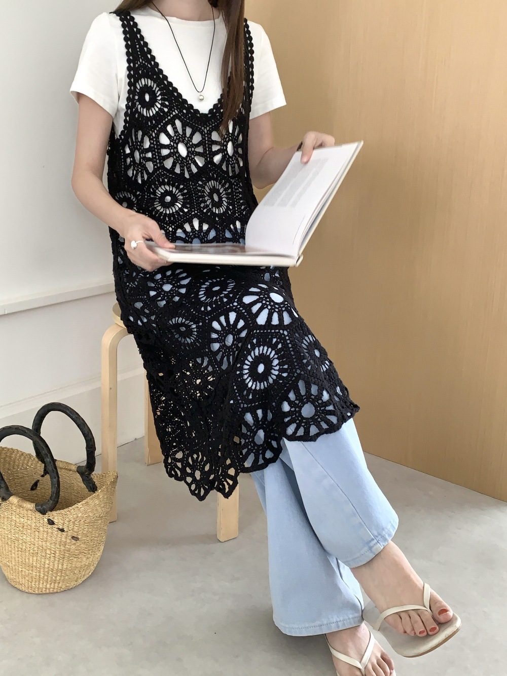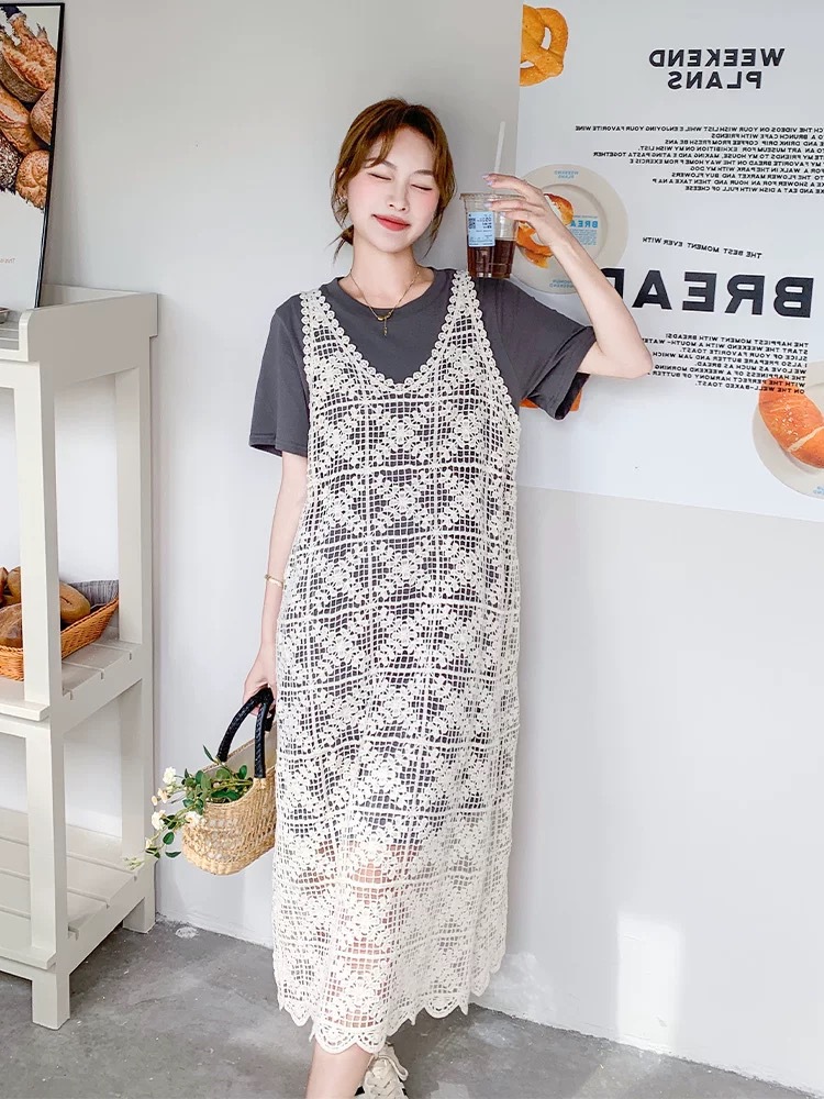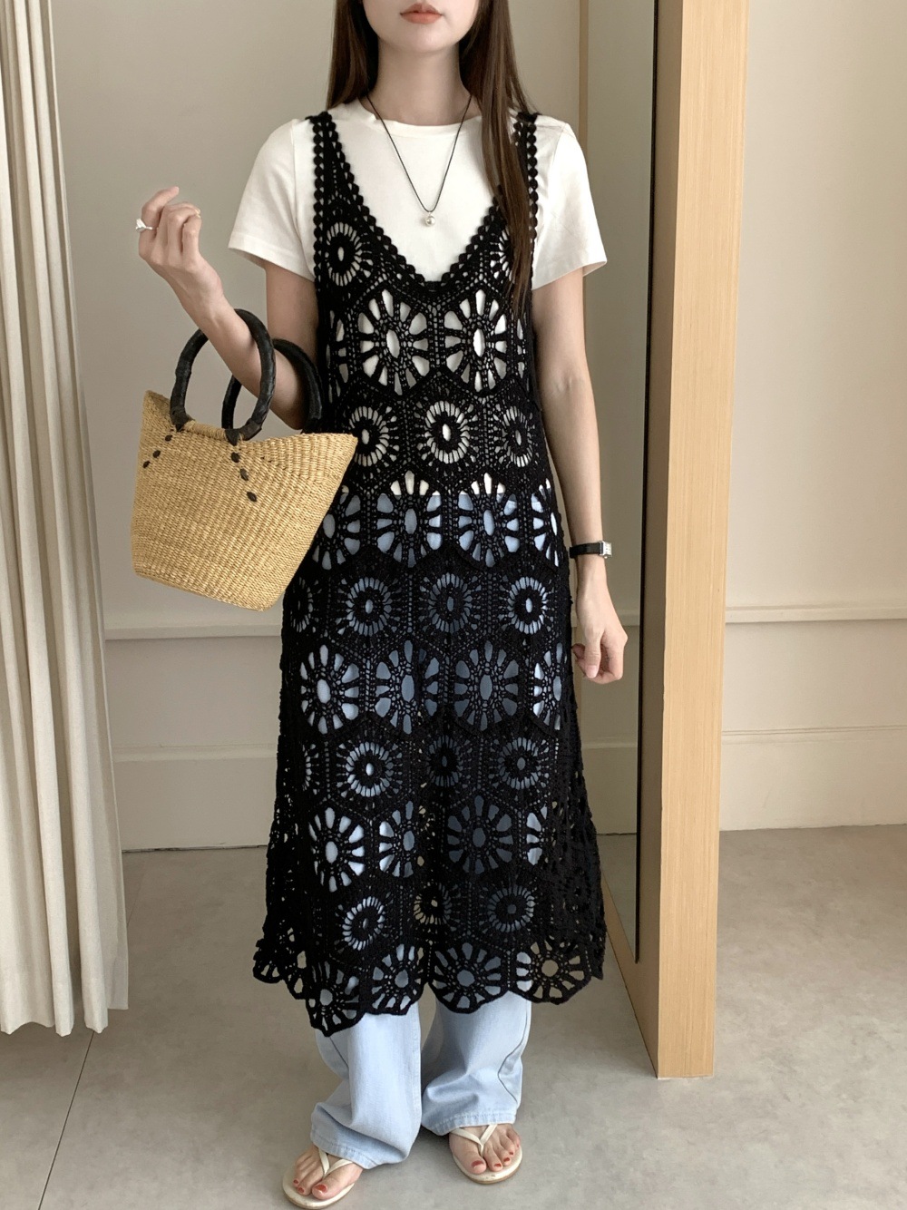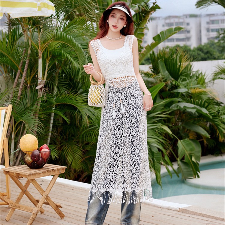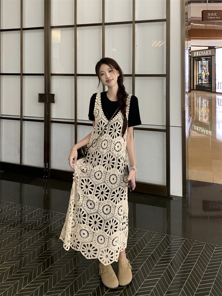 보헤미안 에스닉 스타일 중간 길이 드레스 중공 라운드 넥 중공 자수 작은 서스펜더 스커트 여성용 서스펜더 스커트스토어 가기