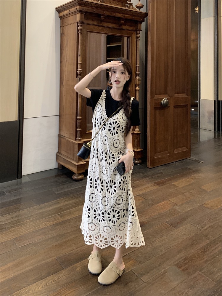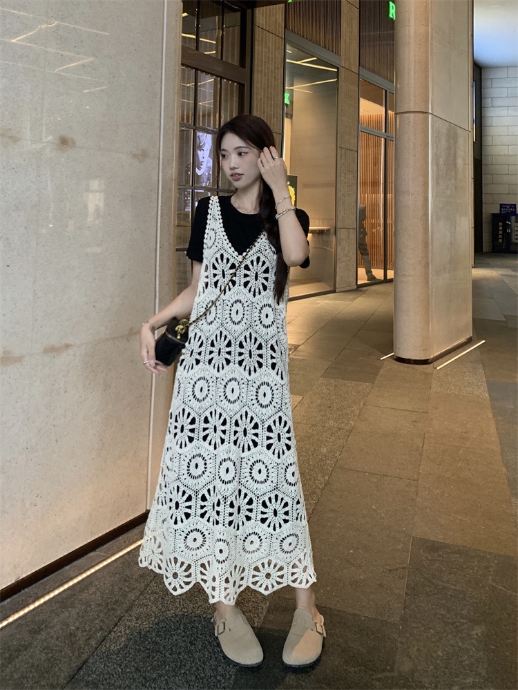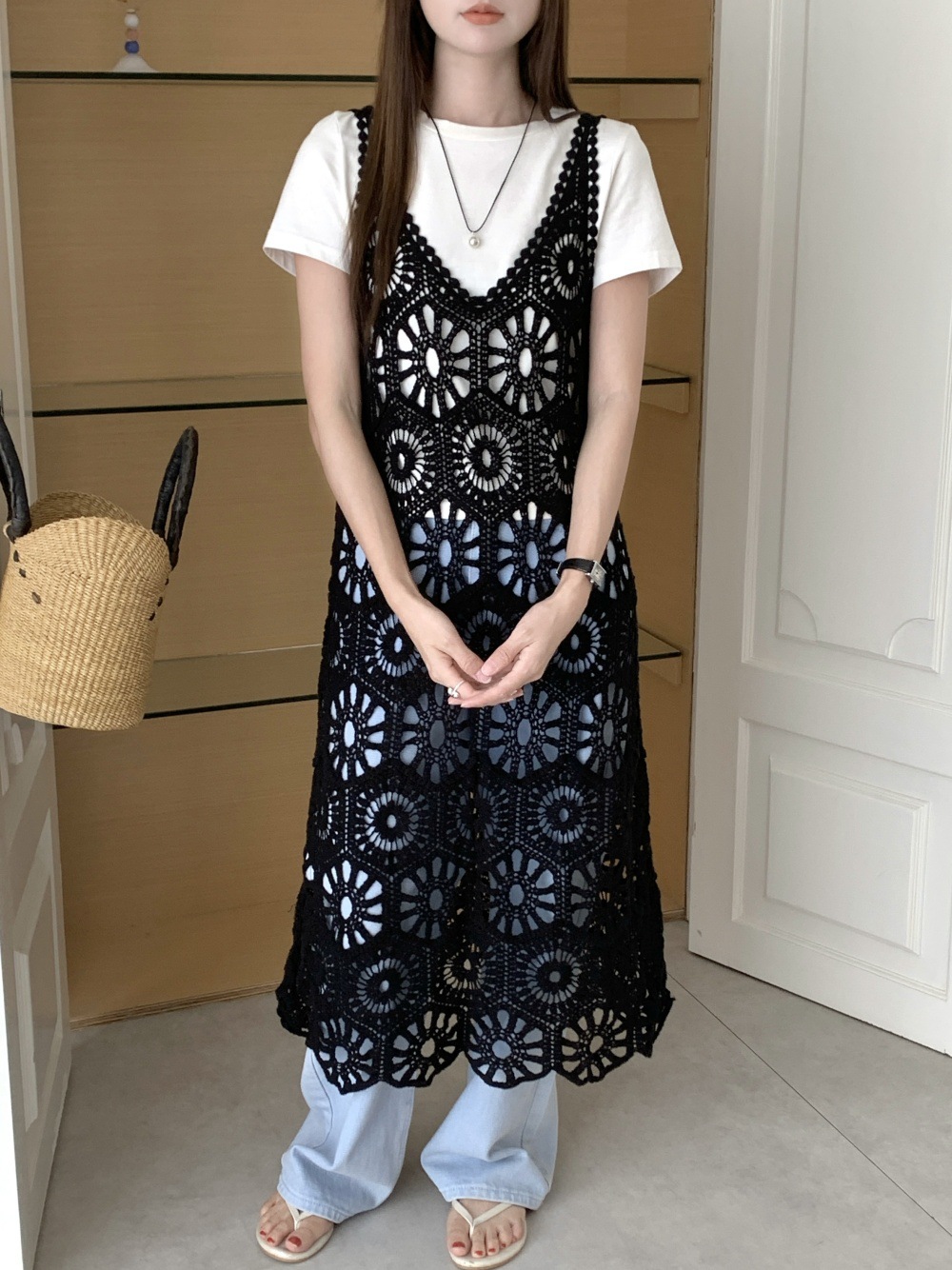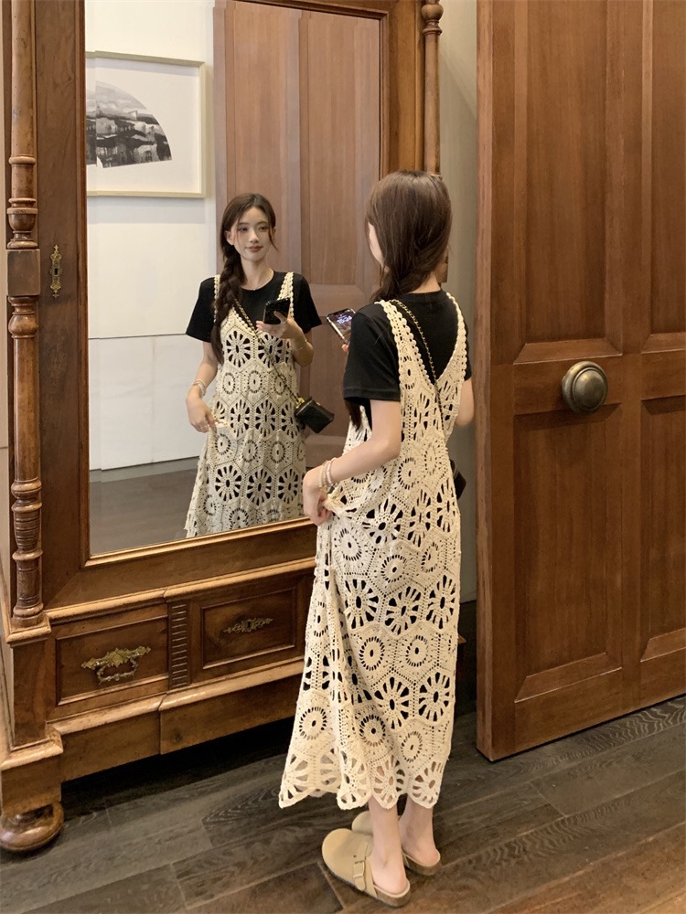 보헤미안 에스닉 스타일 중간 길이 드레스 중공 라운드 넥 중공 자수 작은 서스펜더 스커트 여성용 서스펜더 스커트