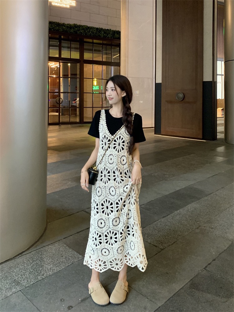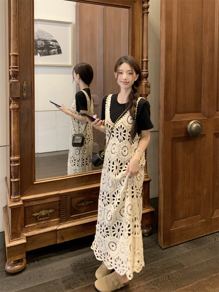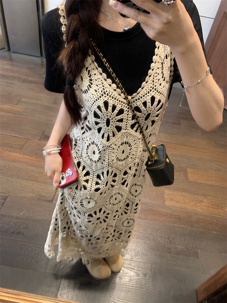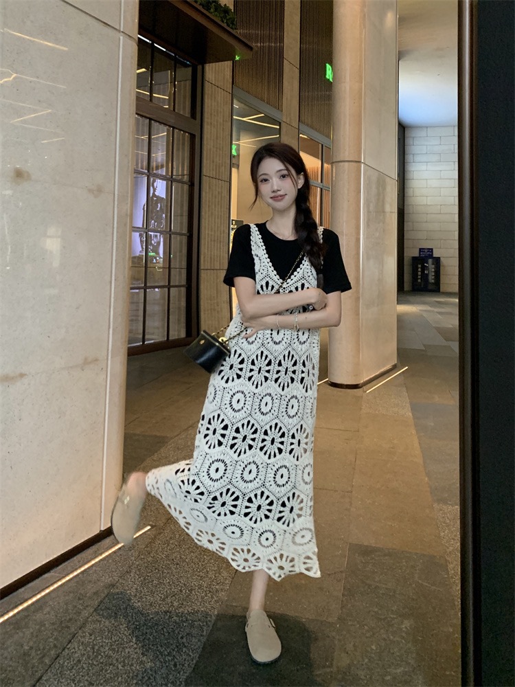 보헤미안 에스닉 스타일 중간 길이 드레스 중공 라운드 넥 중공 자수 작은 서스펜더 스커트 여성용 서스펜더 스커트
