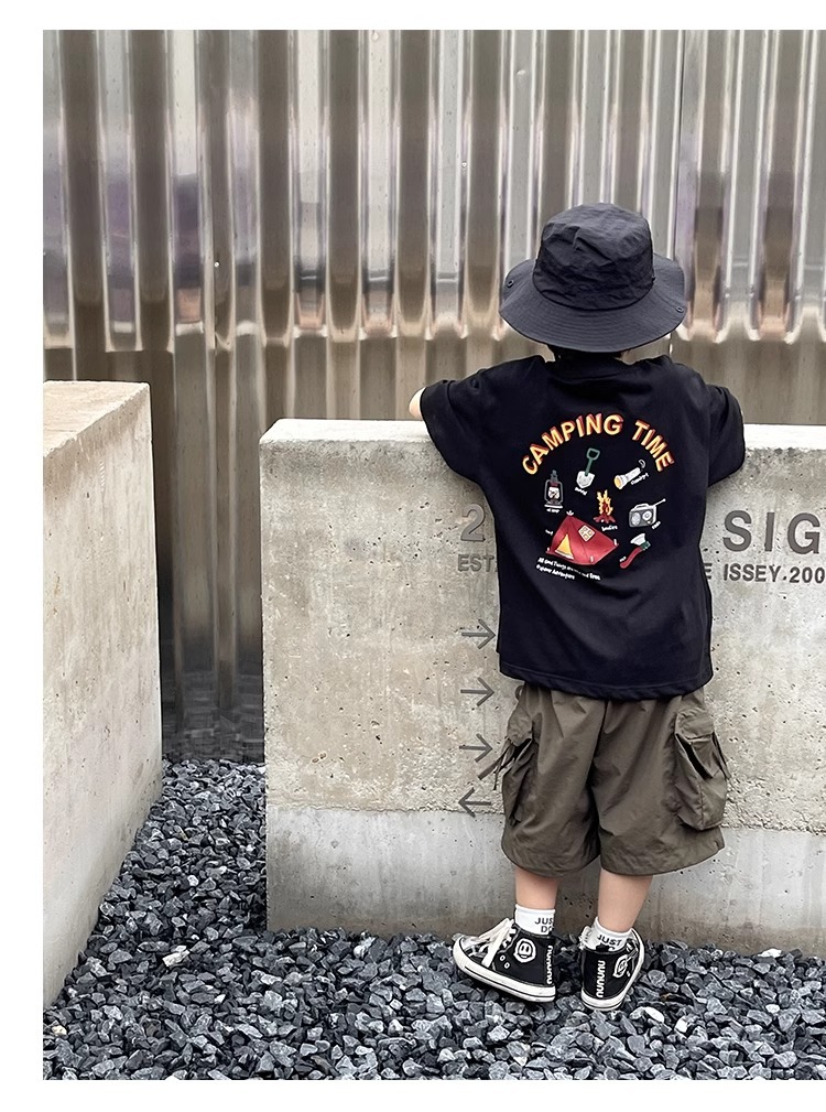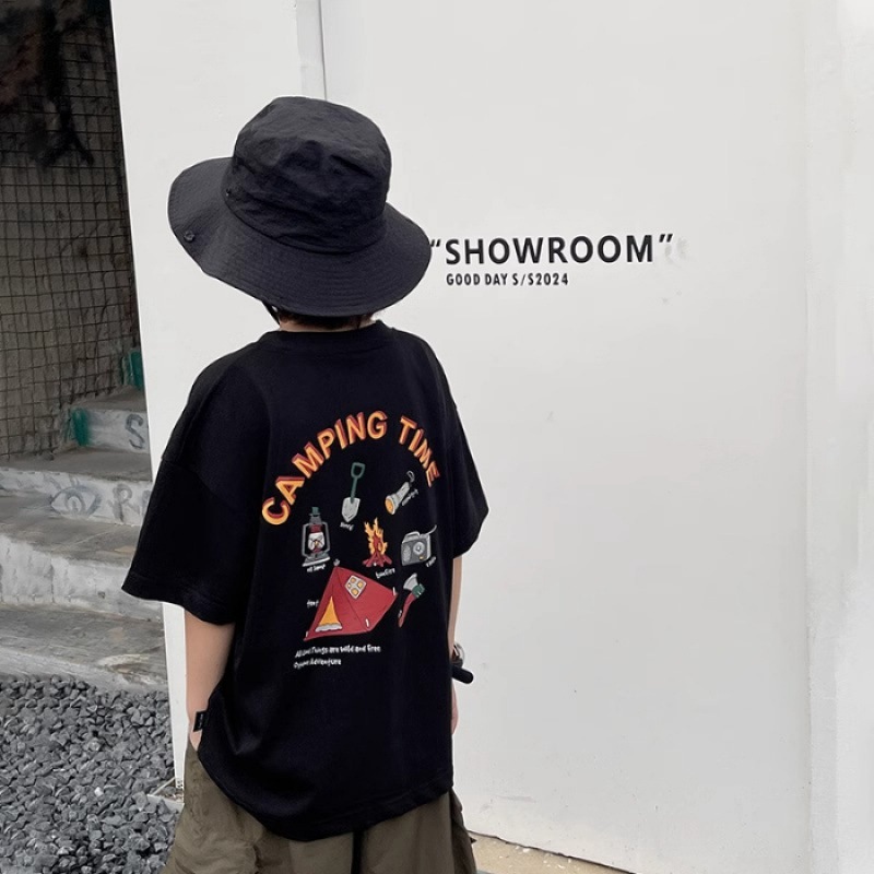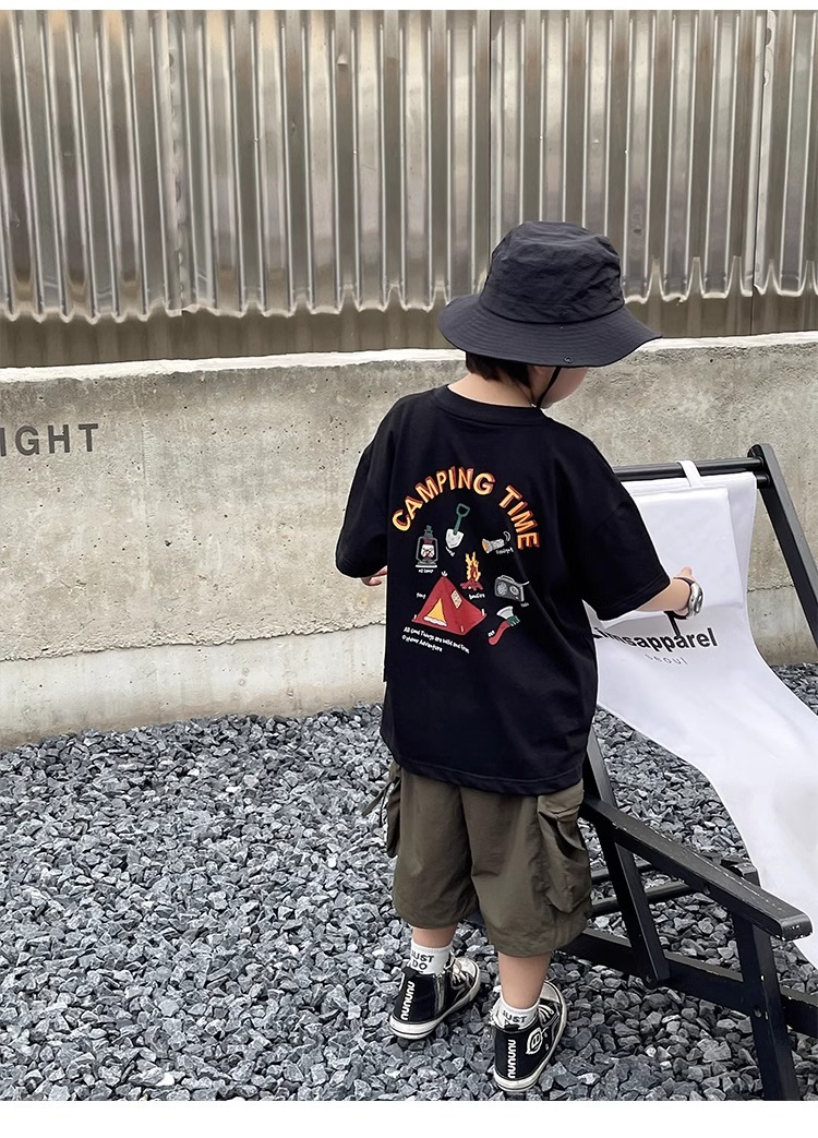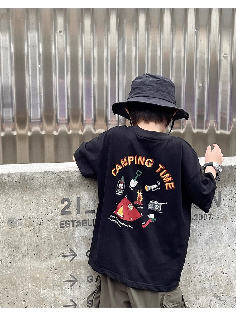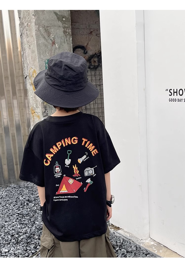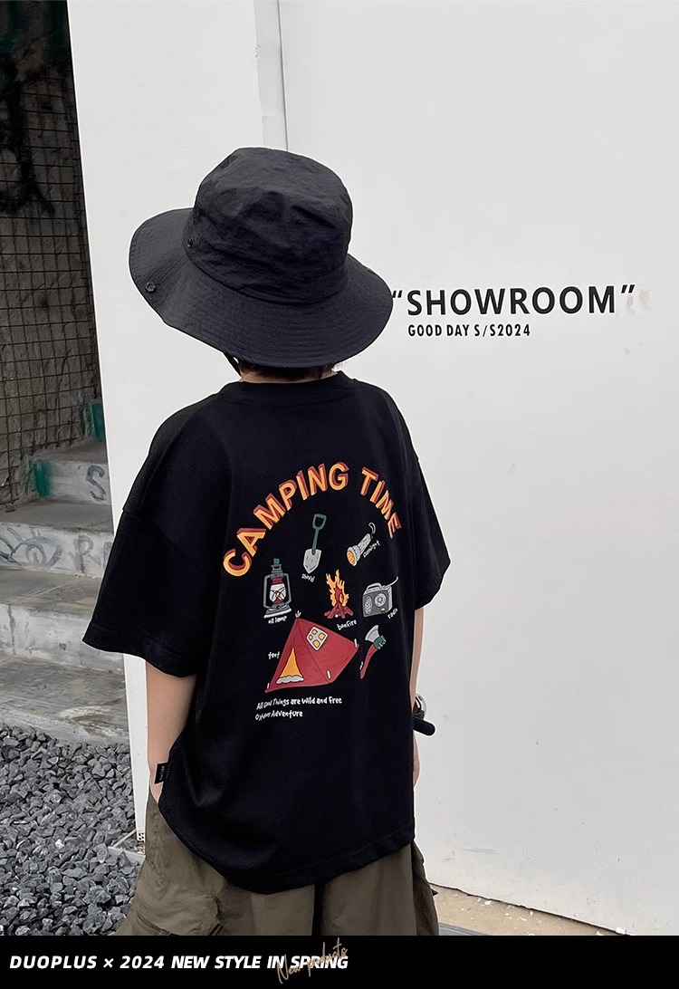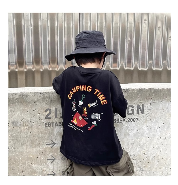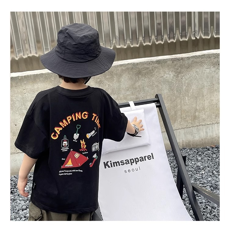 면 아동복 소년 캠핑 반팔 티셔츠 2024 새로운 어린이 반소매 아기의 여름 스타일 인쇄 탑스토어 가기