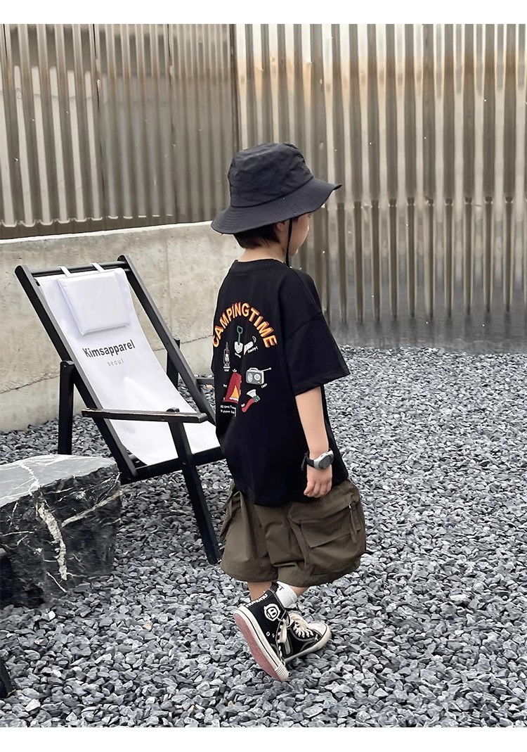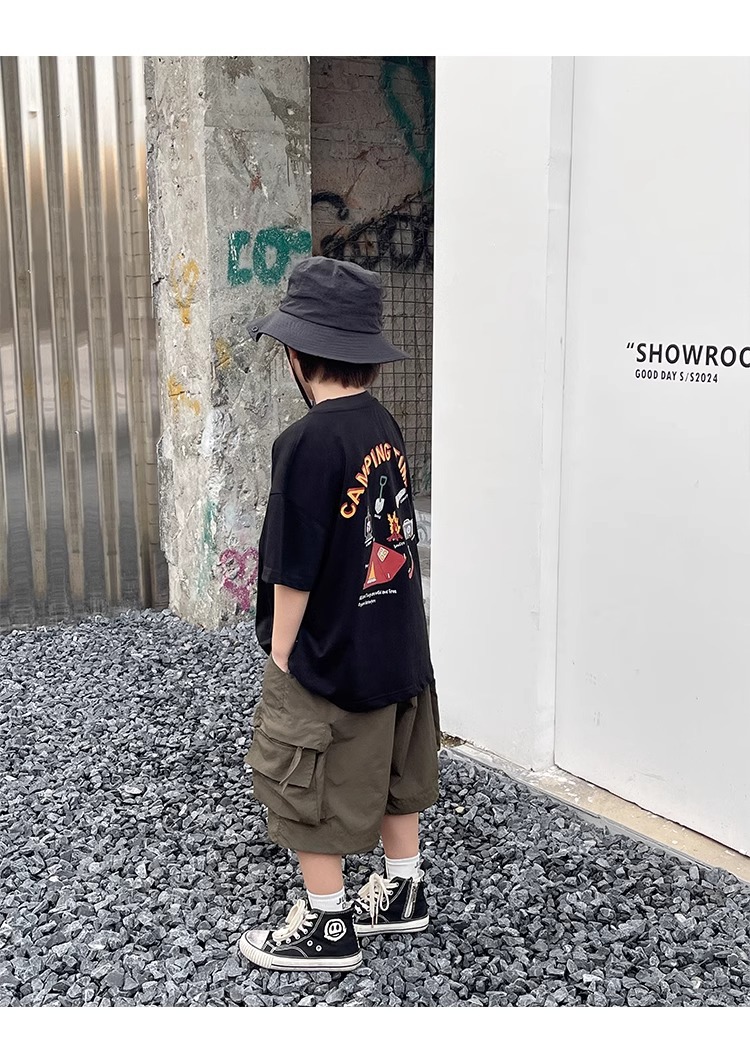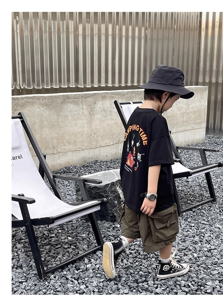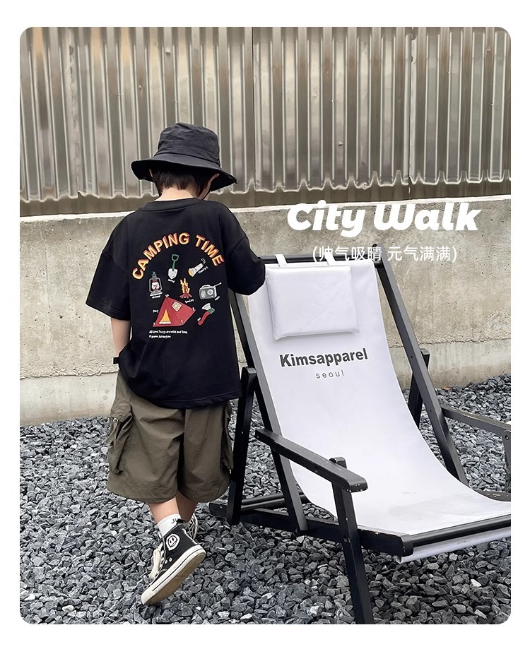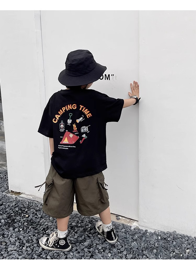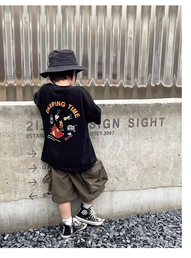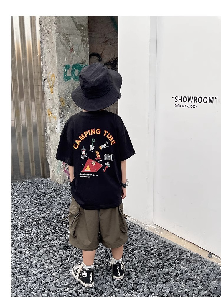면 아동복 소년 캠핑 반팔 티셔츠 2024 새로운 어린이 반소매 아기의 여름 스타일 인쇄 탑스토어 가기