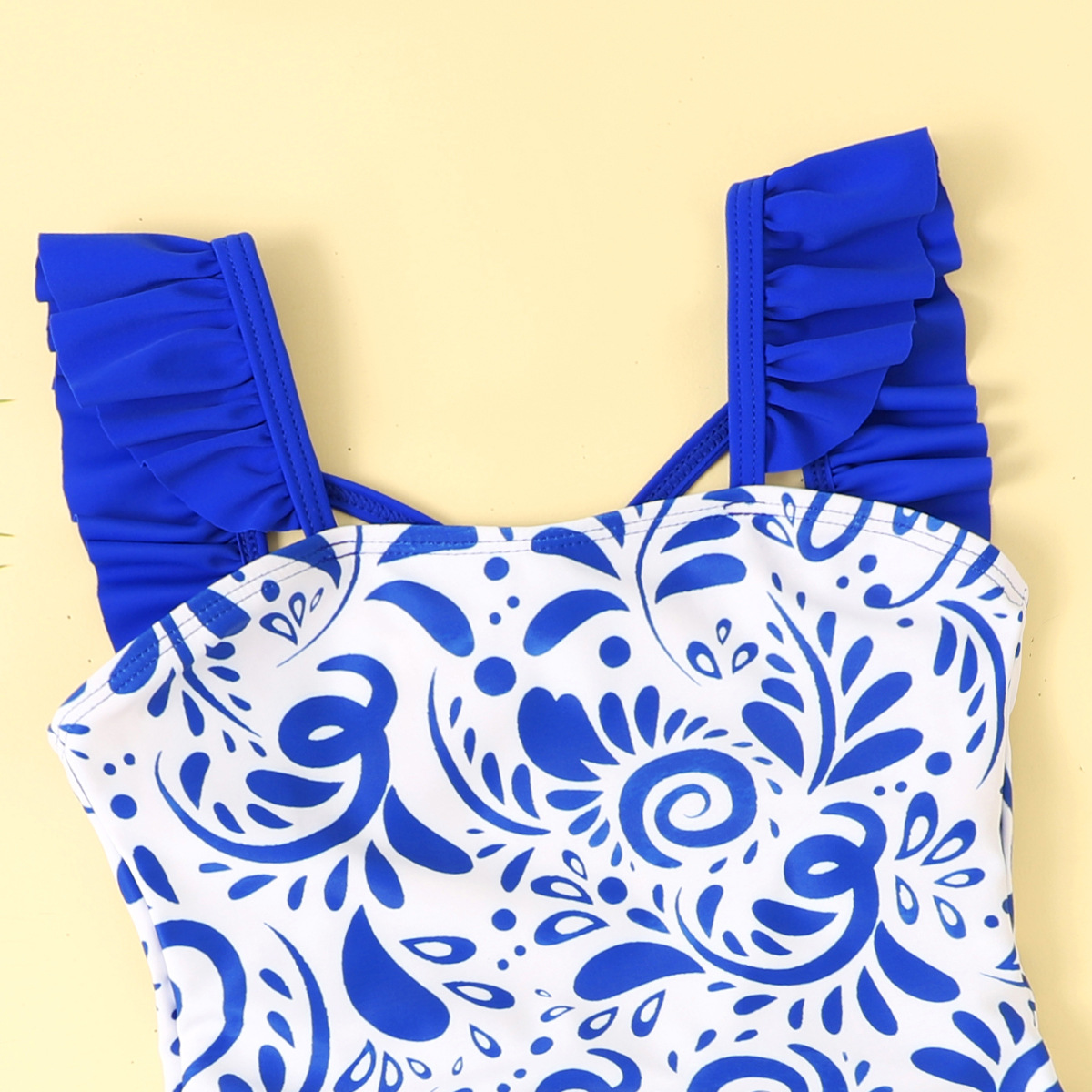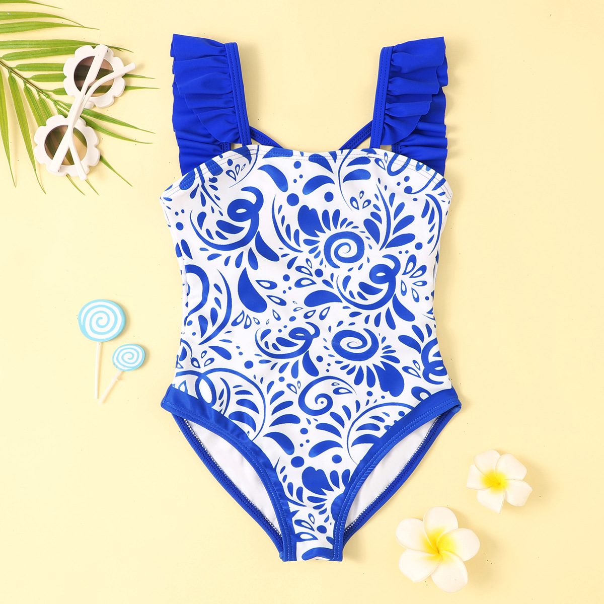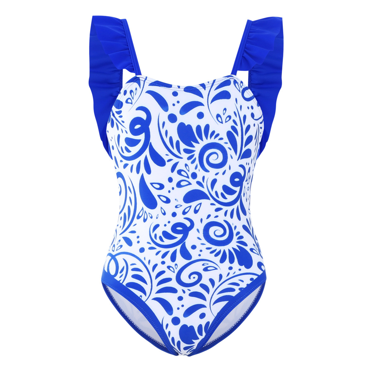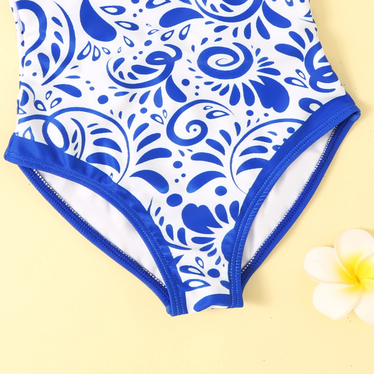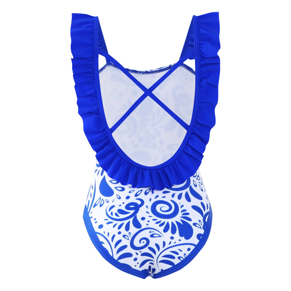 파란색과 흰색 도자기 대외 무역 어린이 수영복 유럽과 미국의 러플 백 국경 간 비키니스토어 가기