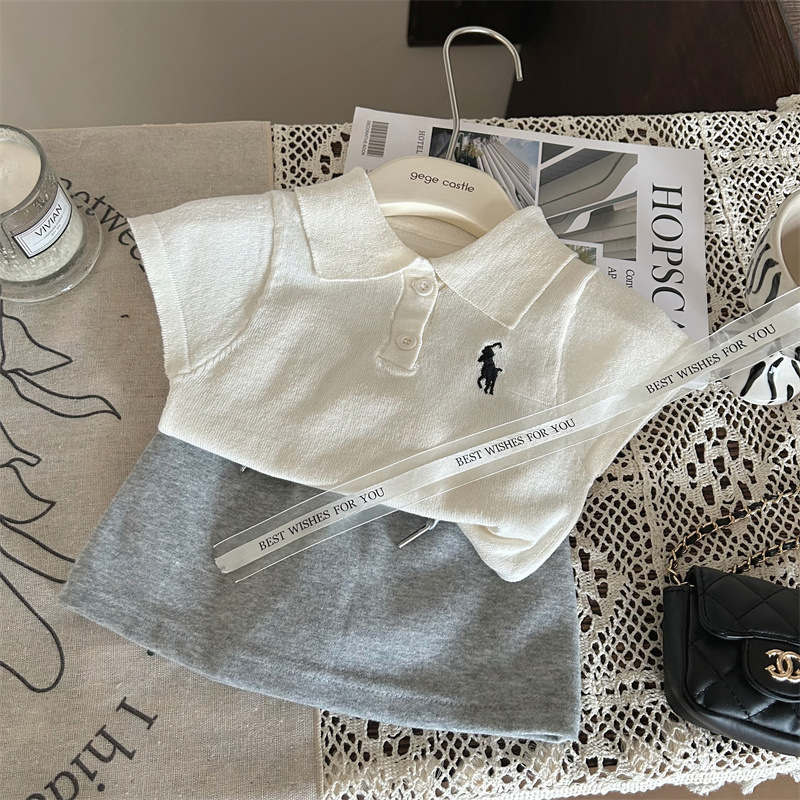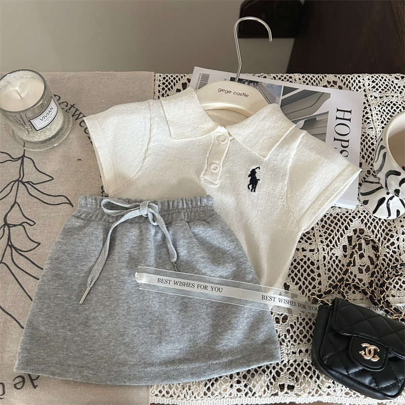 한국판 아동복 2026년 신상 여름 여아 니트 폴로셔츠 반팔 티셔츠 다용도 그레이 스커트 팬츠 투피스 세트