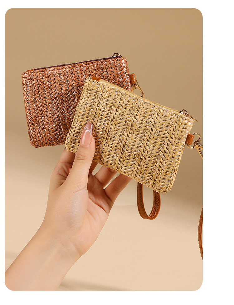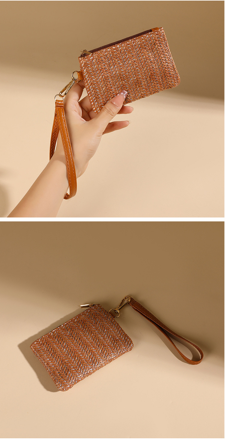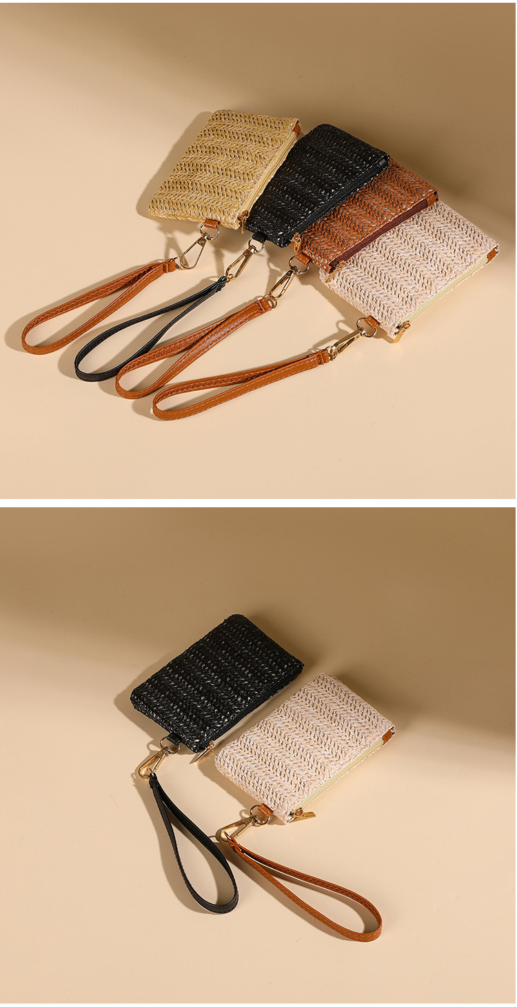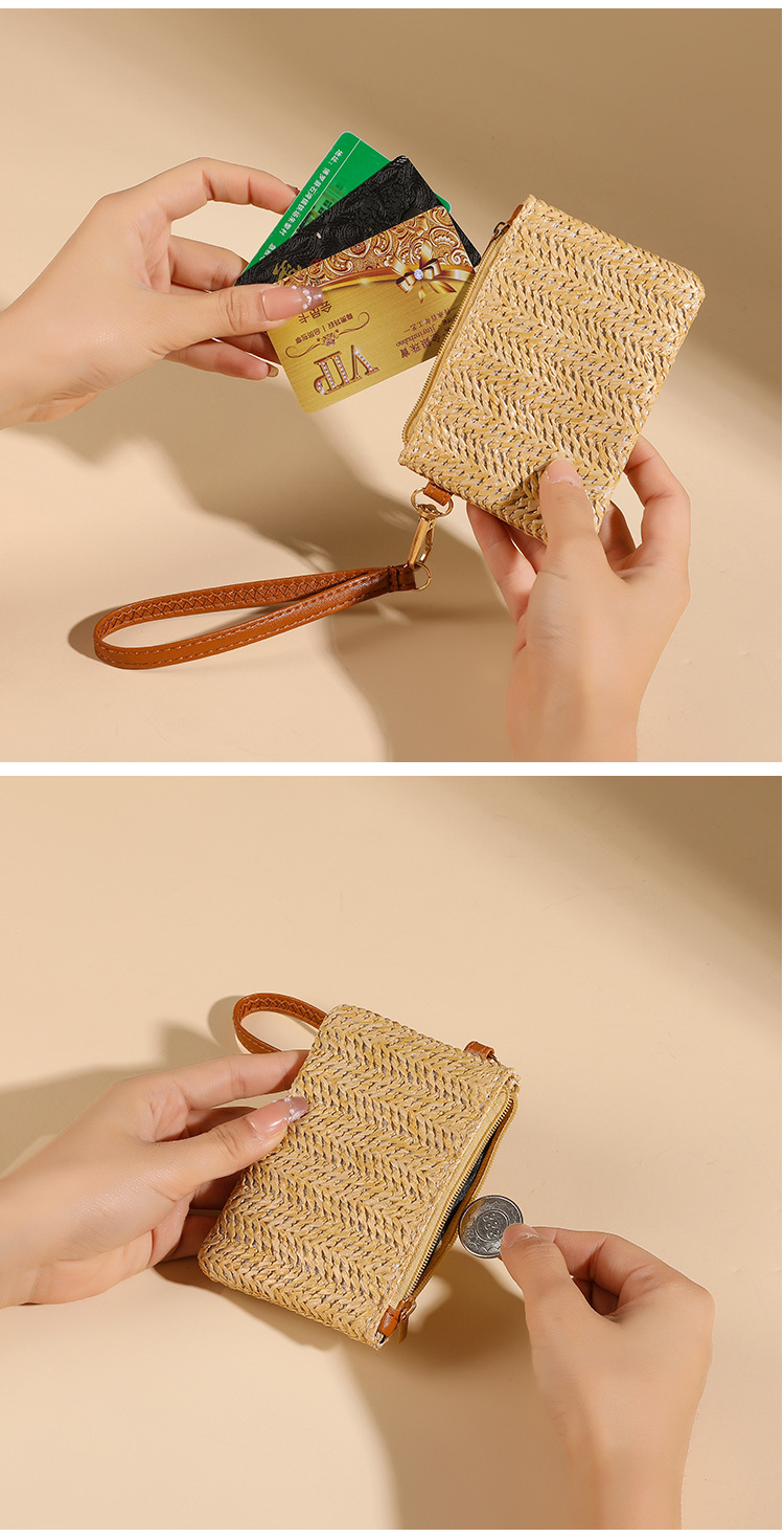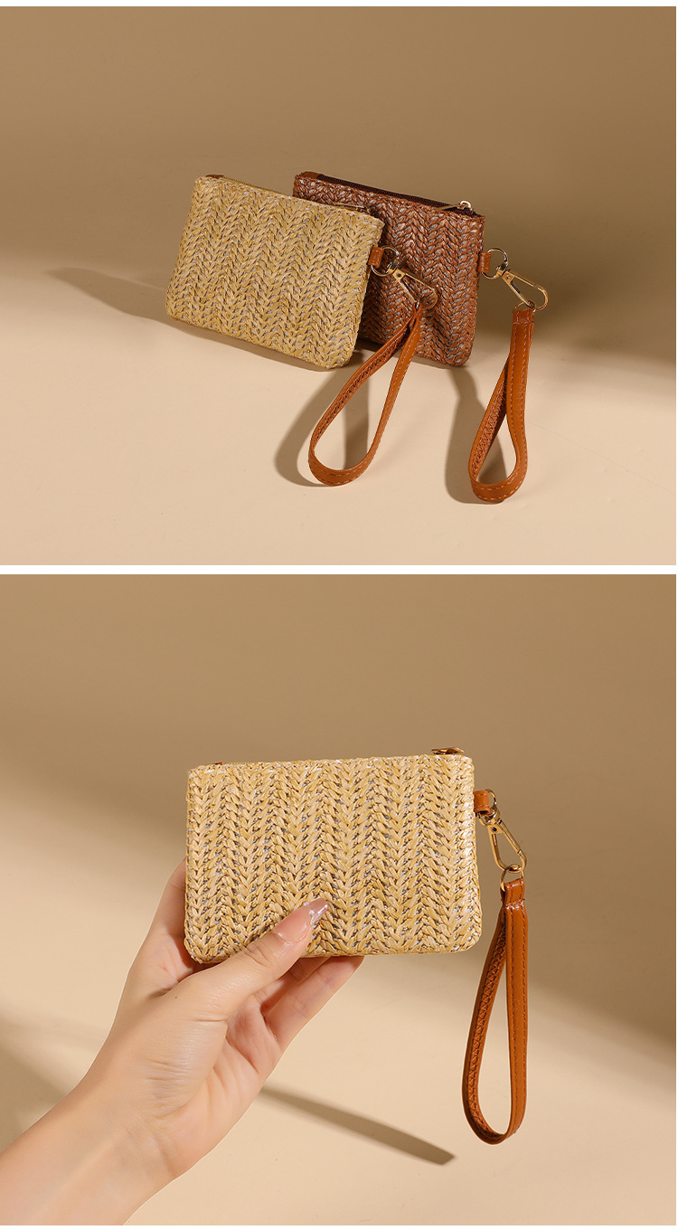 여름용 레트로 스타일 인조 밀짚 동전 지갑 여성용 탈부착 가능한 손목 스트랩 통기성 초경량 카드 및 동전 수납 가방스토어 가기