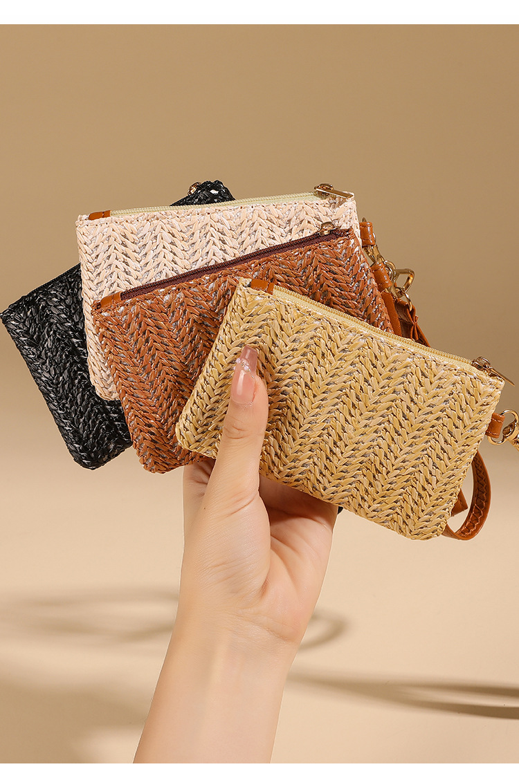 여름용 레트로 스타일 인조 밀짚 동전 지갑 여성용 탈부착 가능한 손목 스트랩 통기성 초경량 카드 및 동전 수납 가방