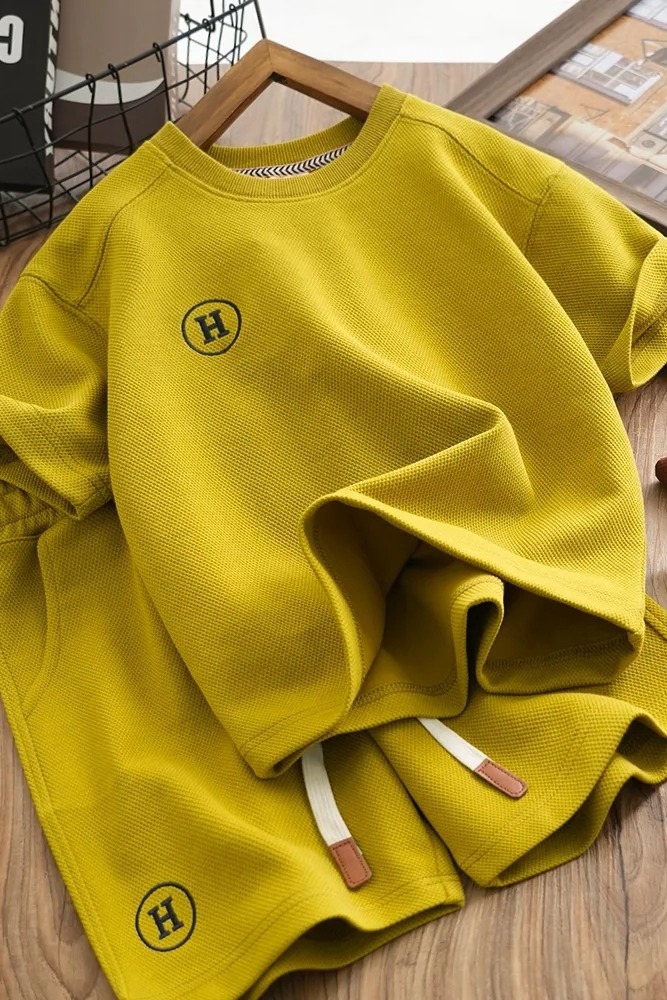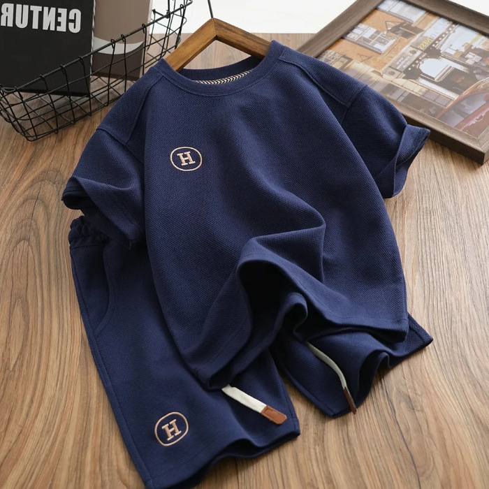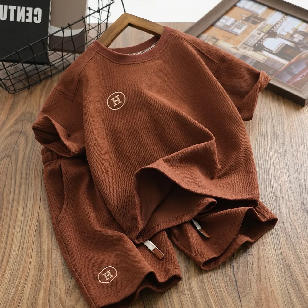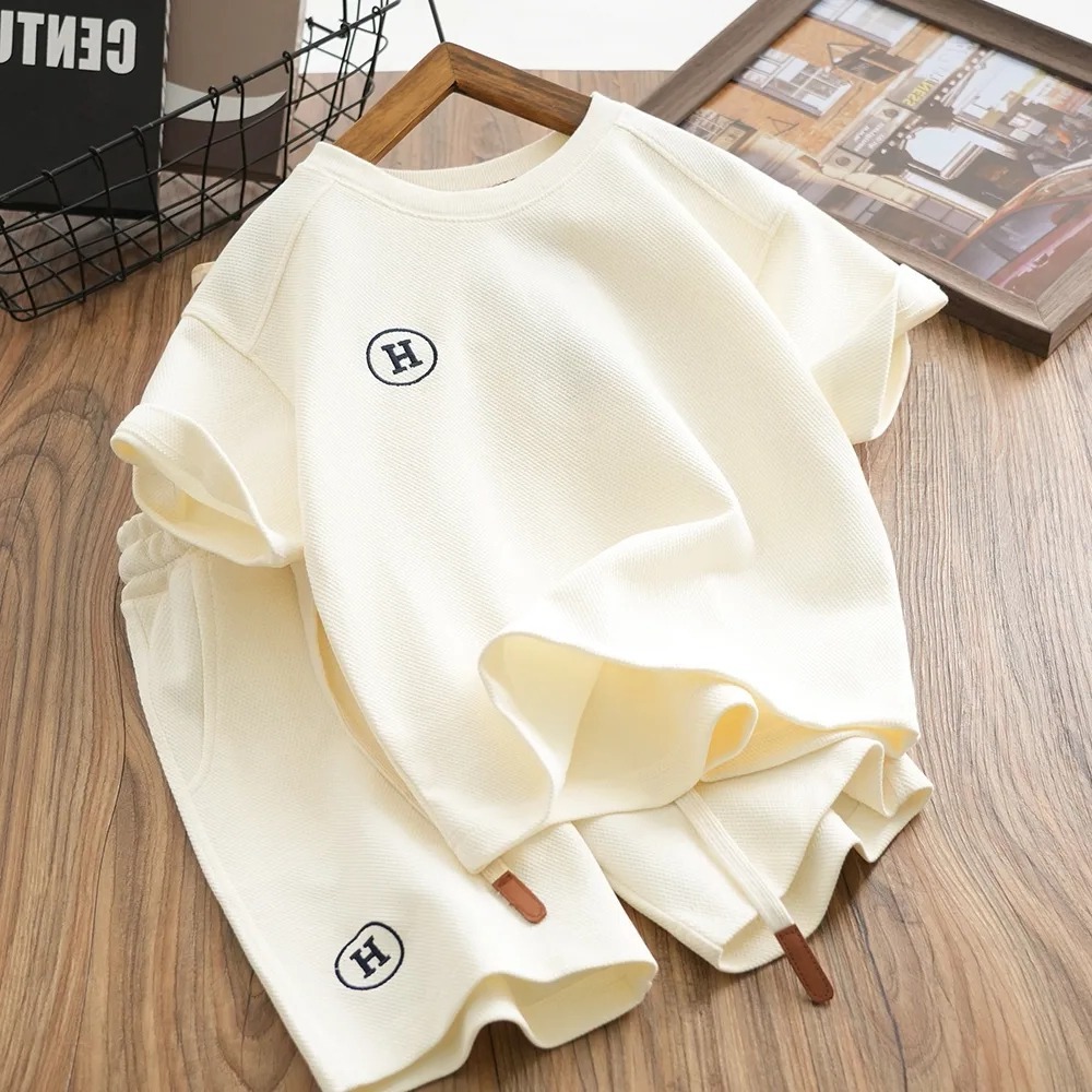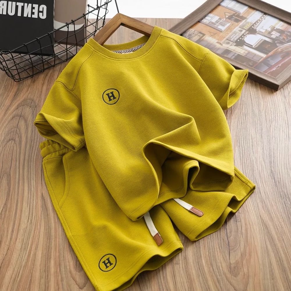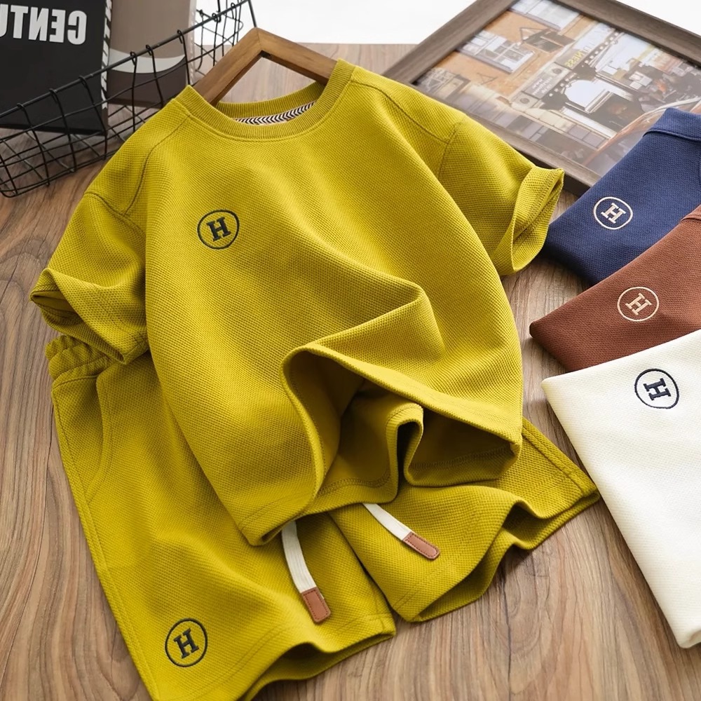 소년 와플 세트 여름 반팔 반바지 2024 새로운 어린이 세련된 유행 투피스 세트스토어 가기