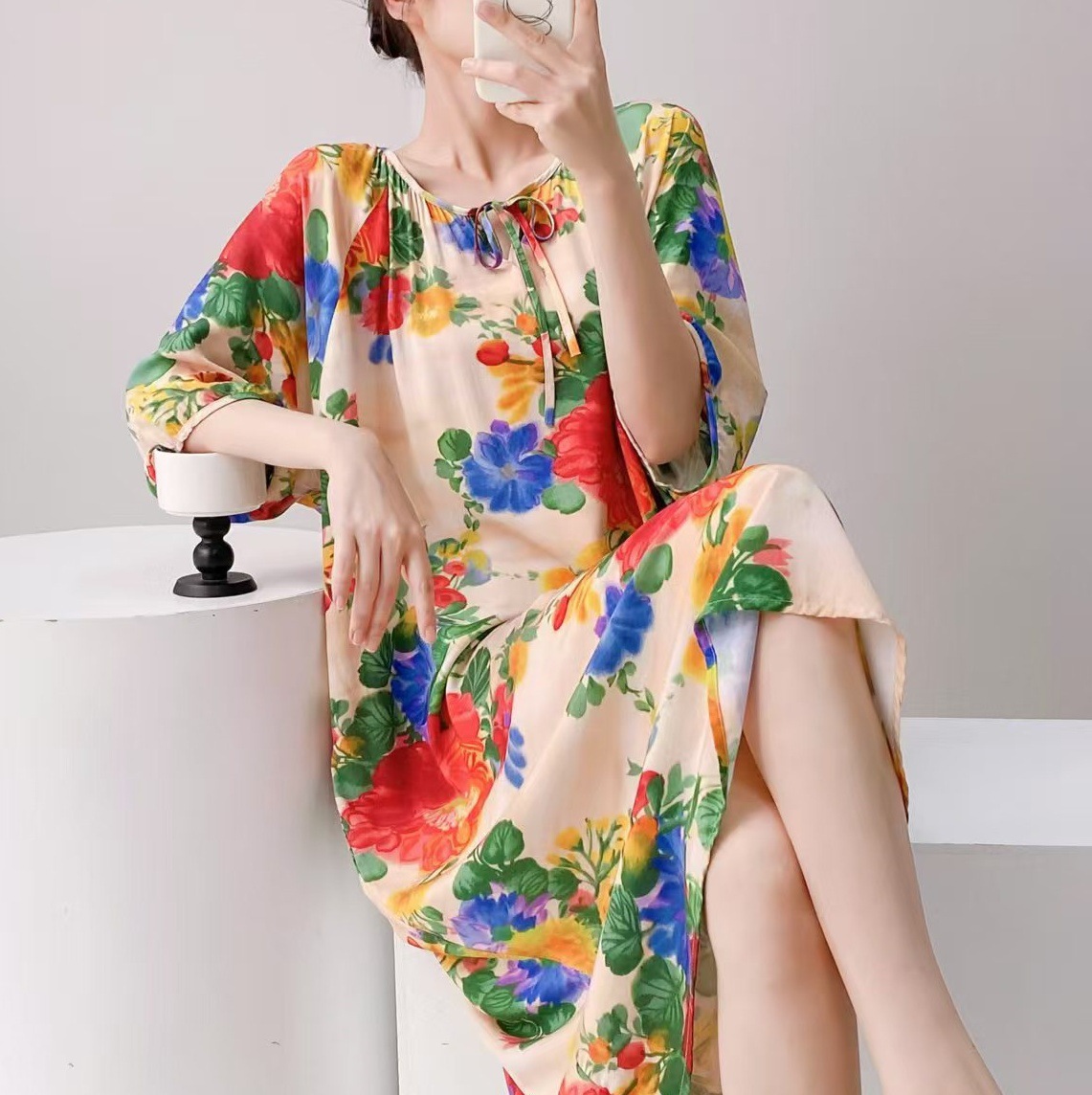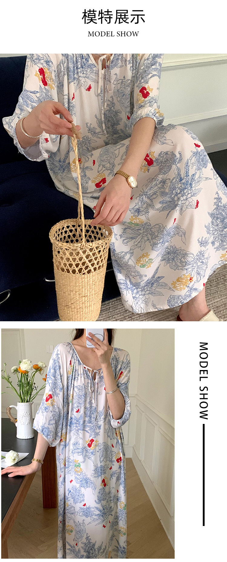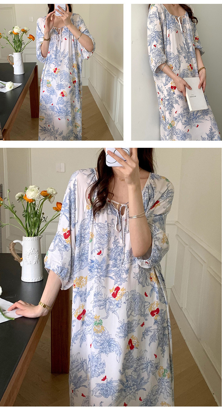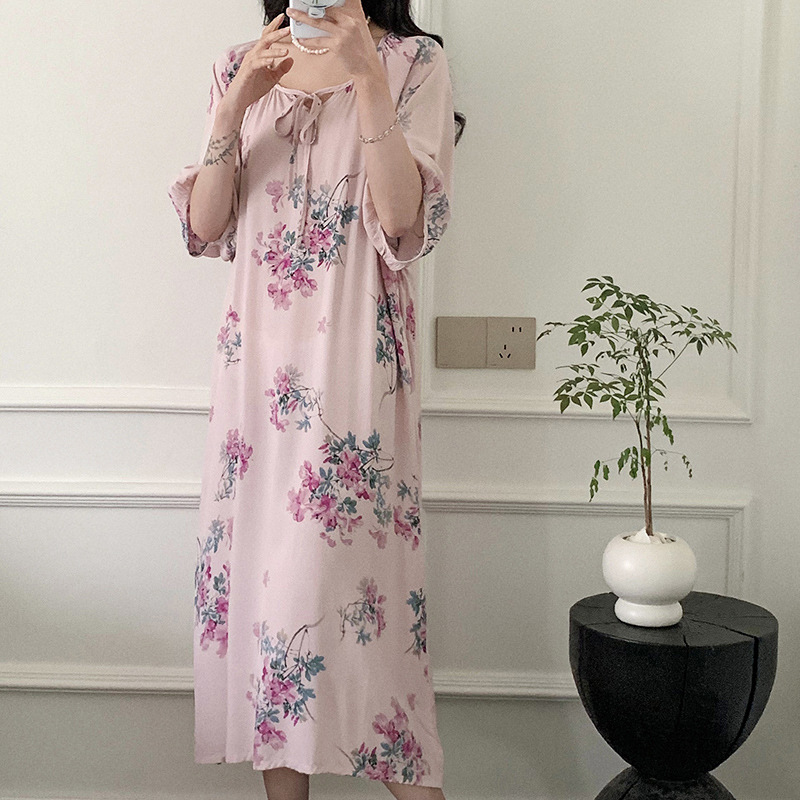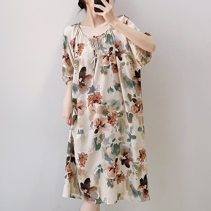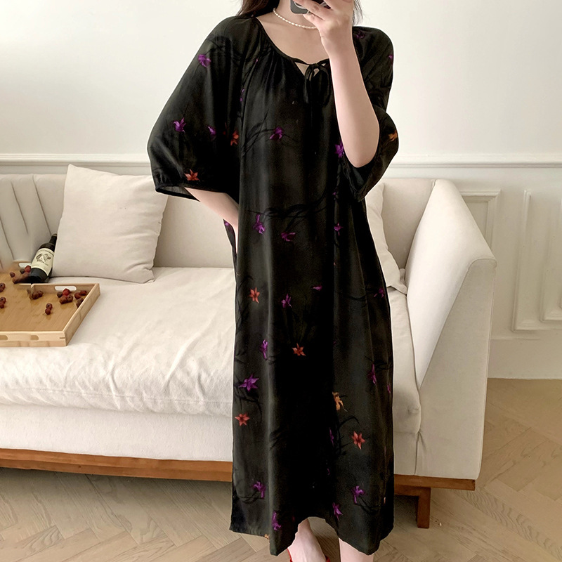 2024 새로운 국립 스타일 잠옷 여성 여름 해변 휴가를위한 우아한 하이 엔드 코튼 실크 잠옷 새로운 중국 스타일 코튼 실크 긴 원피스