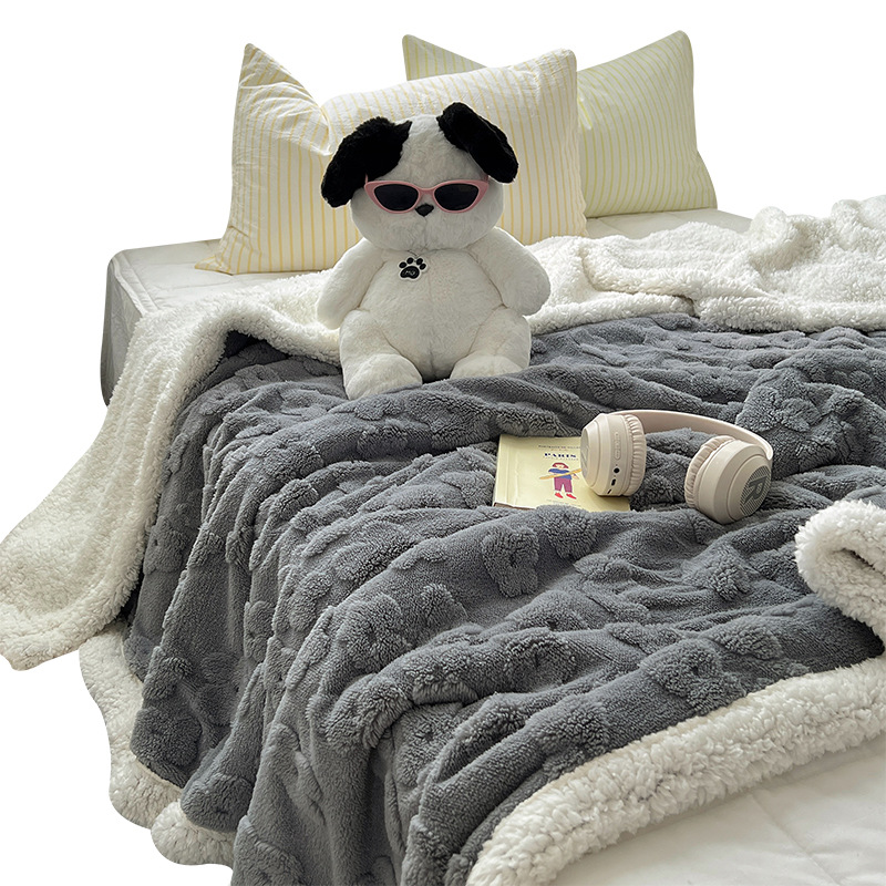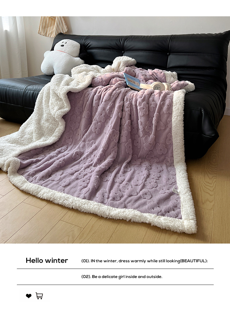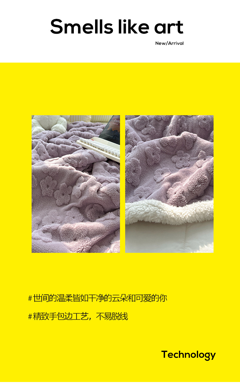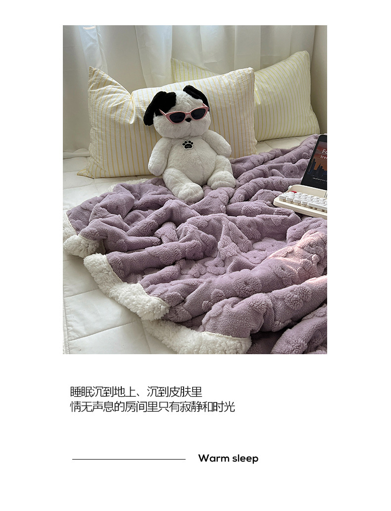 关于介绍:本款面料正面选用220g立体剪花舒棉绒面料,犹如拥有云朵般柔软,软软糯糯。反面选用200g羊羔绒面料,绒毛细腻密集且蓬松保暖!精致手包边工艺,不易脱线、不掉毛!