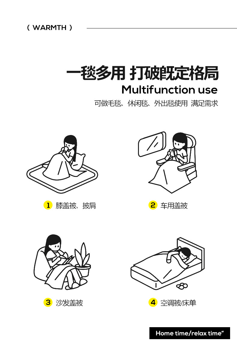 用途:一毯多用!可用于午休毯、披肩毯、膝盖毯、旅行毯、宝宝毯、空调毯!